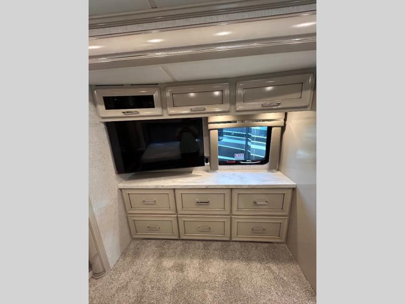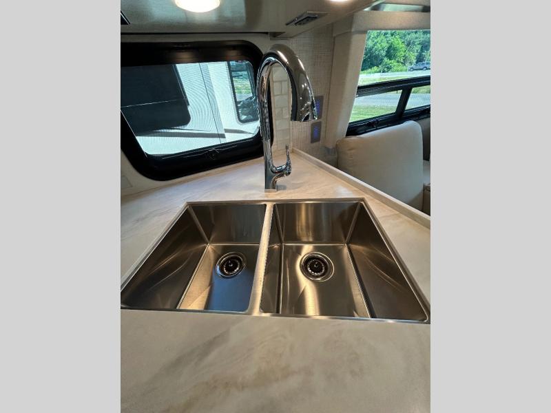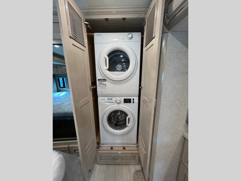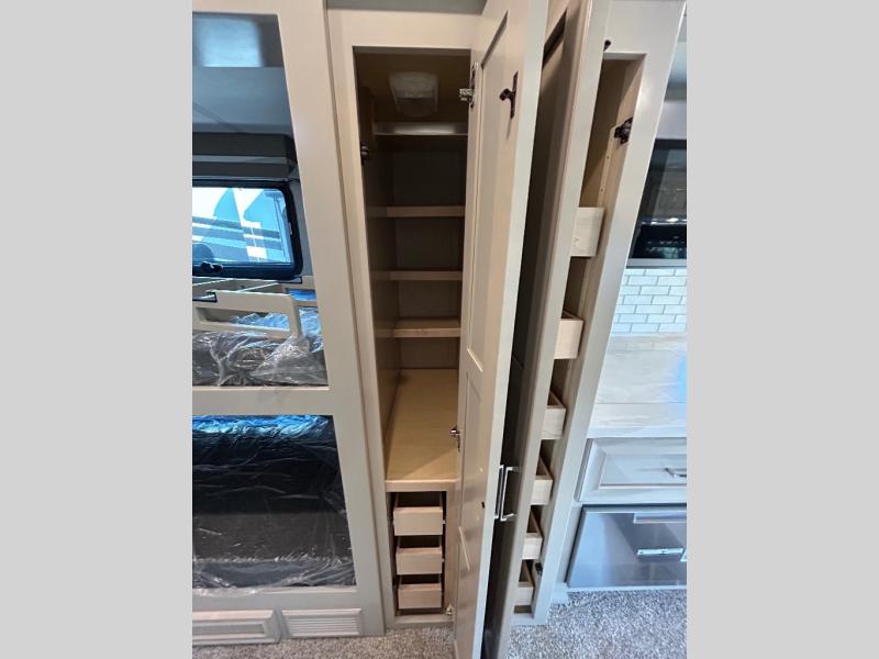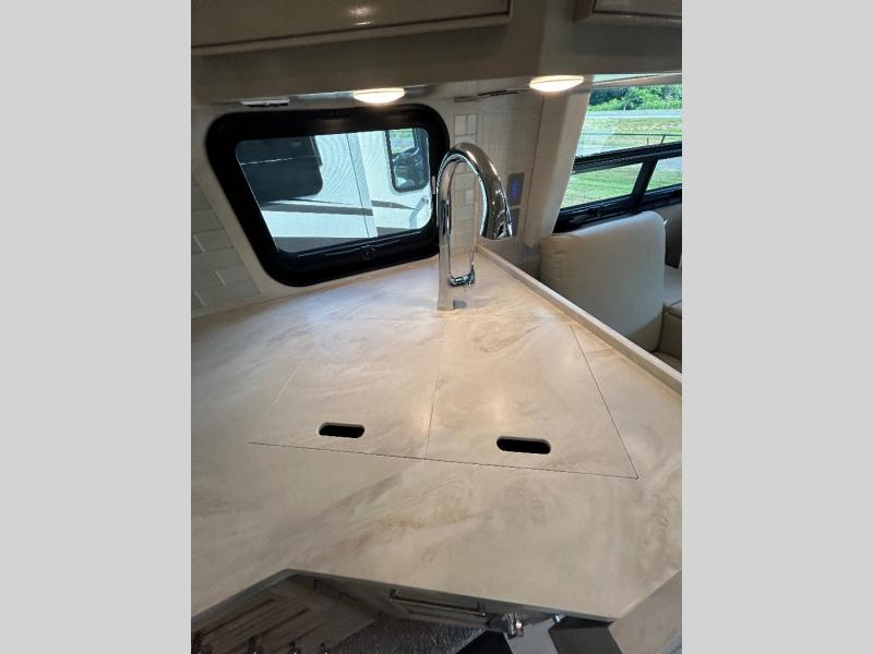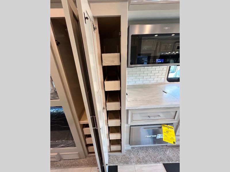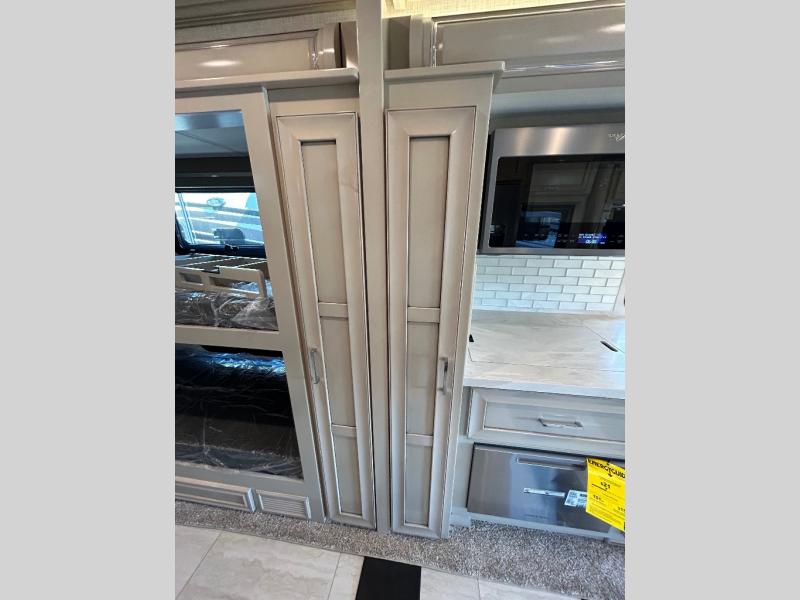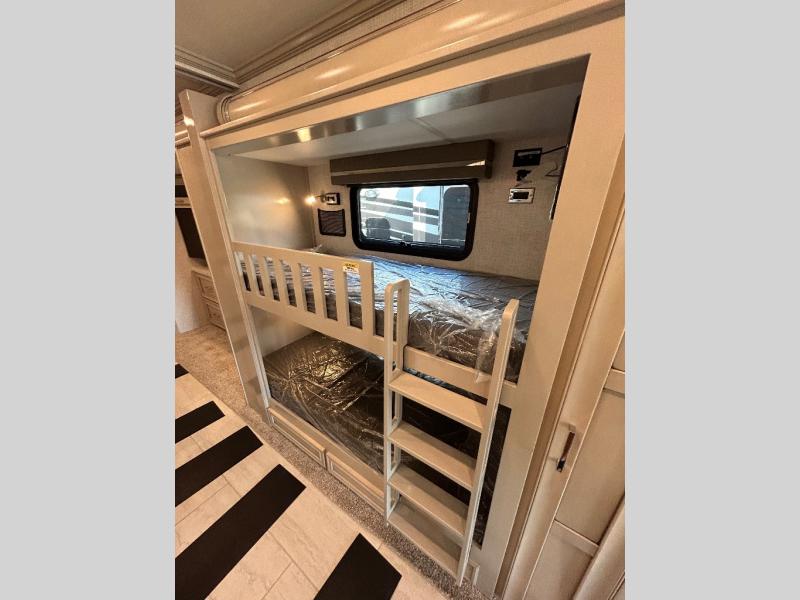 You may want to invite some friends to join you for a weekend of fun in this Super Star Super C diesel motorhome, or you may just want to make it a family event since the bunk beds will be perfect for the kids! Either way, this coach is well equipped for partying. The kitchen is top notch and ready for any chef to step in and create masterful dishes with the all-electric flush-mount induction cooktop, and 19.7-cubic foot refrigerator. The bathroom is full of amenities that will make morning routines as easy as ever, and the private bedroom has a king bed, Samsung LED 4K TV, large dresser, and wardrobe with sliding mirror doors so that you feel right at home.