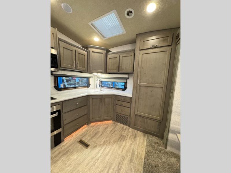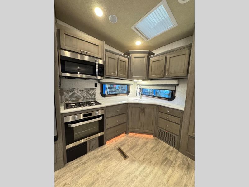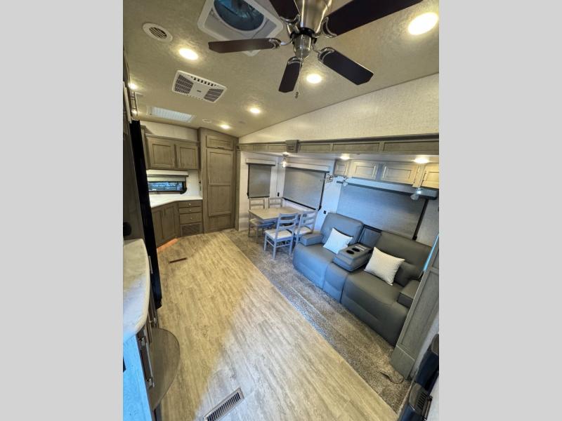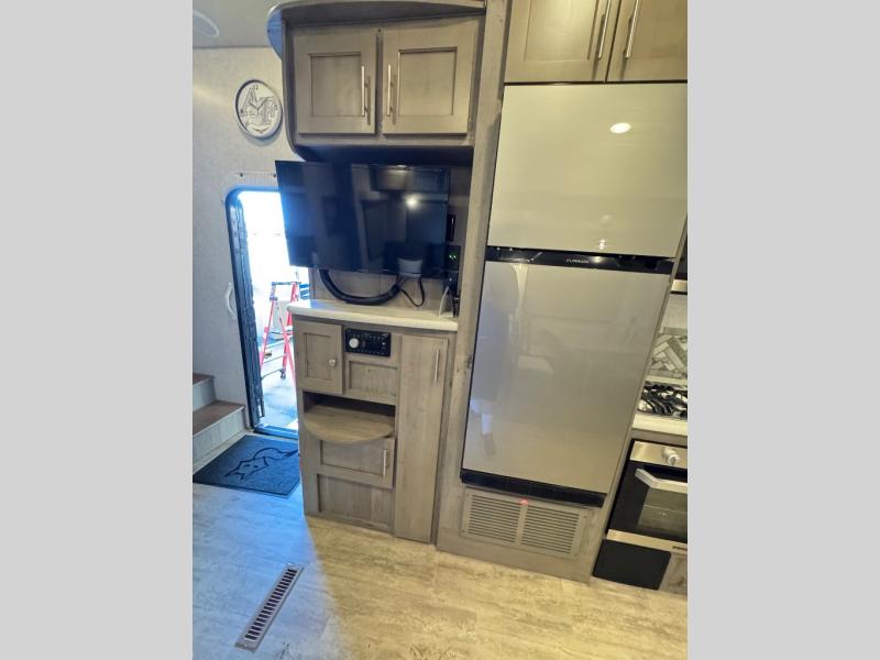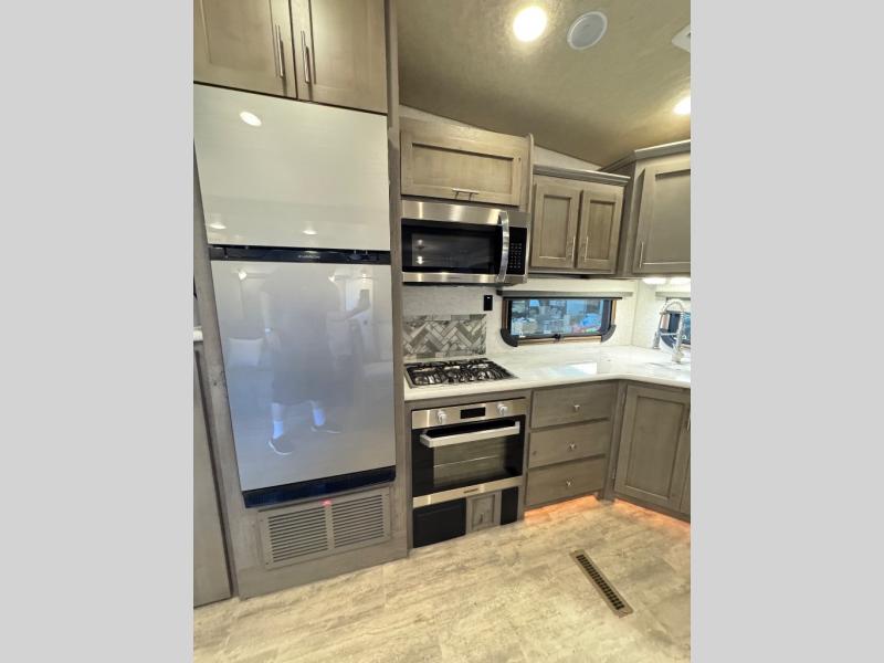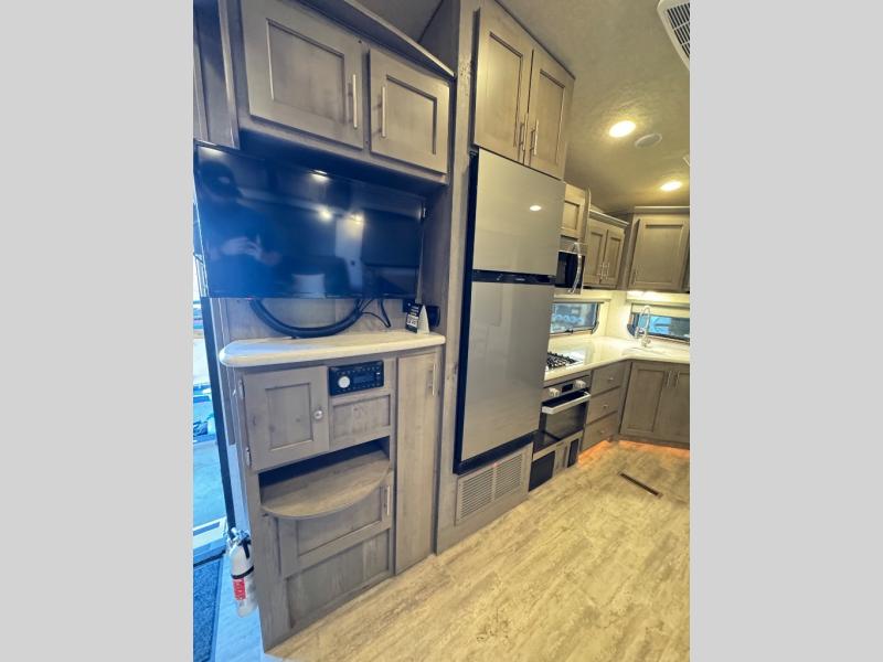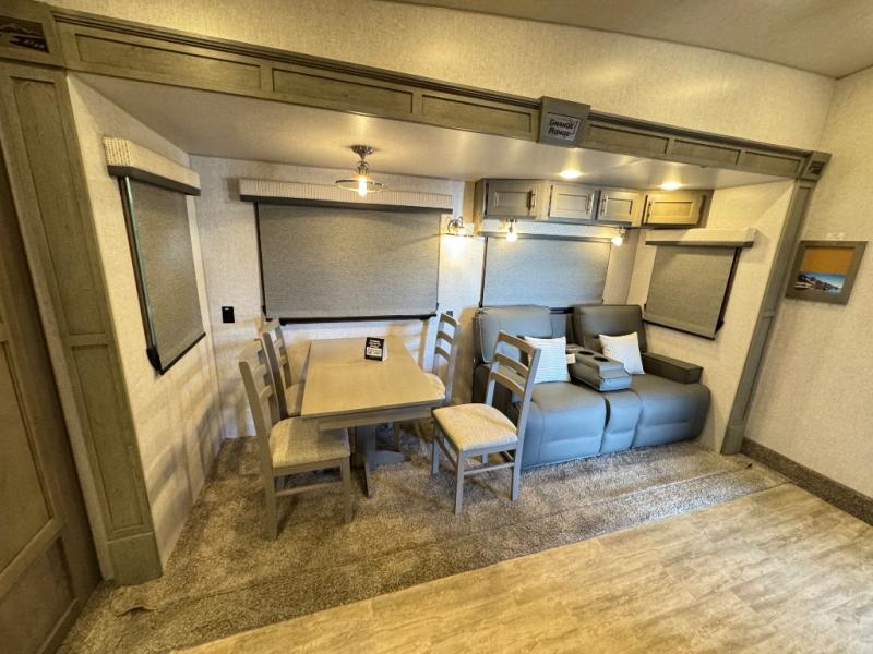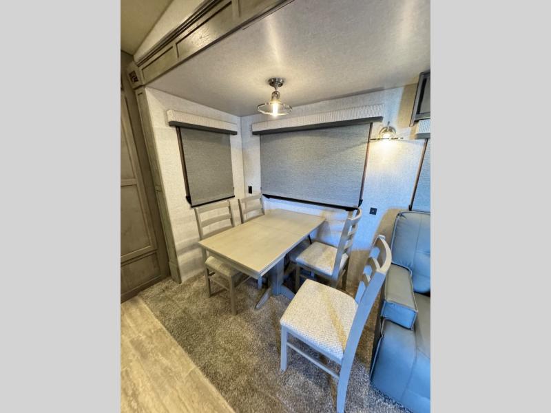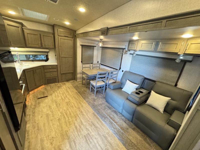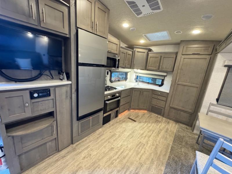 The perfect couples fifth wheel is waiting for you! From the front private bedroom with access to the full bathroom, to the spacious living area with a slide out giving you more interior space to relax and unwind, you will find something to love each time you travel. The rear kitchen offers solid surface countertops and a three burner range, and you can dine at the free-standing dinette with four chairs. You might choose to replace the table and chairs with an optional booth Dream dinette instead. There is a 32" LED Smart TV to watch when you are inside, and you will find two pantries so your snacks and ingredients are organized and ready to grab. And you will find ample storage throughout the interior for all your things as well as along the exterior.