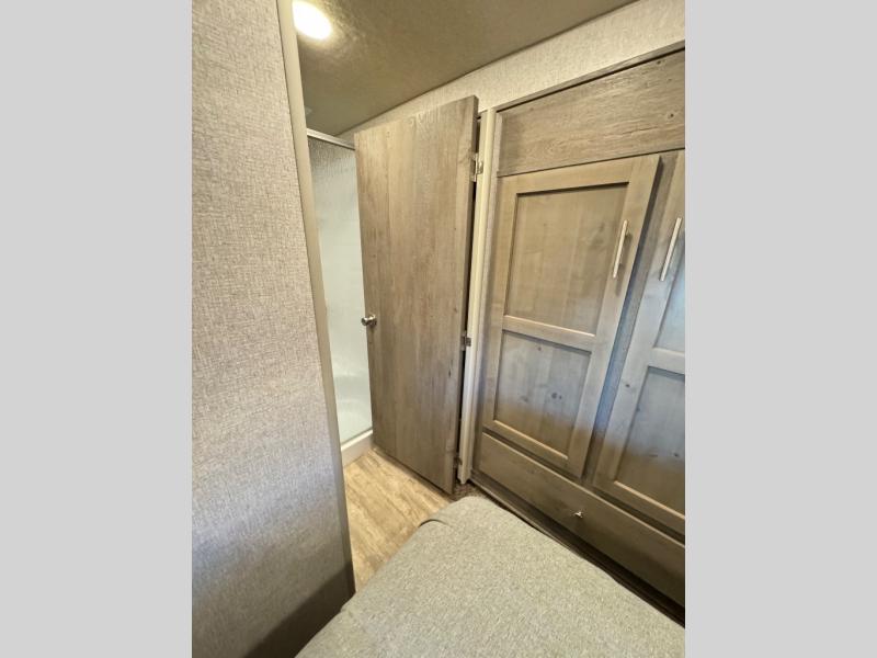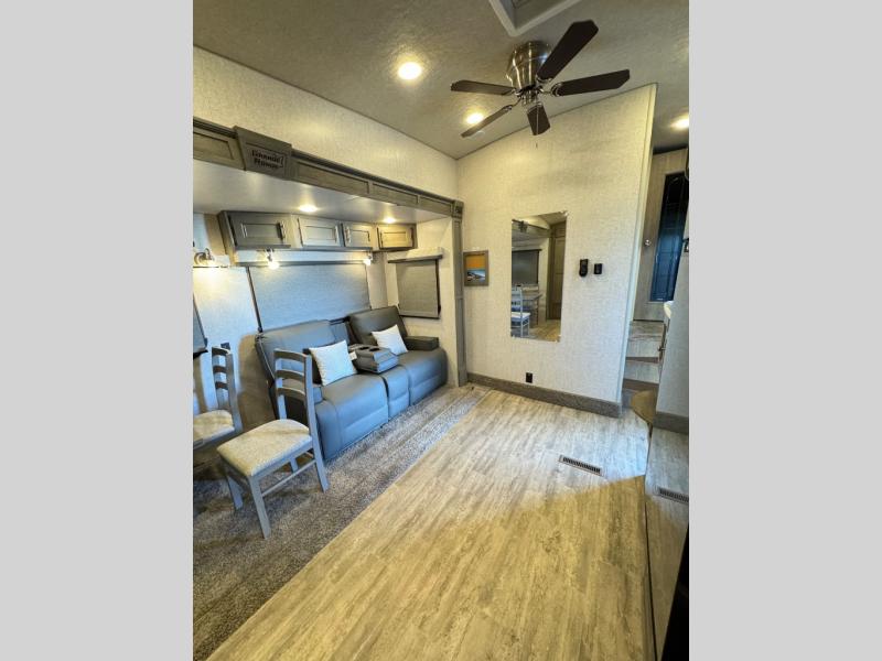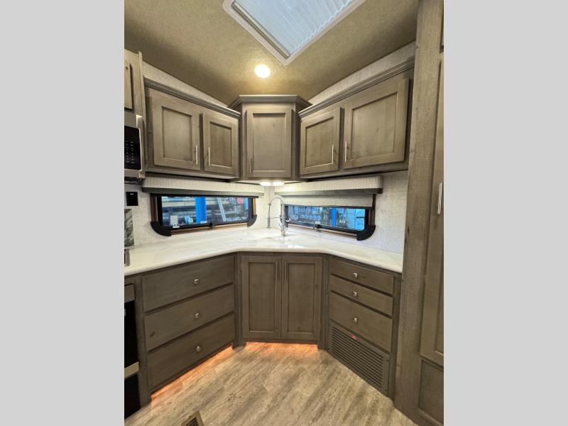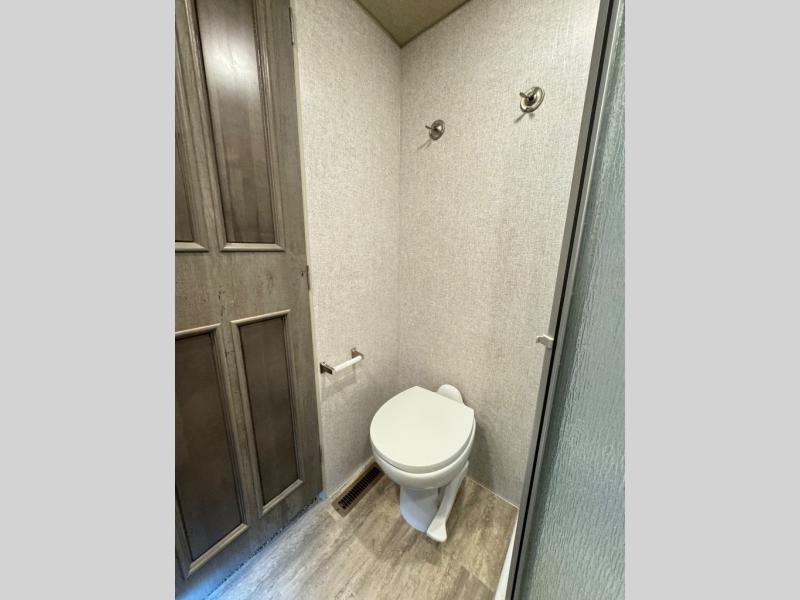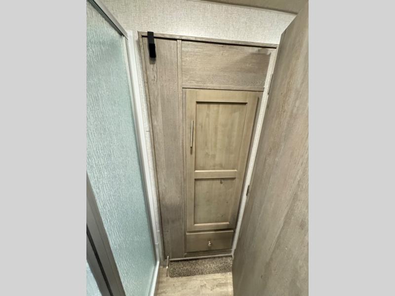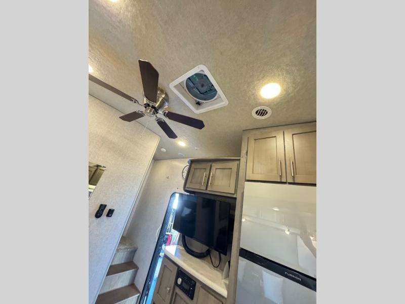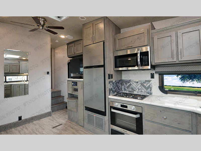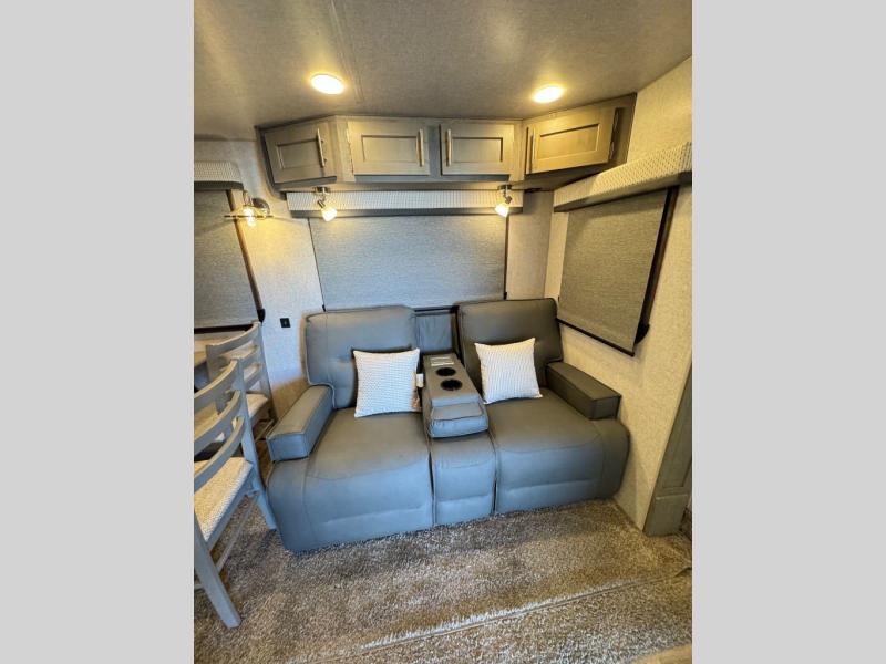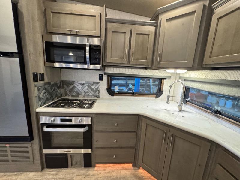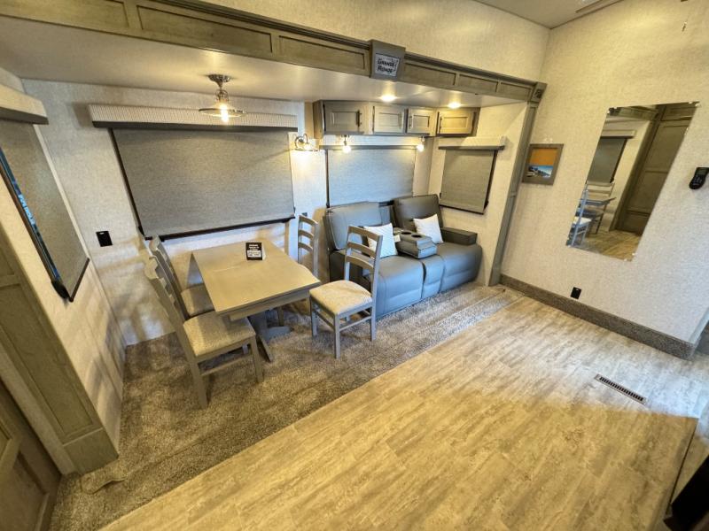 The perfect couples fifth wheel is waiting for you! From the front private bedroom with access to the full bathroom, to the spacious living area with a slide out giving you more interior space to relax and unwind, you will find something to love each time you travel. The rear kitchen offers solid surface countertops and a three burner range, and you can dine at the free-standing dinette with four chairs. You might choose to replace the table and chairs with an optional booth Dream dinette instead. There is a 32" LED Smart TV to watch when you are inside, and you will find two pantries so your snacks and ingredients are organized and ready to grab. And you will find ample storage throughout the interior for all your things as well as along the exterior.