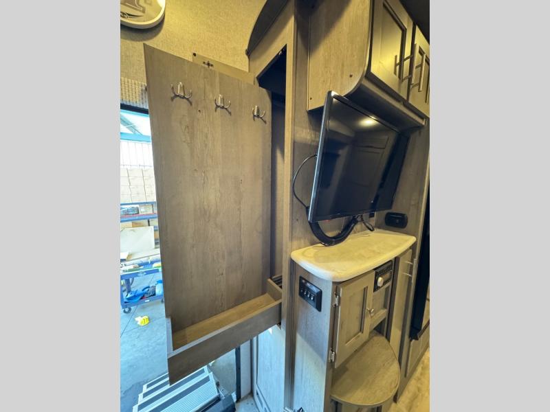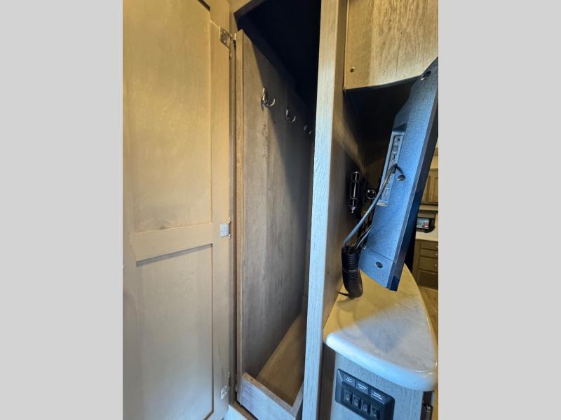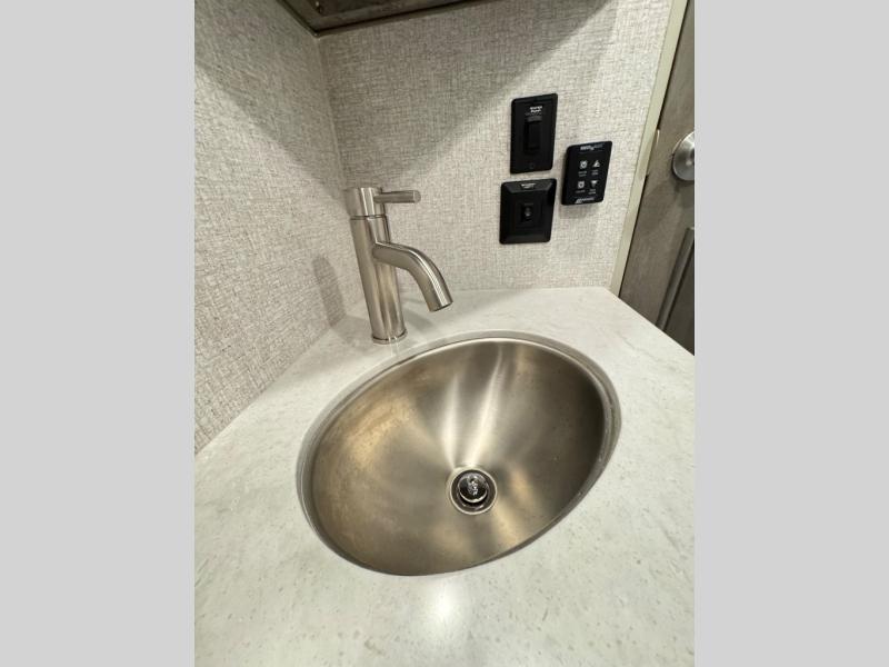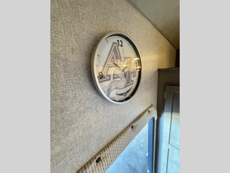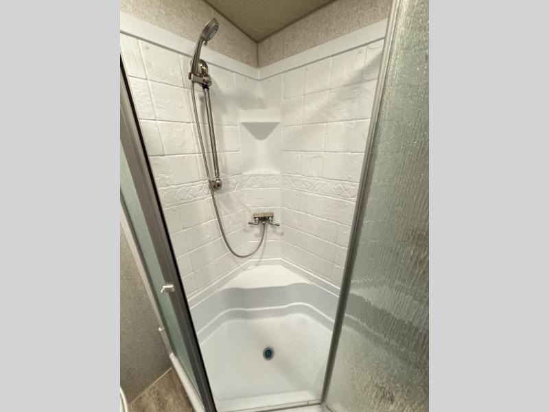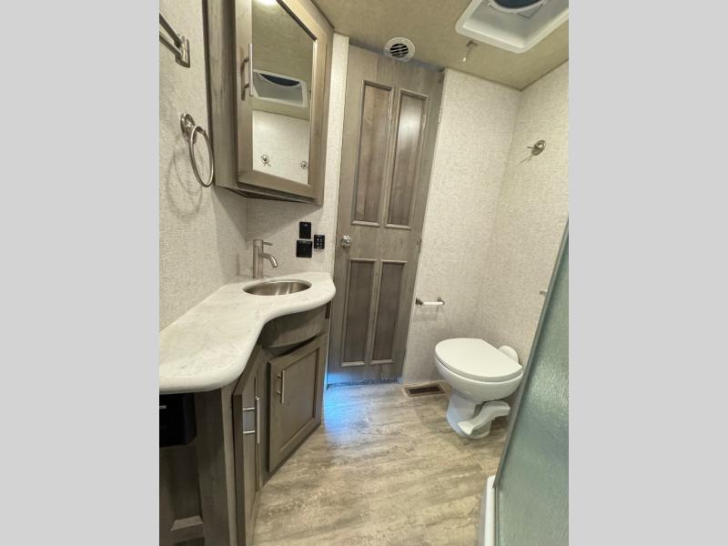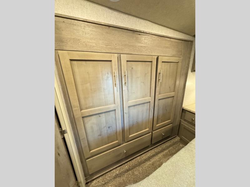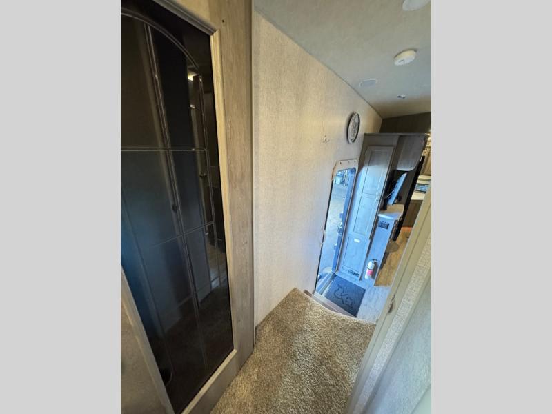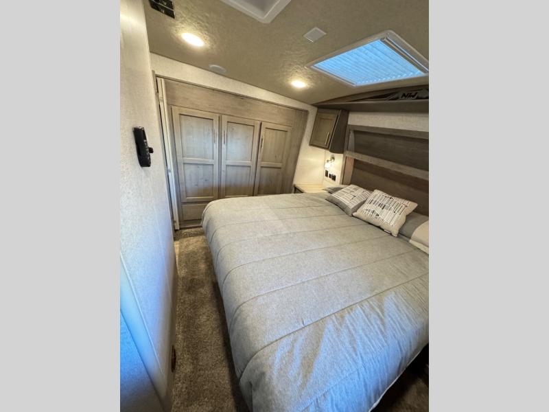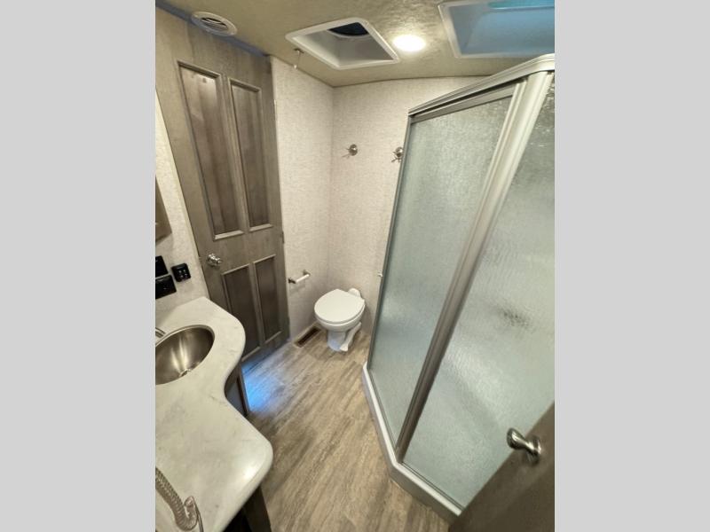 The perfect couples fifth wheel is waiting for you! From the front private bedroom with access to the full bathroom, to the spacious living area with a slide out giving you more interior space to relax and unwind, you will find something to love each time you travel. The rear kitchen offers solid surface countertops and a three burner range, and you can dine at the free-standing dinette with four chairs. You might choose to replace the table and chairs with an optional booth Dream dinette instead. There is a 32" LED Smart TV to watch when you are inside, and you will find two pantries so your snacks and ingredients are organized and ready to grab. And you will find ample storage throughout the interior for all your things as well as along the exterior.