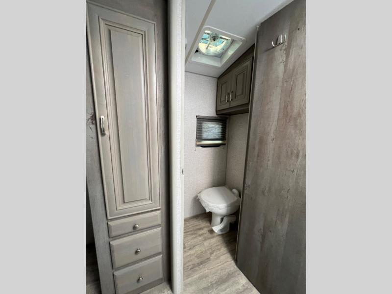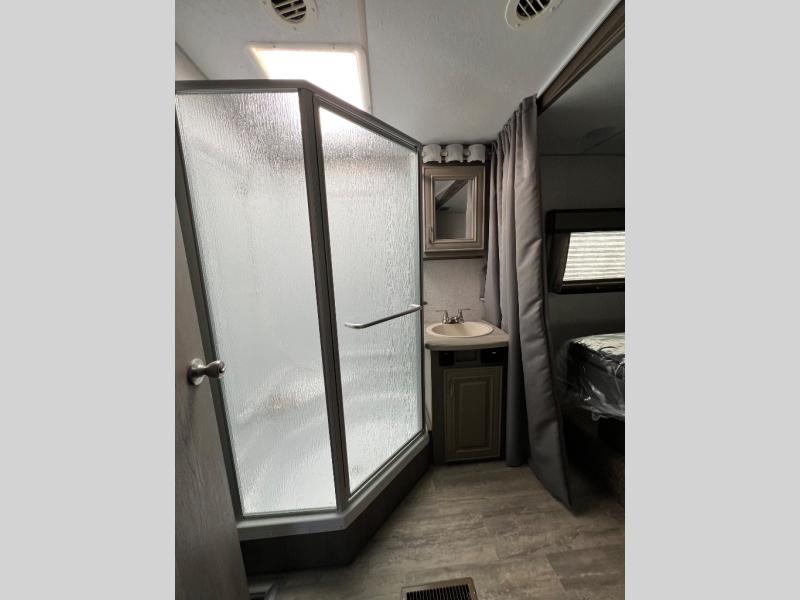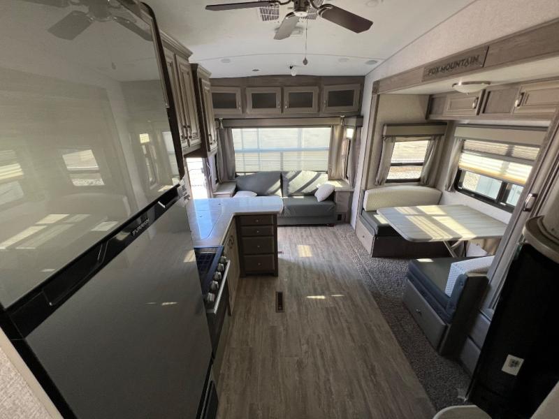 Get out and explore the best places to see with this Fox Mountain! Once you have arrived at the perfect spot, setup the 15' Carefree Travel'R 12V LED awning with adjustable pitch, and the slide out which includes the booth dinette and pantry. You can convert the dinette to a 40" x 72" sleeping area if needed for overnight guests after dining or playing games. Relax on the rear jackknife sofa with decorative pillows and two end tables to set your cellphone and beverages on or whip up a meal in the kitchen with an L-shaped counter top. The split bathroom includes a shower and sink along one side, a private toilet on the other, and a curtain to close for privacy that leads you into the front bedroom where you can sleep on the NW TruRest queen mattress, and there is a nightstand and wardrobe for your belongings.