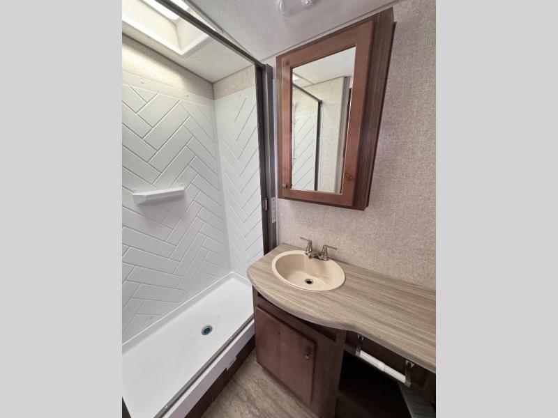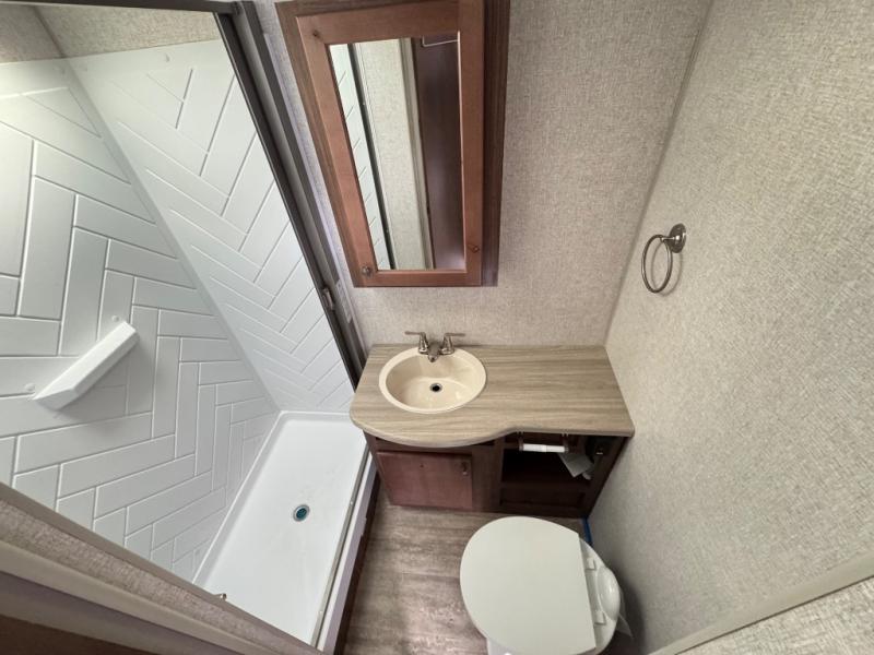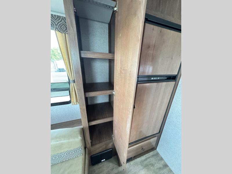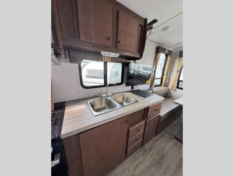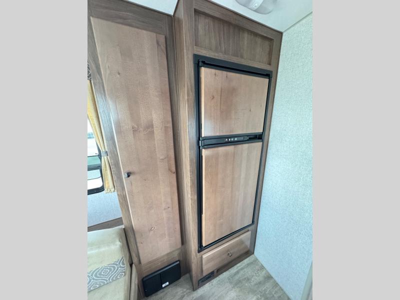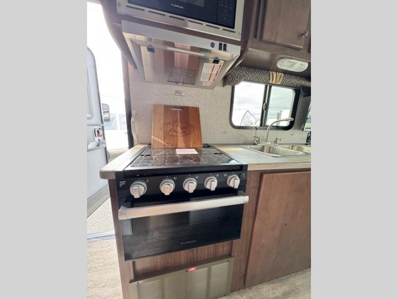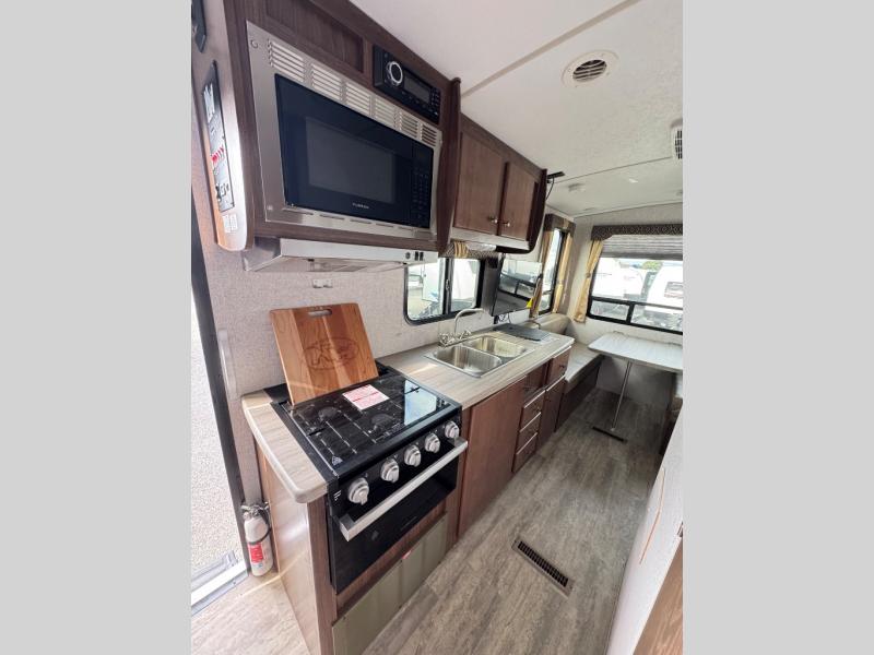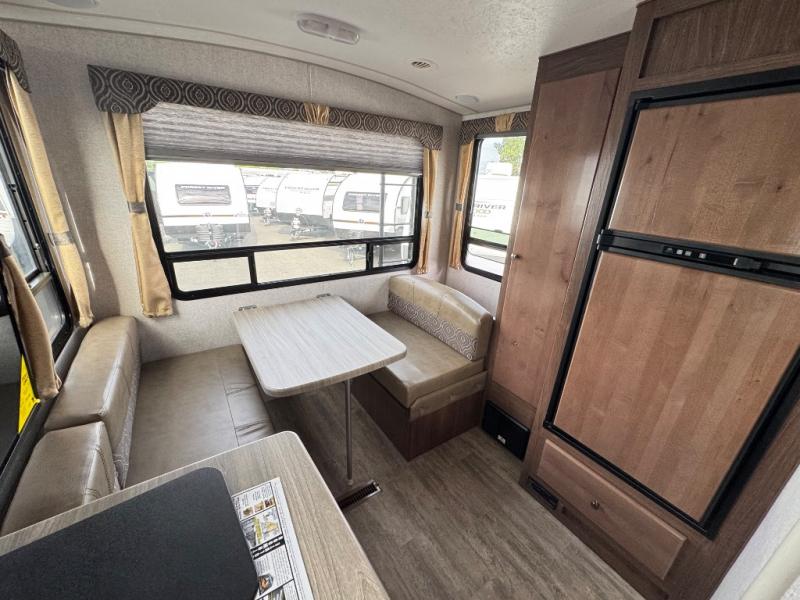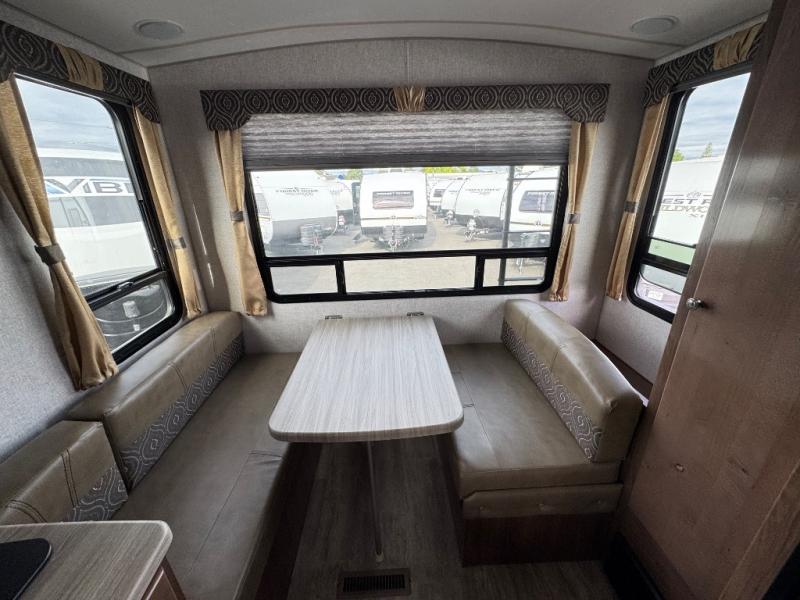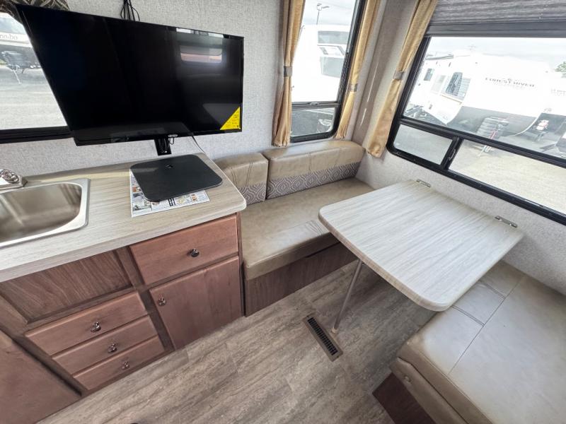 This is the perfect couples trailer for adventure and comfort during any season. From the front queen-size bed for a good night's sleep to the rear booth dinette that converts to sleeping space for one to two at night, you will be able to sleep above ground at any campsite or RV park. The next morning, whip up breakfast on the three burner range, and get cleaned up in the full bathroom in the shower. There is also plenty of counter space, a 10 cu. ft. 12V refrigerator for food, plus a wardrobe by the refrigerator that can be used for clothes or dry goods!