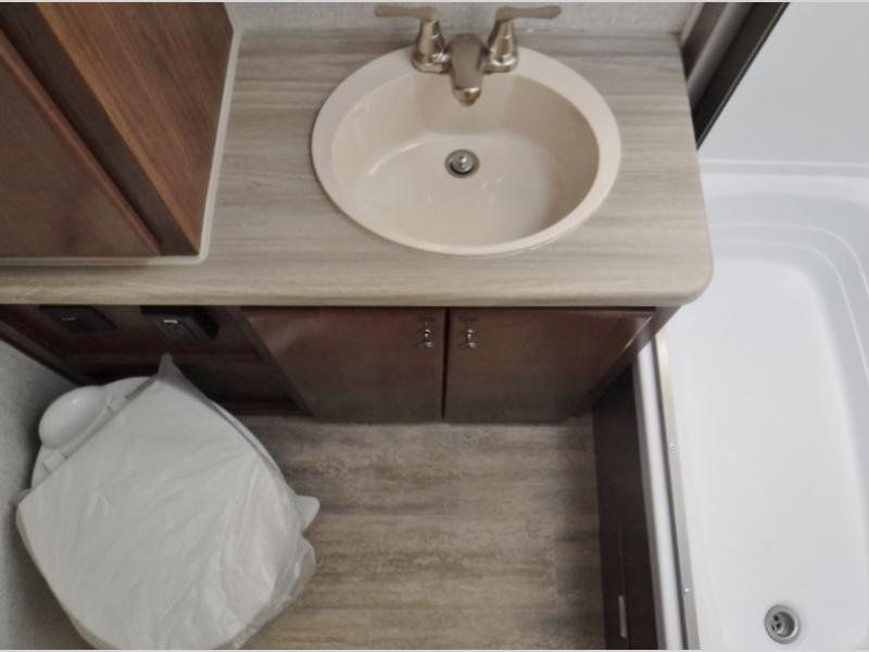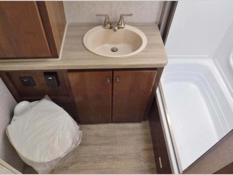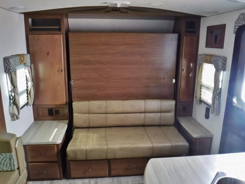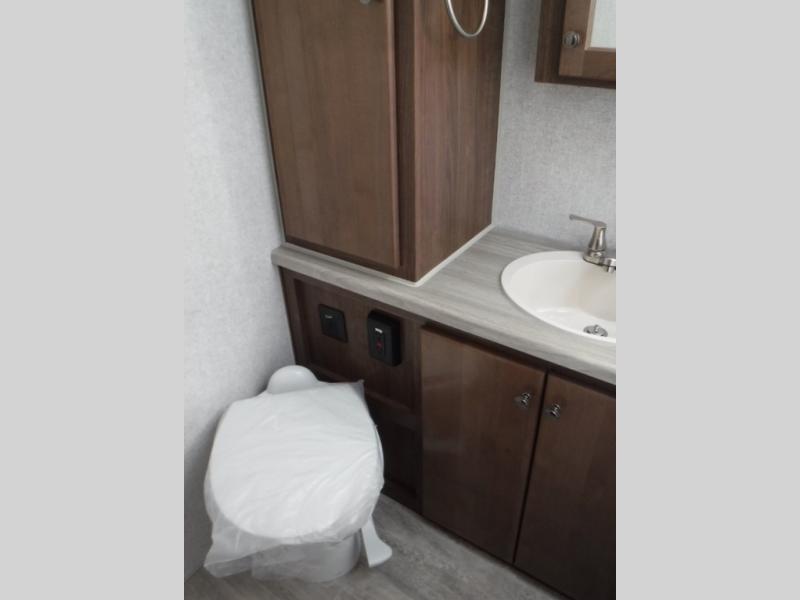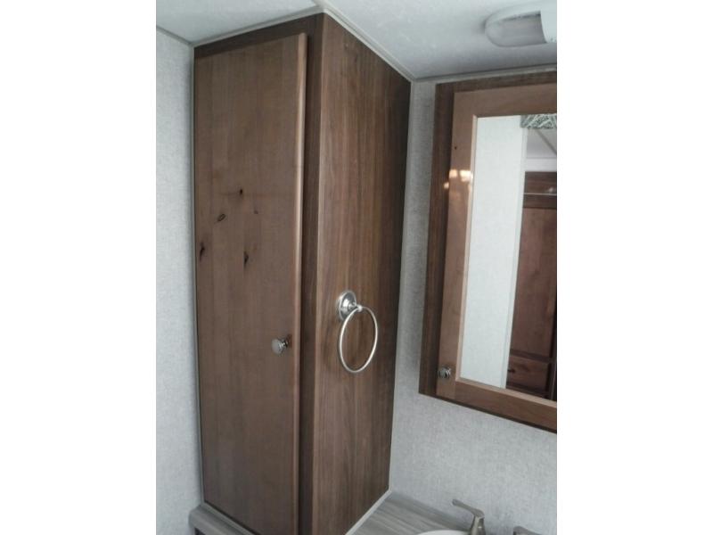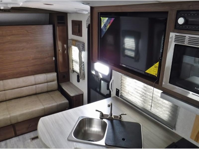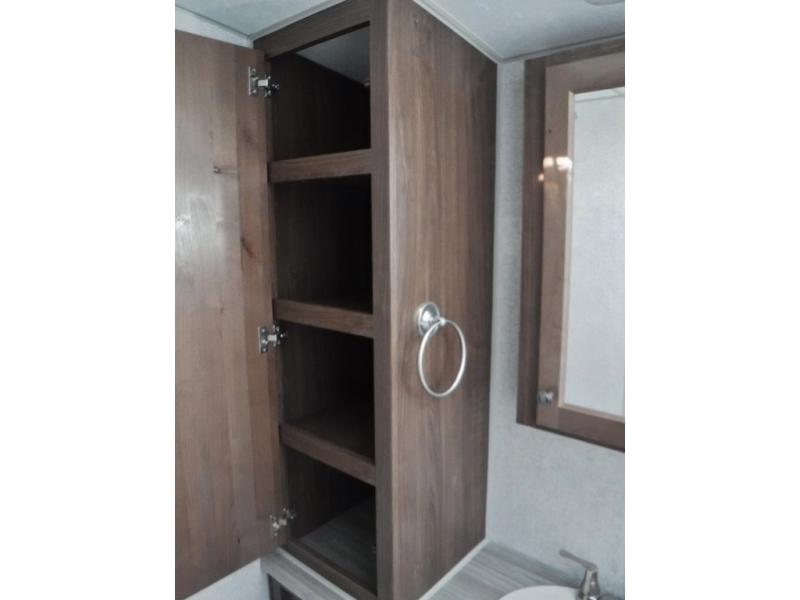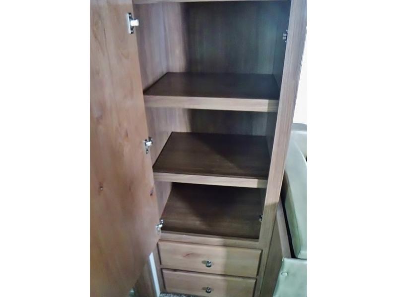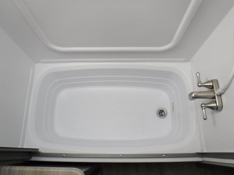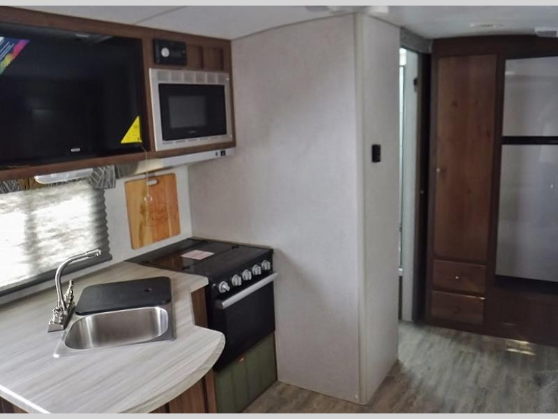 A family of three or four will love camping in this trailer with the versatile front roll over sofa and 60" x 74.5" Murphy bed, and the slide out with a U-shaped dinette and wardrobe. The dinette converts to 45" x 85" sleeping area for your child or smaller children at night making it versatile for your needs. You will find three wardrobes for your clothing, a pantry for your dry goods, and exterior storage for your outdoor gear. The full bathroom will let you freshen up before bedtime, and the kitchen offers a three burner range plus a 10 cu. ft. 12V refrigerator to keep cold items fresh!