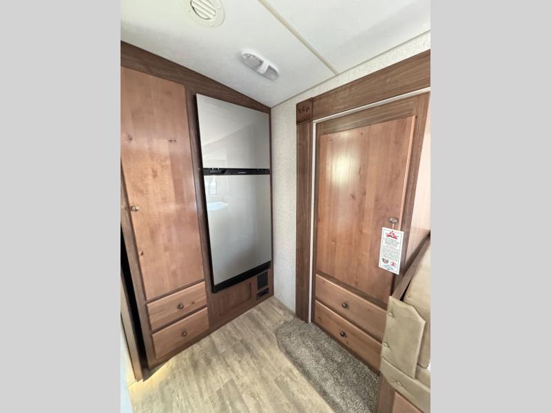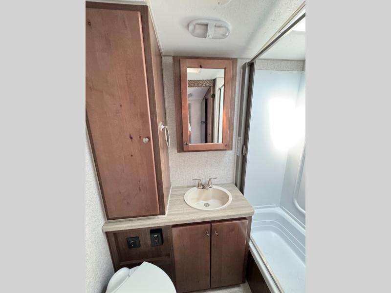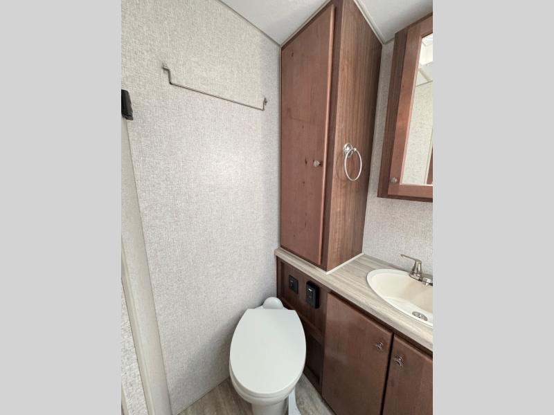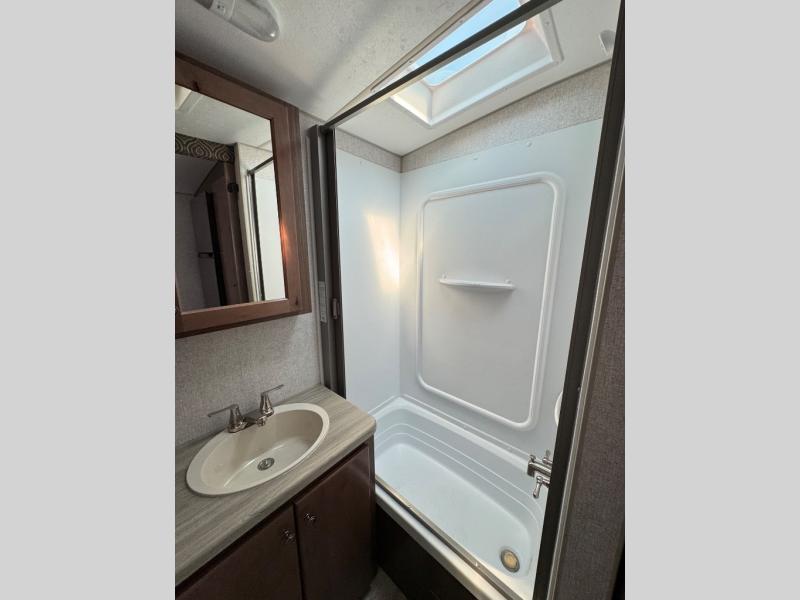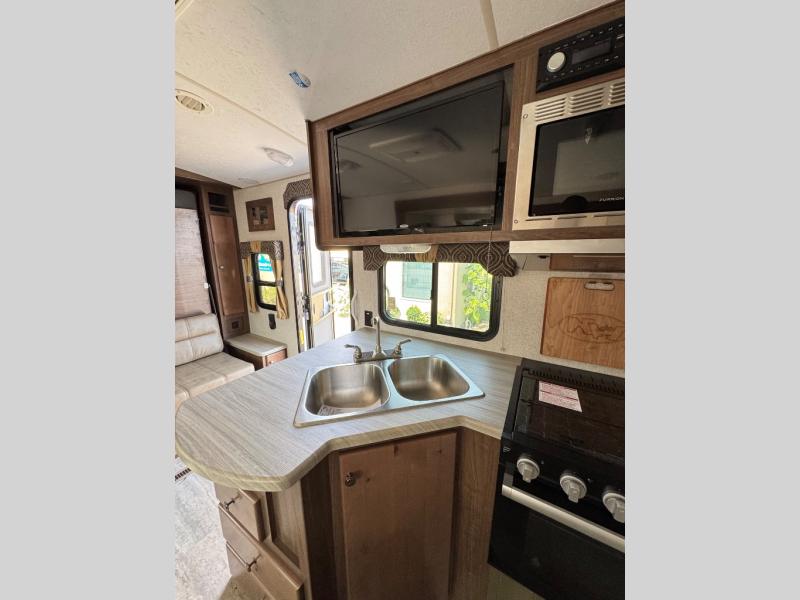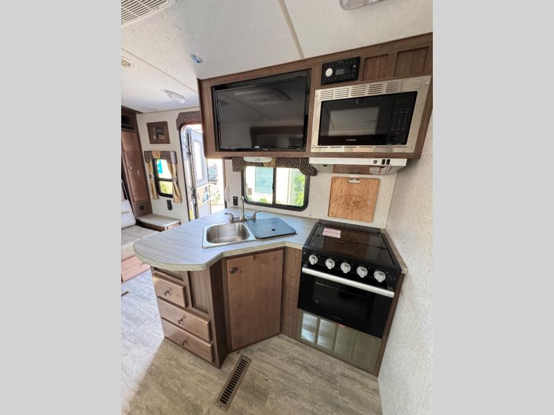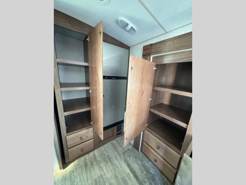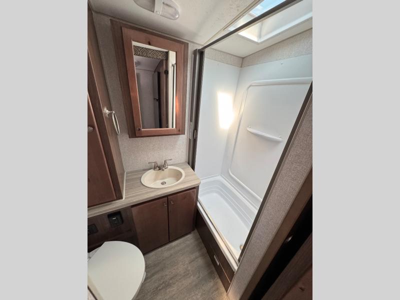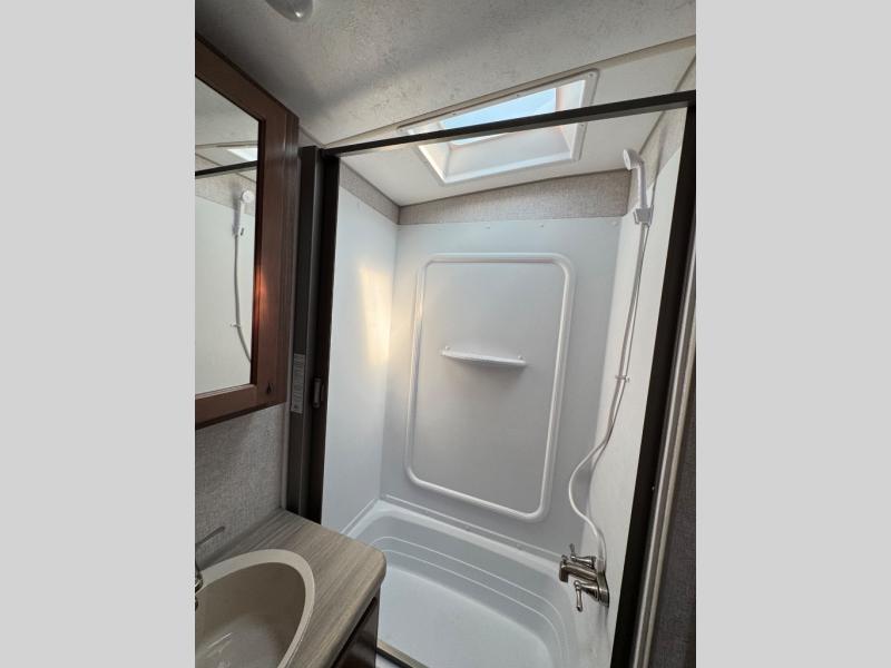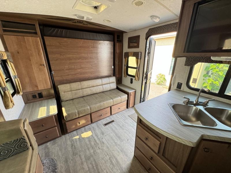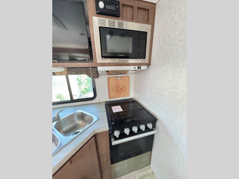 A family of three or four will love camping in this trailer with the versatile front roll over sofa and 60" x 74.5" Murphy bed, and the slide out with a U-shaped dinette and wardrobe. The dinette converts to 45" x 85" sleeping area for your child or smaller children at night making it versatile for your needs. You will find three wardrobes for your clothing, a pantry for your dry goods, and exterior storage for your outdoor gear. The full bathroom will let you freshen up before bedtime, and the kitchen offers a three burner range plus a 10 cu. ft. 12V refrigerator to keep cold items fresh!