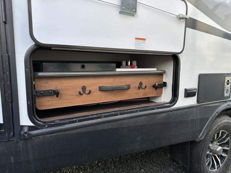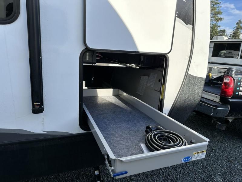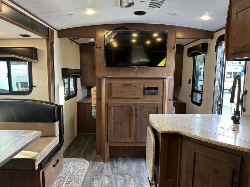 You will have everything you need for a comfortable camping trip in this travel trailer! The front private bedroom has a queen bed with wardrobes on either side to keep your clothes out of the way. There is a set of 50" x 74" bunk beds with a garage storage door and next to the rear corner bathroom. The chef can either prepare their best home cooked meals indoors with the sunken range, flip-up counter, and 12V fridge, or head to the exterior pull-out kitchen. Enjoy your meals at the 45" x 84" mountain dinette slide while a show plays on the swing out 40" TV at the entertainment center.