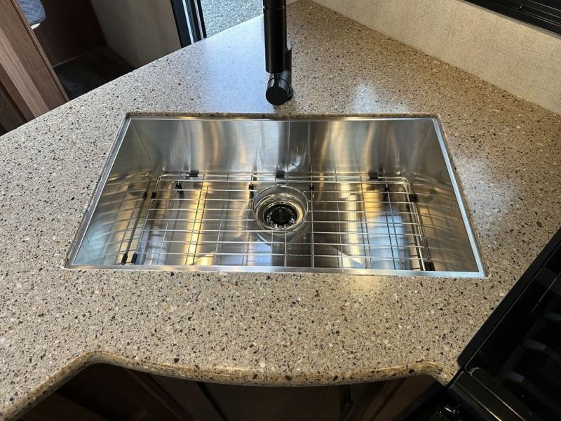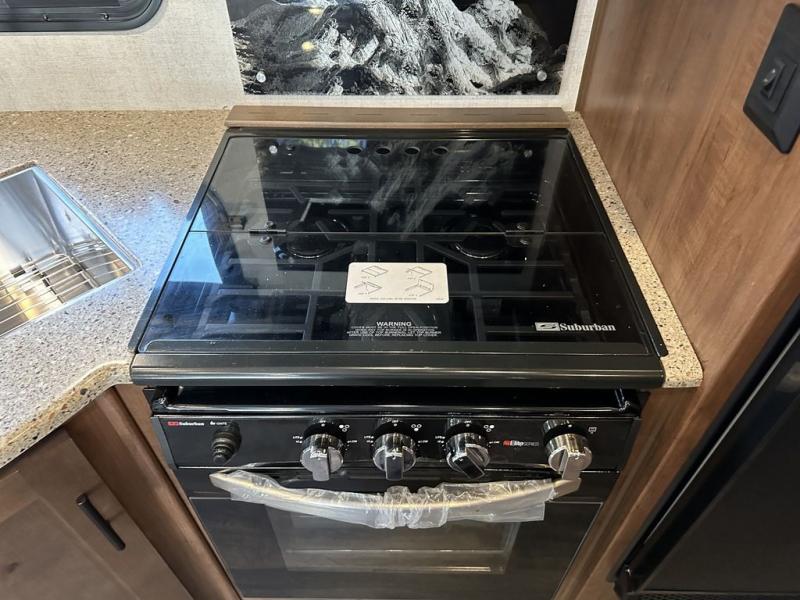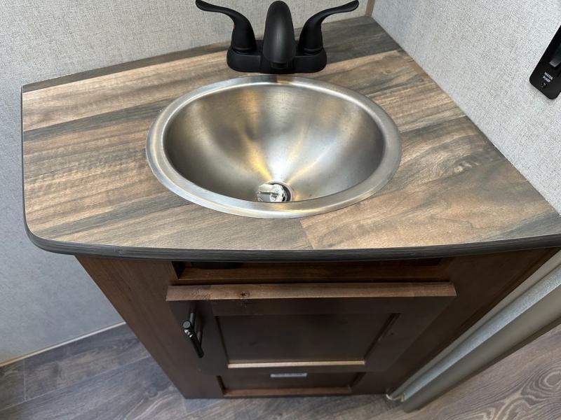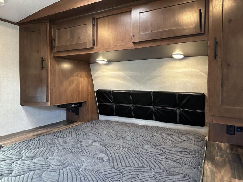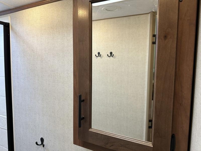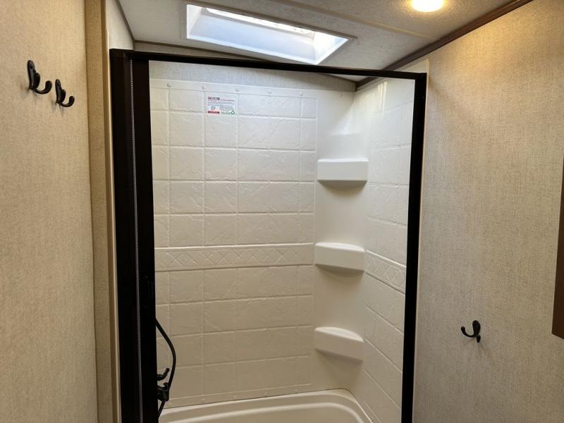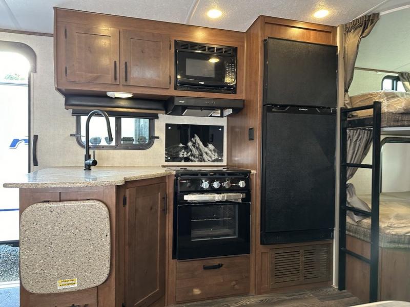 You will have everything you need for a comfortable camping trip in this travel trailer! The front private bedroom has a queen bed with wardrobes on either side to keep your clothes out of the way. There is a set of 50" x 74" bunk beds with a garage storage door and next to the rear corner bathroom. The chef can either prepare their best home cooked meals indoors with the sunken range, flip-up counter, and 12V fridge, or head to the exterior pull-out kitchen. Enjoy your meals at the 45" x 84" mountain dinette slide while a show plays on the swing out 40" TV at the entertainment center.