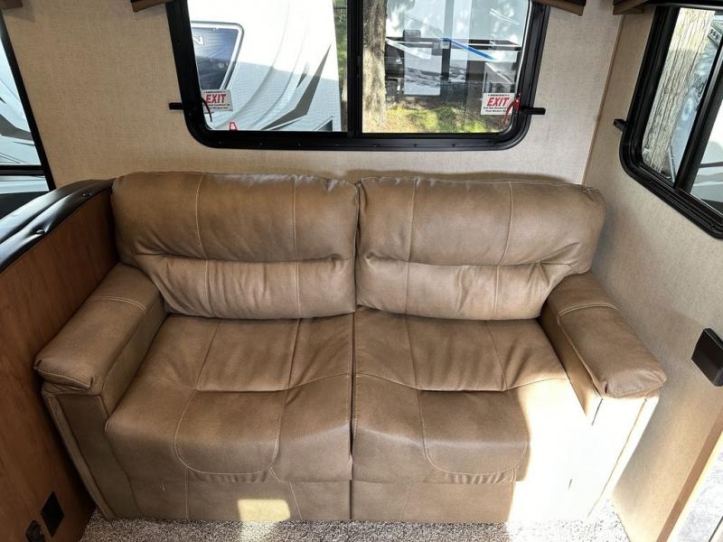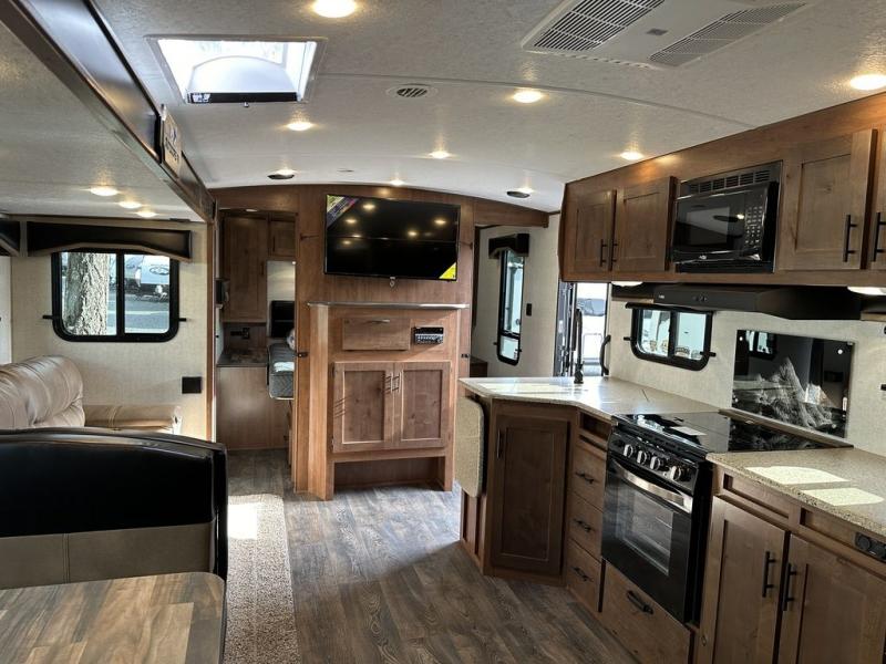 Outdoor enthusiast love this Back Country for many reasons when they camp at local campgrounds, state parks, off-grid and even at friend's ranches. The handy garage storage door allows you to place items from the exterior into the interior for safe travels under the bunks. The double-size bunks and ladder allow four to sleep each night, the mountain dinette and sleeper sofa offer three to four more spaces, and the owners will enjoy their own queen bed in the front private bedroom. The kitchen offers full amenities, the swing-out 40" TV offers inside entertainment, and the full bathroom will keep everyone clean after a fun day outdoors. There is more, step inside to see it all!