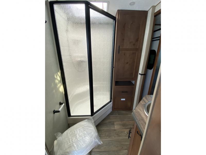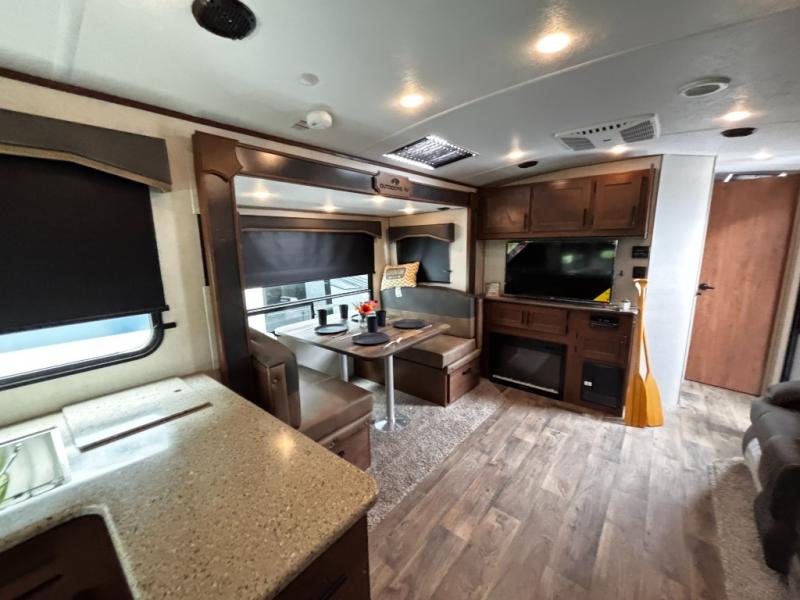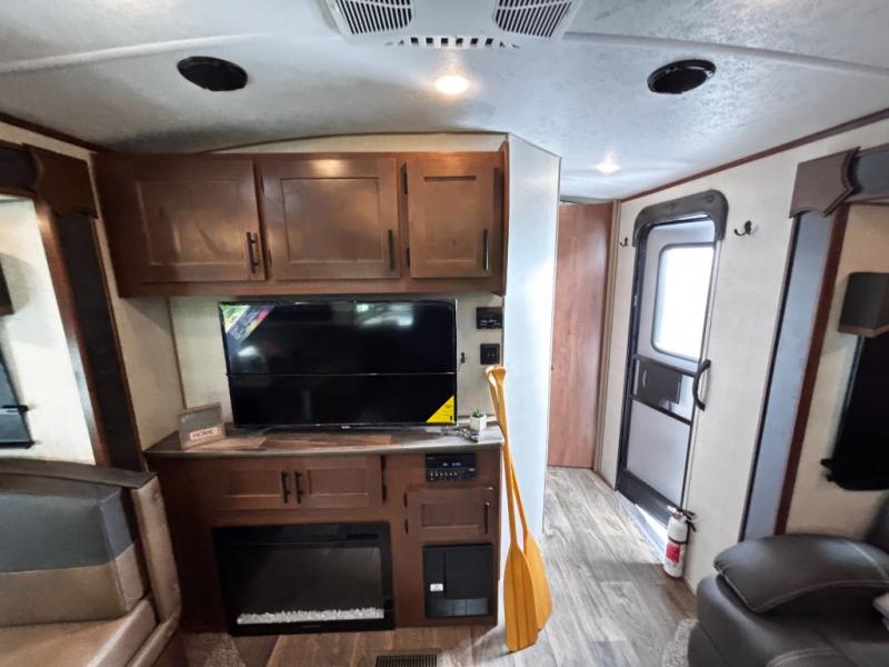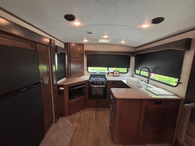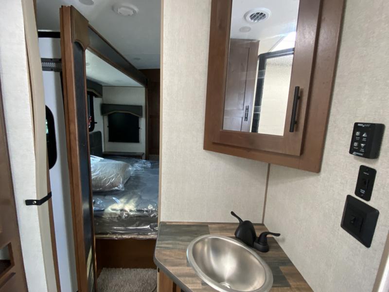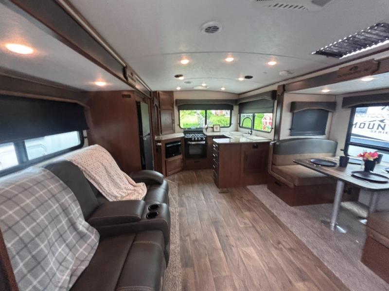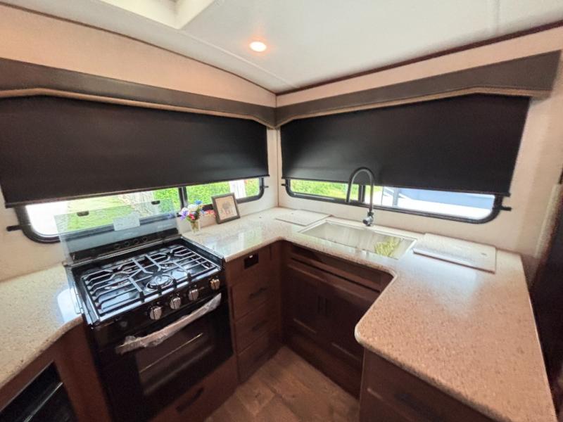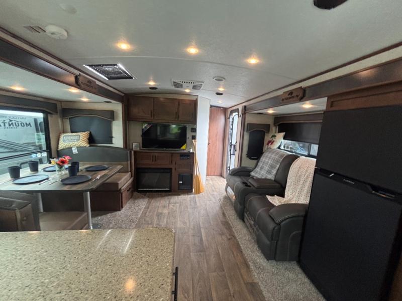 One step inside this roomy travel trailer and you'll be hooked! Your crew will love to visit in the main living area that includes dual opposing slides for tons of space, and there is a residential sofa with built-in recliners here to relax. The mountain dinette with a skylight will be the perfect place for a game of cards, and don't overlook the swing-out 40" TV here as well. This model abundant counter space in the rear kitchen and plenty of windows to take in the outdoor views as you cook. A dual entry bath is super convenient to have, and the front master bedroom will have you feeling right at home. Here, you'll find a queen bed slide out, a large front closet, plus a bench hamper to keep your space tidy.
