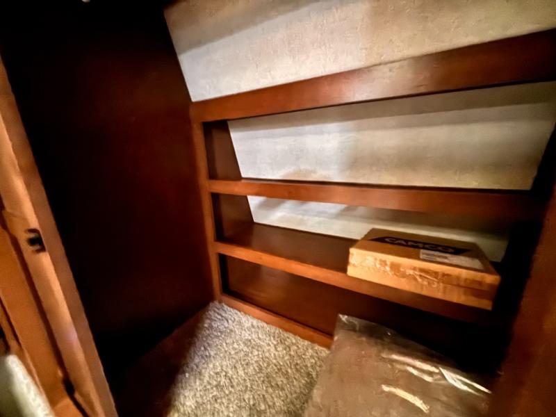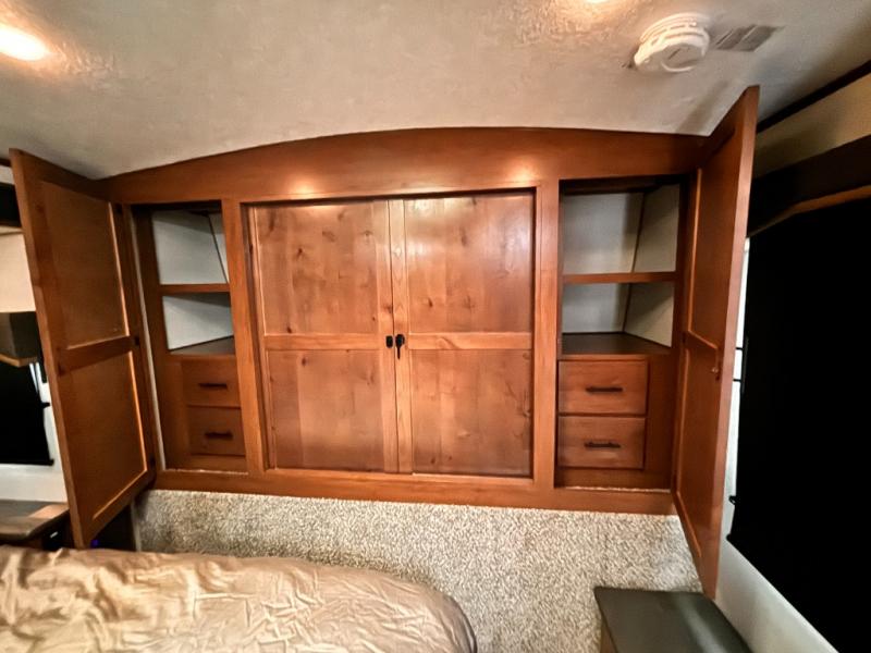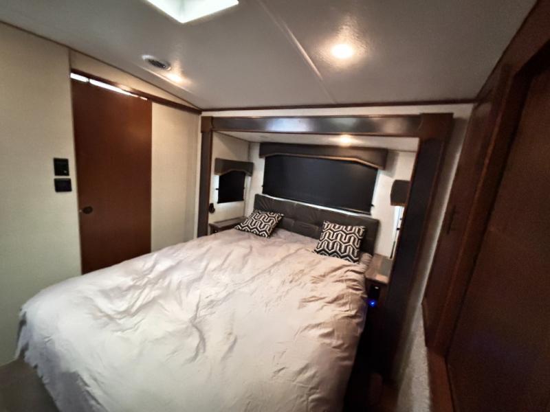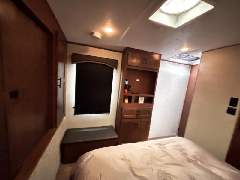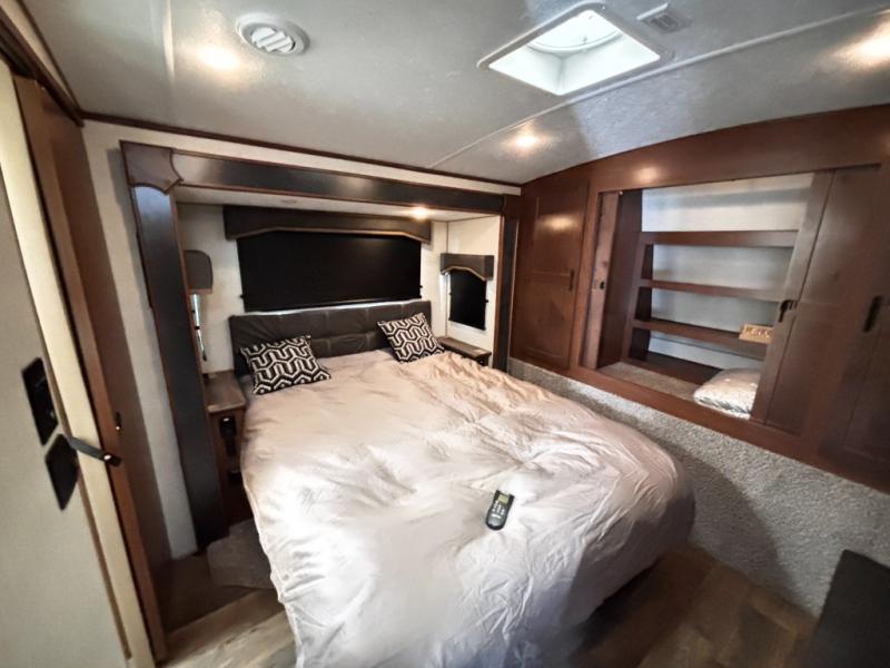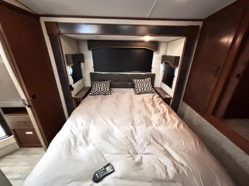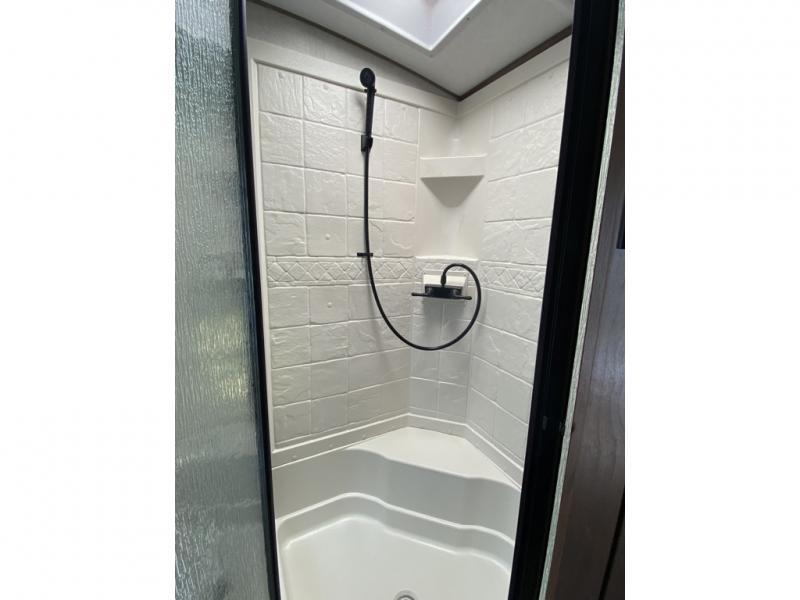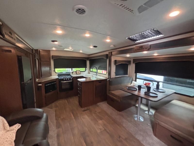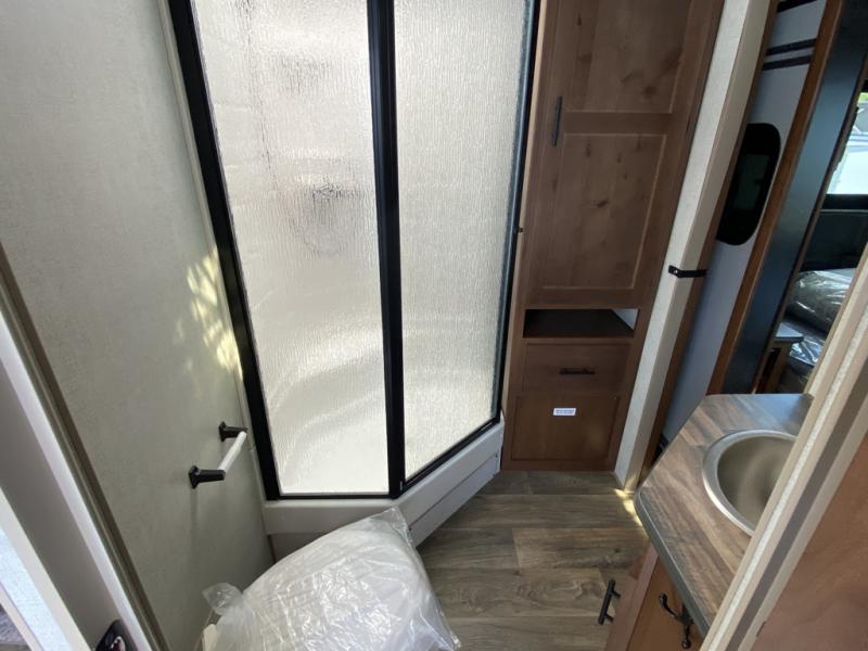 One step inside this roomy travel trailer and you'll be hooked! Your crew will love to visit in the main living area that includes dual opposing slides for tons of space, and there is a residential sofa with built-in recliners here to relax. The mountain dinette with a skylight will be the perfect place for a game of cards, and don't overlook the swing-out 40" TV here as well. This model abundant counter space in the rear kitchen and plenty of windows to take in the outdoor views as you cook. A dual entry bath is super convenient to have, and the front master bedroom will have you feeling right at home. Here, you'll find a queen bed slide out, a large front closet, plus a bench hamper to keep your space tidy.