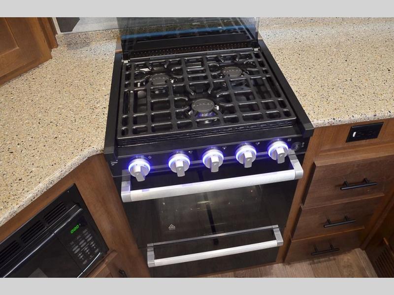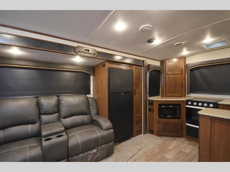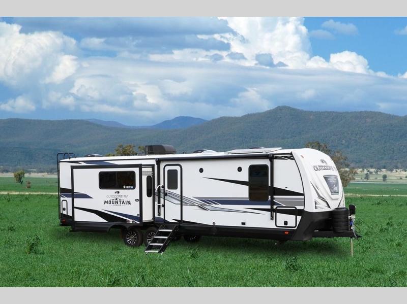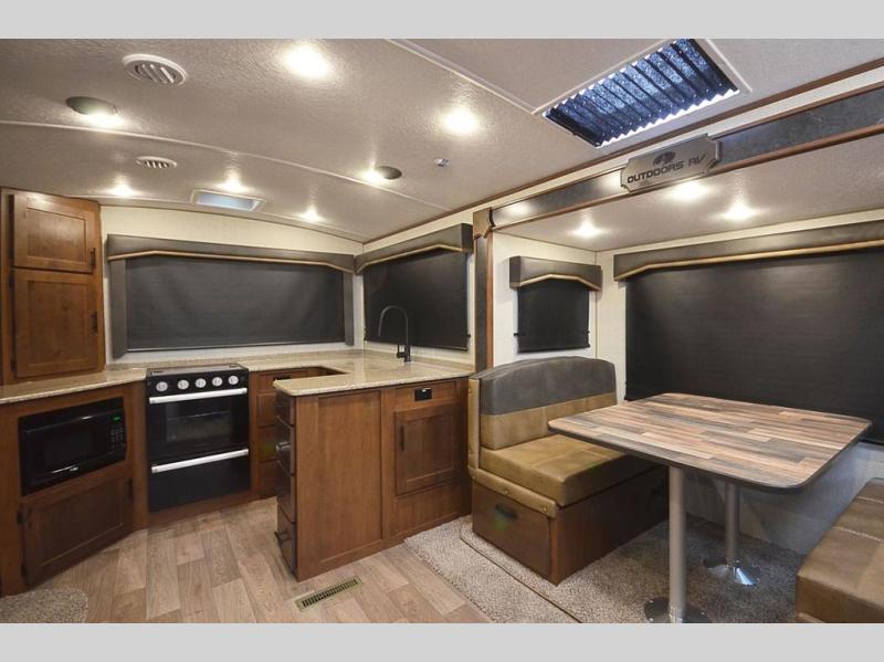 With any Black Stone Mountain Series travel trailer by Outdoors RV you will enjoy climate designed four seasons camping thanks to the thermal pane windows and the fully enclosed, heated, and insulated underbelly. The custom built chassis and rugged integrated A-frame are built for strength and durability, along with the rugged 2" bonded aluminum frame walls. Each model includes LG solid surface countertops, granite designed backsplash, vaulted radius ceilings, and a mountain comfort premium mattress for all-around comfort. You will also love the XL panoramic slide out windows and the dual pane living room skylight with a shade to let natural light in!