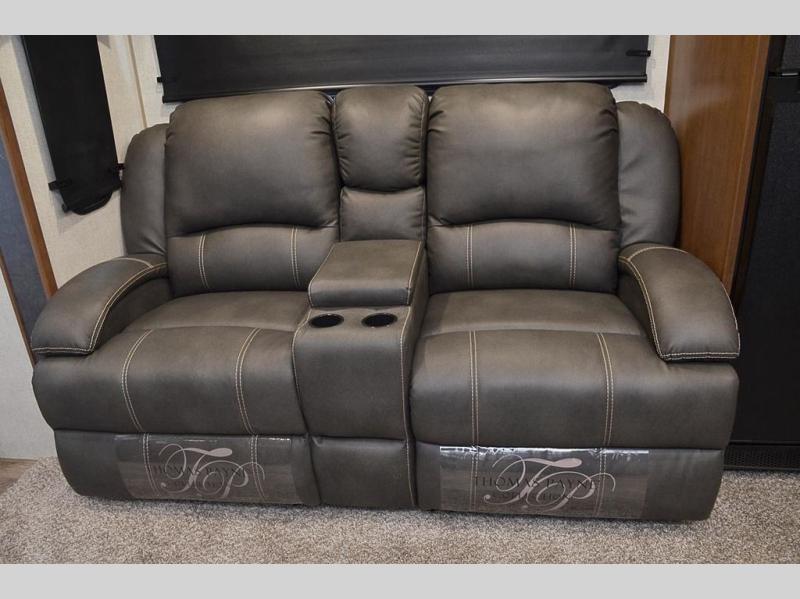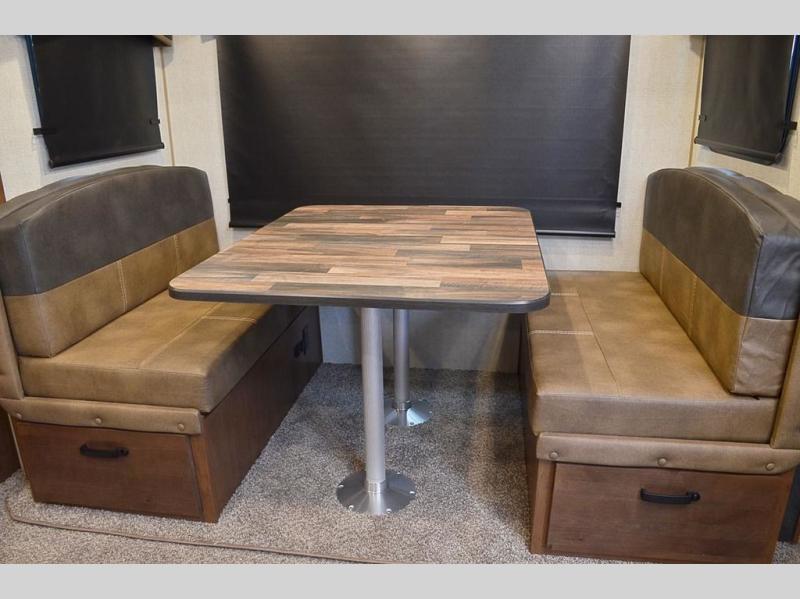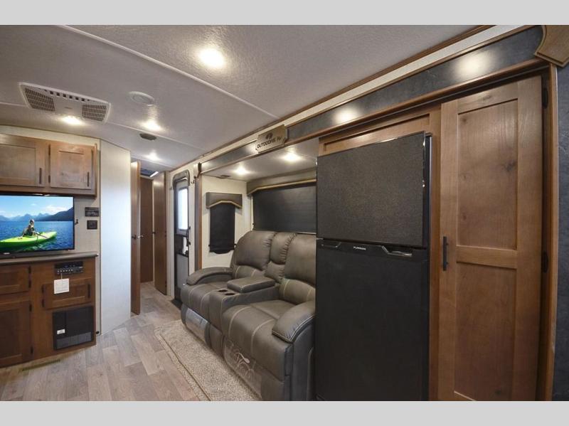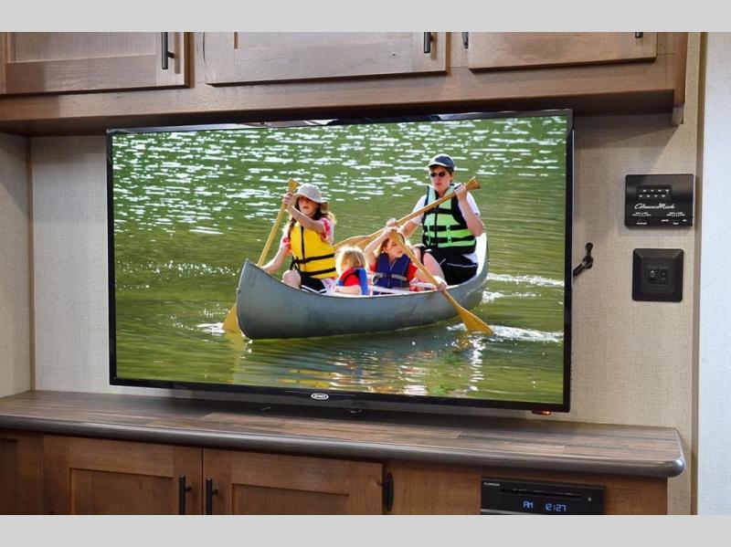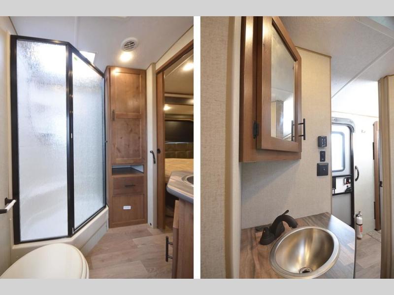 One step inside this roomy travel trailer and you'll be hooked! Your crew will love to visit in the main living area that includes dual opposing slides for tons of space, and there is a residential sofa with built-in recliners here to relax. The mountain dinette with a skylight will be the perfect place for a game of cards, and don't overlook the swing-out 40" TV here as well. This model abundant counter space in the rear kitchen and plenty of windows to take in the outdoor views as you cook. A dual entry bath is super convenient to have, and the front master bedroom will have you feeling right at home. Here, you'll find a queen bed slide out, a large front closet, plus a bench hamper to keep your space tidy.