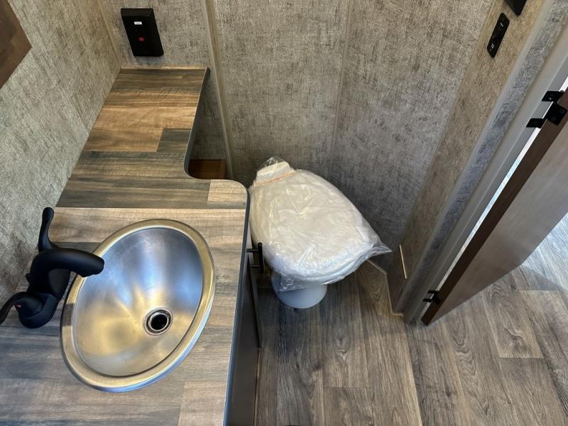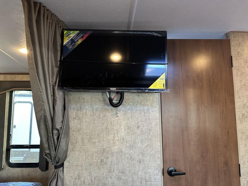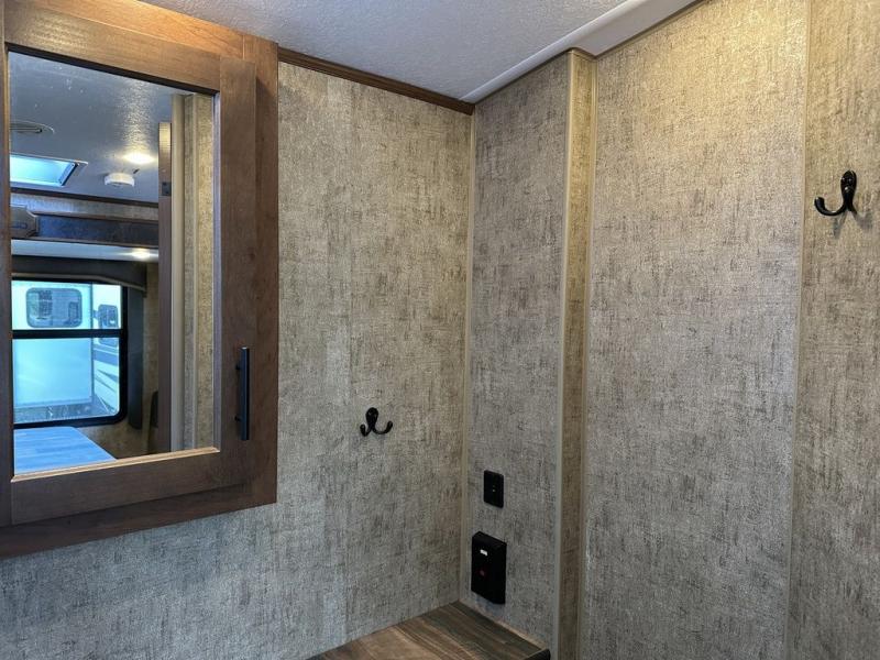 You're going to love this rear kitchen travel trailer with abundant counter space for cooking at-home meals, and the entry door is now here for convenience. The mountain dinette provides a place to dine or play games, and there is a swing-out 32" TV across from the dinette for movie nights. A full bath on board lets you stay clean throughout your camping trips, and there is a bath skylight for natural lighting here as well. The front bedroom includes dual bedroom wardrobes to keep your clothes wrinkle-free, and the RV queen bed is sure to bring comfort each night.