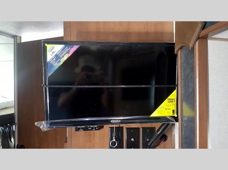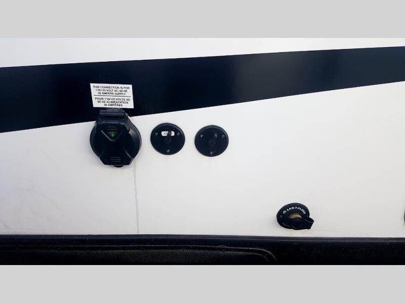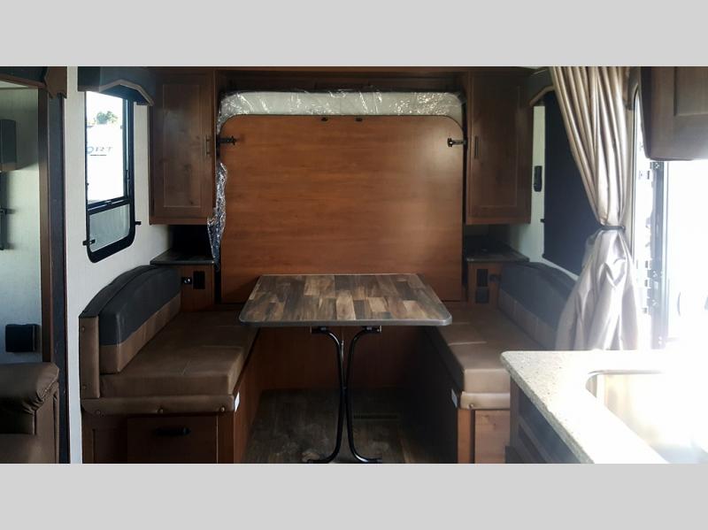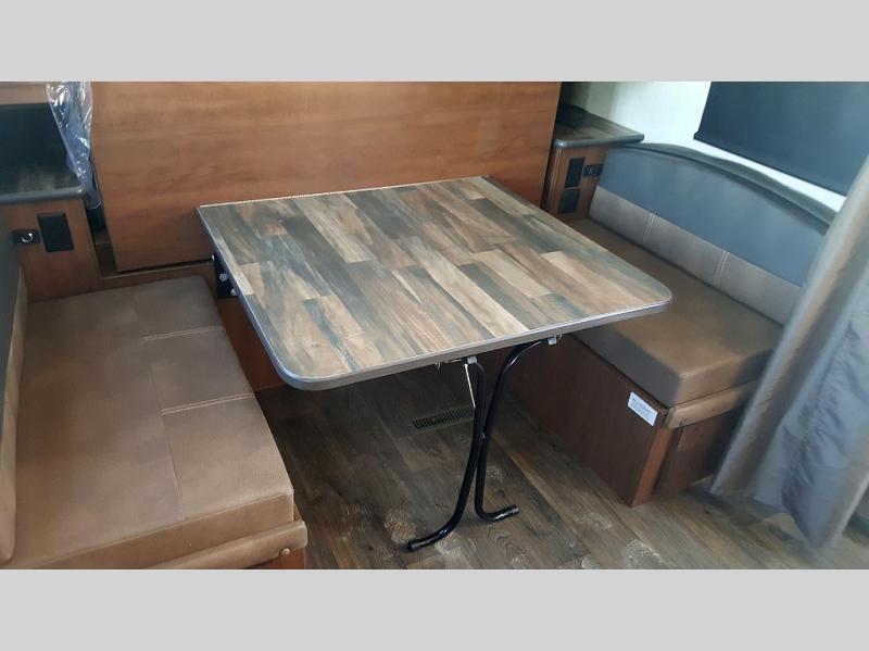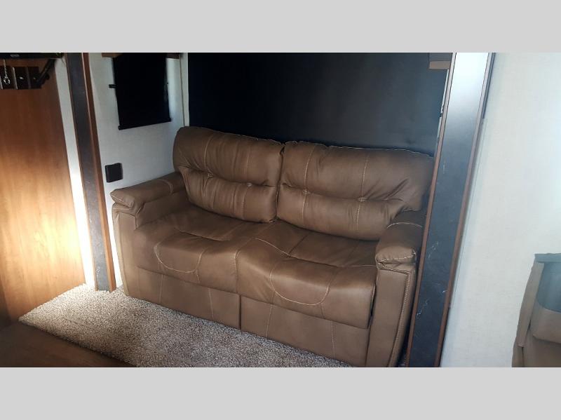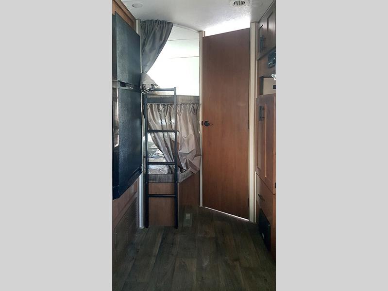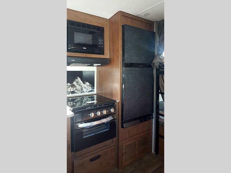 This is the perfect family-friendly travel trailer or for those who like to camp with friends! The double-size bunks in the back will provide fun sleeping space, and there is an exterior garage storage door where you can pack in gear directly under the bunks. The combined kitchen and living area includes a residential sofa with built-in recliners with a skylight above for natural light. There is also a fold-down dinette table and a front queen wall/Murphy bed for a great night's rest!