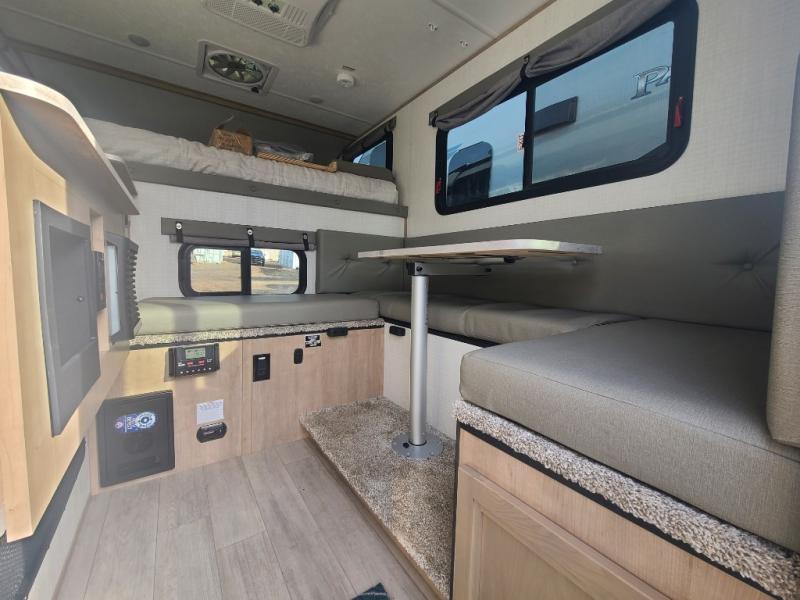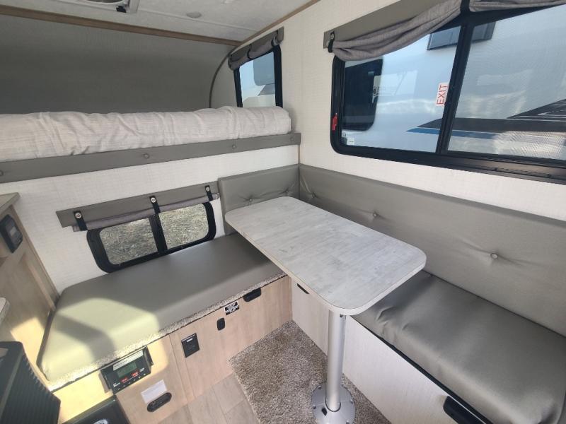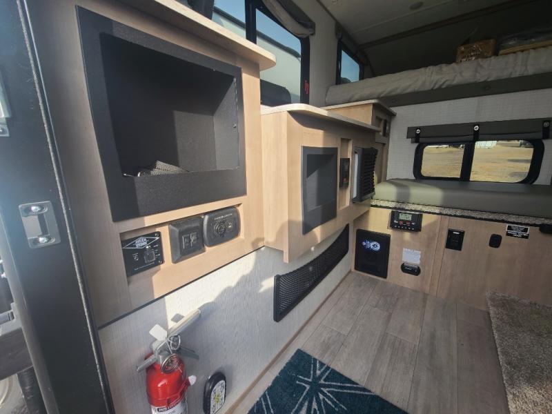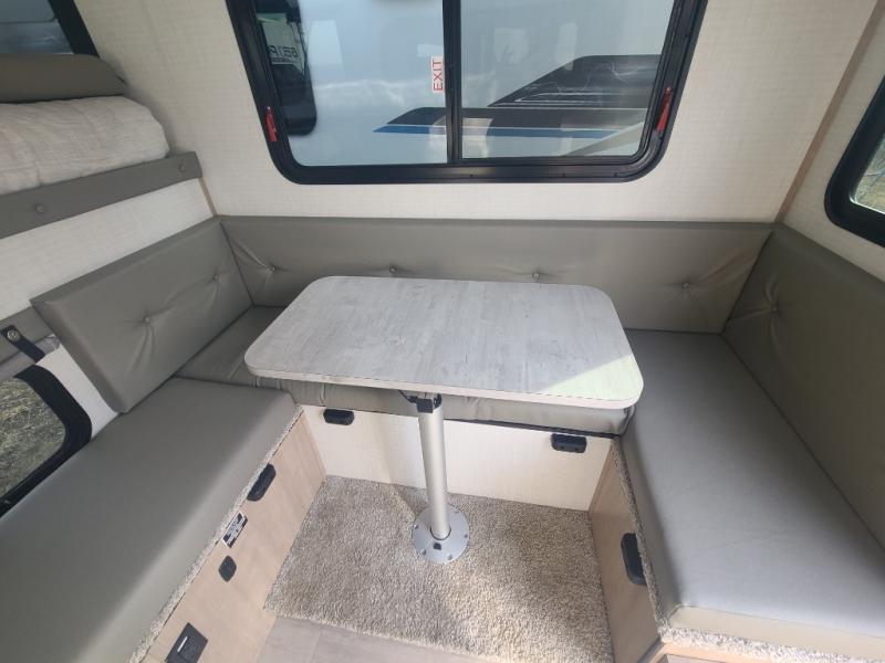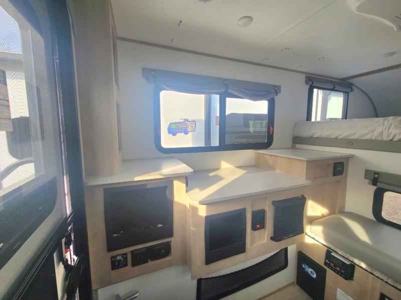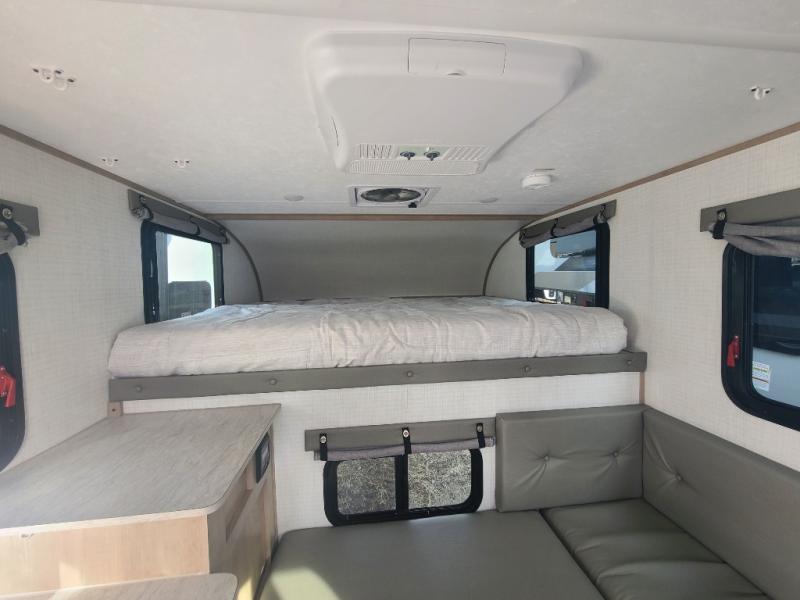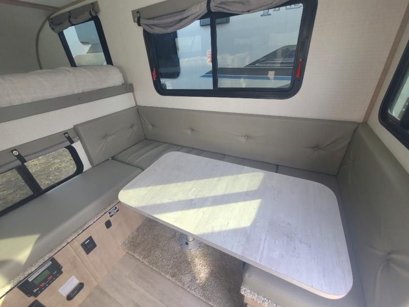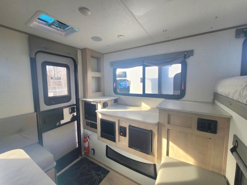 This truck camper is perfect for a 1/2 ton tuck with a 5' 6" or larger bed! You will find the 60" x 80" queen-size bed with a 5" innerspring mattress ultra comfortable after a day of traveling all day, and the laminated roof on this model will last for years of use. There is L-shaped seating with storage space for a toilet if you choose to bring one along. You will appreciate the ample counter space in this truck camper, including space to set your cooler at so you don't have to reach down to the floor each time. Don't forget to check out the available options, like the side awning with LED lights, electric jacks, or TV to name a few!