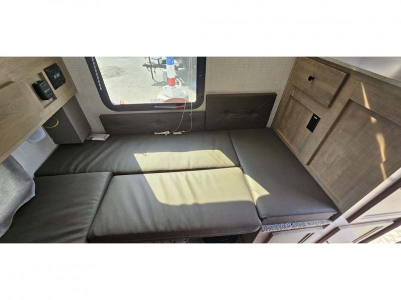 Stay well rested in this soft sided truck camper with a front queen bed! The seating area with a table is not only great for enjoying your meals prepared with the two burner cooktop, but also for an extra guest to sleep at night, plus it has storage for a blanket and a pillow. There is also a closet storage and storage next to the refrigerator.