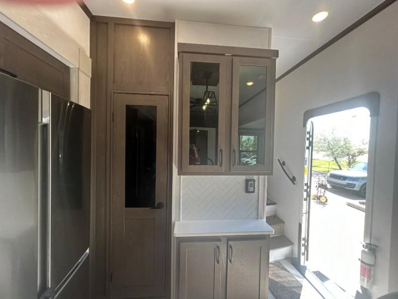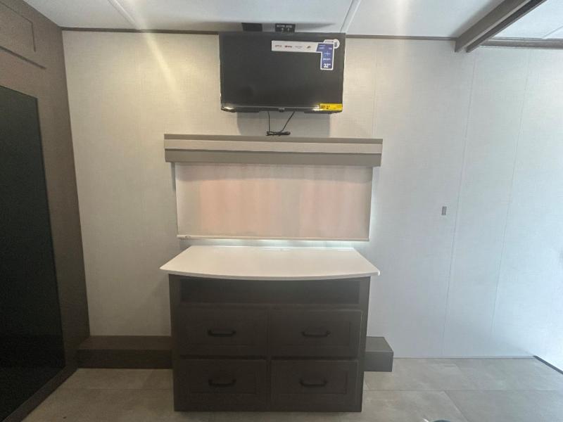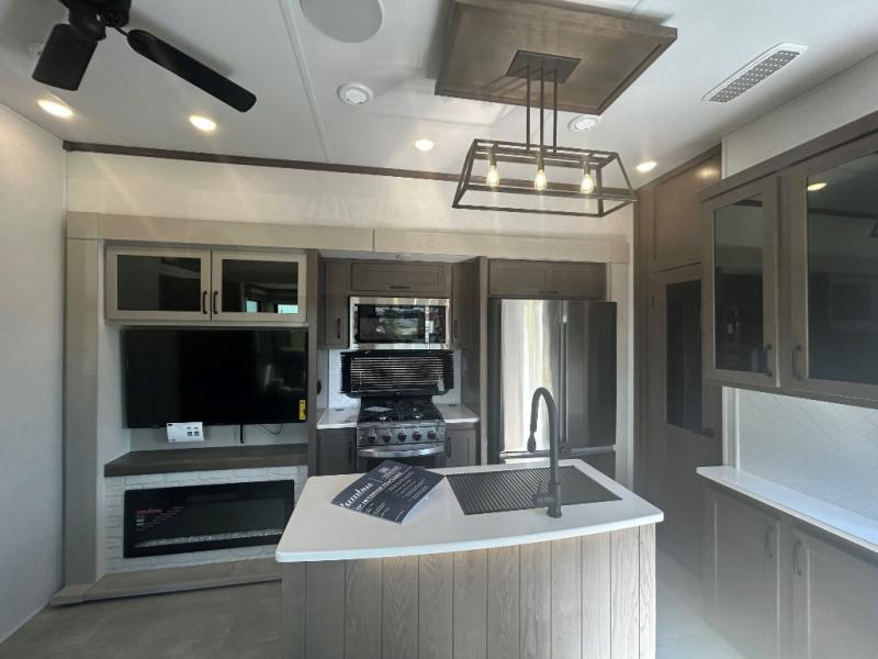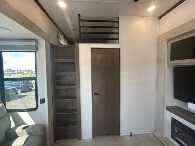 Camping with friends and family just got a whole lot easier in this spacious fifth wheel! Up front, you'll find a private bedroom with a king bed slide out, a dresser, a wardrobe with a shelf, plus washer and dryer prep if you plan to go full-time. The master bedroom towards the back includes a queen bed slide out, a wardrobe and a dresser, plus a full rear bath with a unique rear entry door. There is also a loft bed with a ladder above this rear room for added sleeping or storage space! Everyone can meet in the middle kitchen and living room that includes theater seats with tables, a kitchen island, an entertainment center with a fireplace, plus a pantry and hutch for added storage. You don't want to miss out on this fifth wheel!