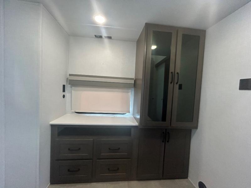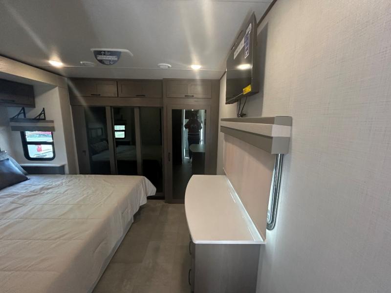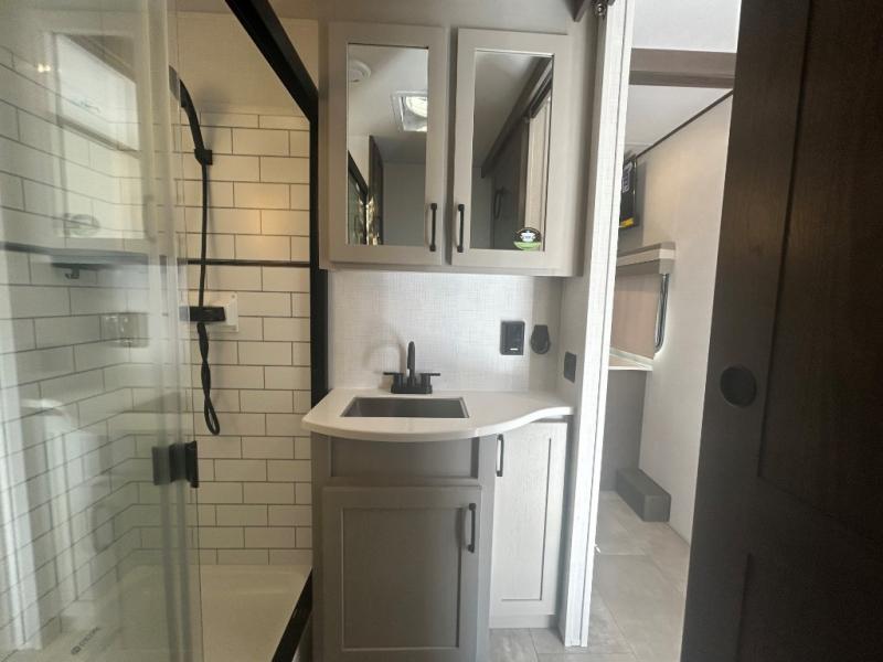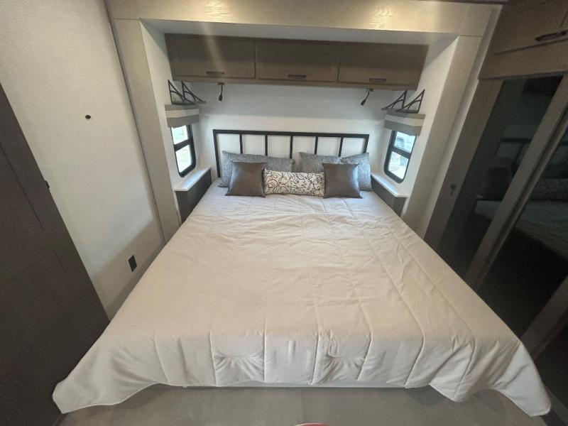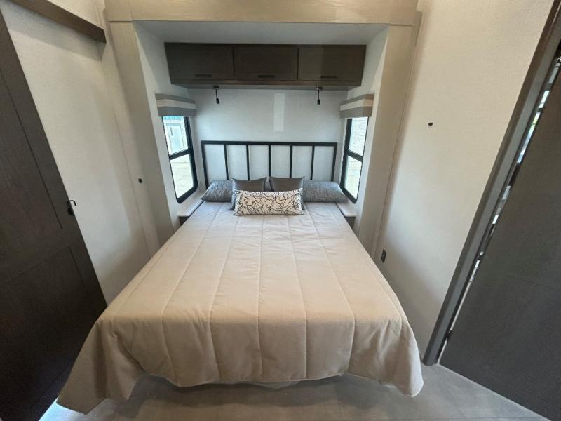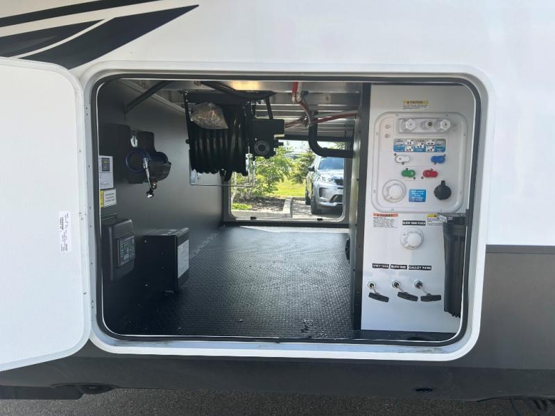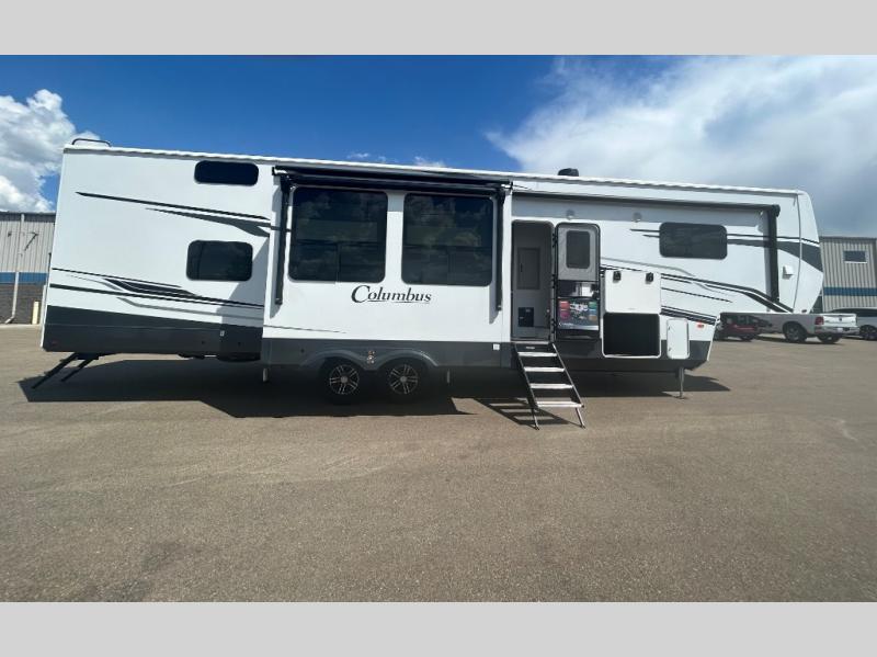 Experience a different camping life with residential furnishings and high end features in each one of these Palomino Columbus fifth wheels! The 101" wide body lets you walk around more throughout and the all-welded aluminum-frame superstructure has a snap-in ceiling molding to hold up through every adventure. Don't leave any of your gear behind either when you can easily store it in the climate controlled drop frame storage area. On the exterior, you'll find a heated utility convenience center, an outside sprayer to keep the dirt outside where it belongs, and magnetic compartment door holds to keep them from falling on you as you grab your items. Plus, there are some modern features that will really seal the deal like the Wi-Fi Booster with 4G LTE capability prep, upgraded true solid-surface countertops, power theater seating with USB charging, and a 260W solar panel for off-grid camping!