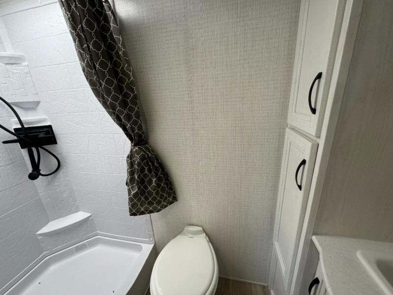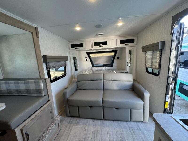 Head to your favorite spot with your favorite person in this travel trailer! The front Murphy bed offers versatility with a sofa to sit on during the day and a 60" x 80" queen bed to sleep on at night, plus there are wardrobes on either side for your clothes. Prepare your best home cooked meals with the two burner cooktop, 10 cu. ft. refrigerator, and even the microwave then enjoy them at the 38" x 70" booth dinette slide which can be transformed into an extra sleeping space. You even have an entertainment center for those days when mother nature rains on your parade. The full rear bathroom has a 32" x 32" radius shower to clean up in after a fun day at the beach and a linen closet to keep your towels close. The exterior has a 14' power awning with LED lights to highlight the good times and front outside storage to bring all of your camping necessities!