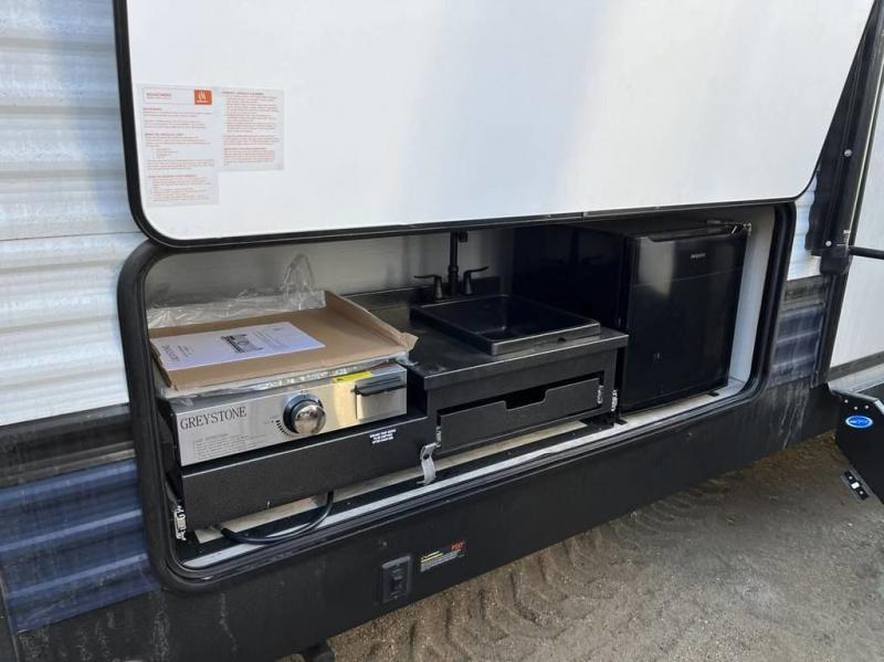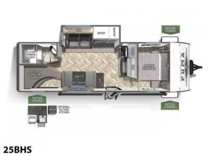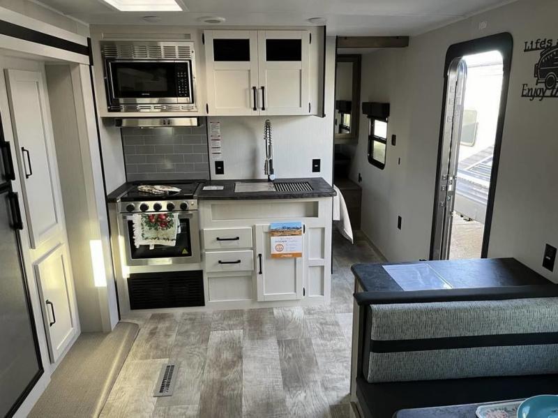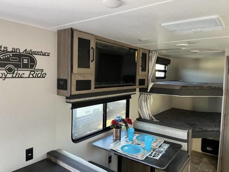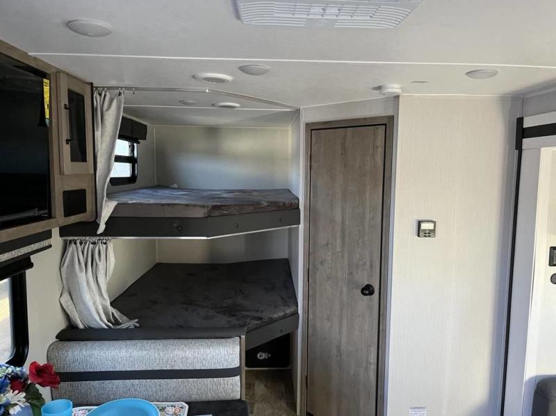 There's room for the whole family in this travel trailer! You will enjoy your own privacy with the front private bedroom which features a 60" x 74" RV queen bed with shirt closets on either side to hang your clothes, and a shelf above for your books or alarm clock. The kiddos can sleep on the set of 48" x 76" double bunk beds with storage underneath. They can even invite a friend or two to join in on the fun and sleep on either the sofa or booth dinette once converted. Everyone can freshen up in the rear corner bathroom with a 32" x 40" shower with a seat, and keep their bellies full with the three burner cooktop. You could even choose to add the optional outside mini kitchen if you enjoy cooking outdoors!