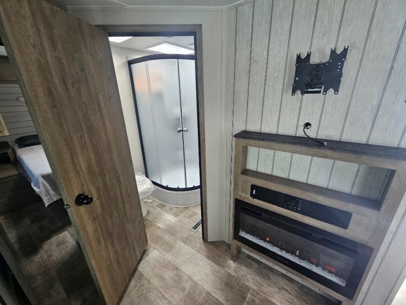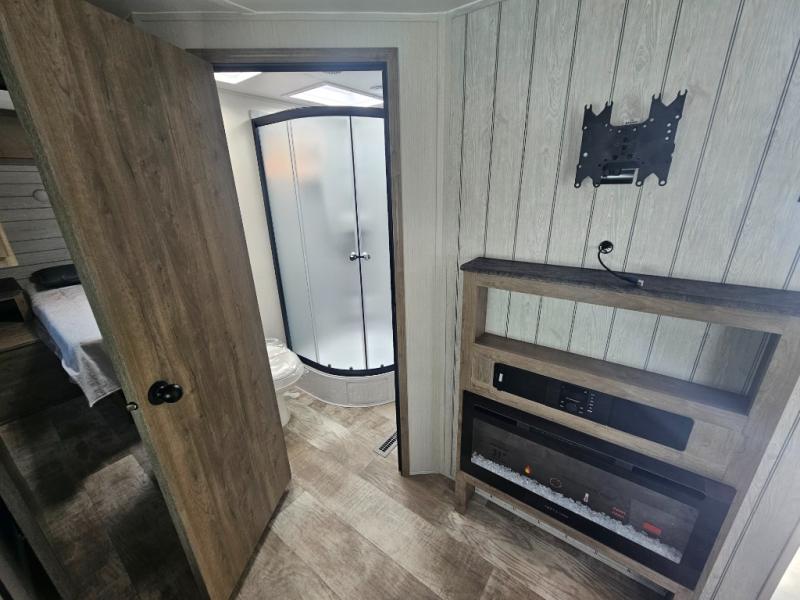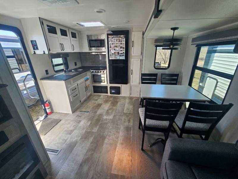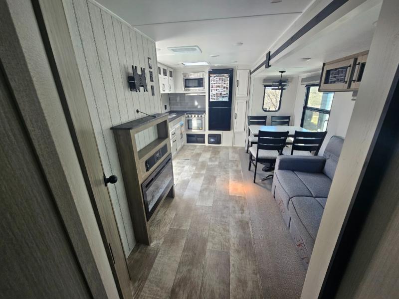 The chef will love cooking in the rear kitchen of this travel trailer! The booth dinette offers a comfortable place to dine, play, and even sleep. Take an afternoon nap on the sofa and watch your favorite movies at night with the entertainment center, and you may want to add the optional fireplace here to make it feel more like home. Start your mornings off feeling fresh by showering in the full bathroom with the 34" x 34" radius shower after getting a good night's rest on the queen bed in the front private bedroom! You can also add the optional outside kitchen if you like more time outdoors!