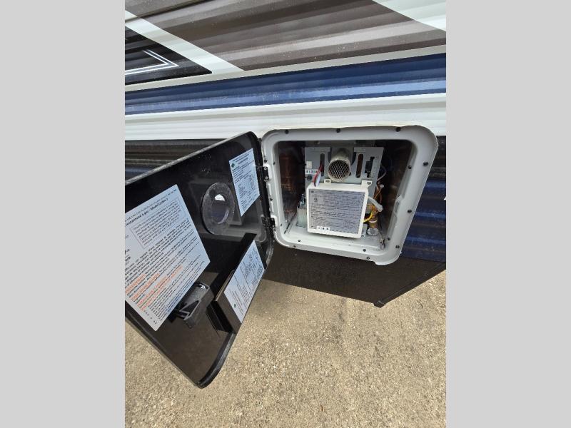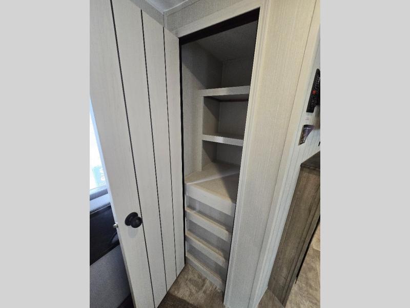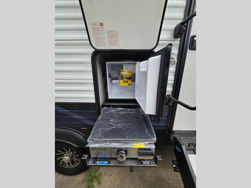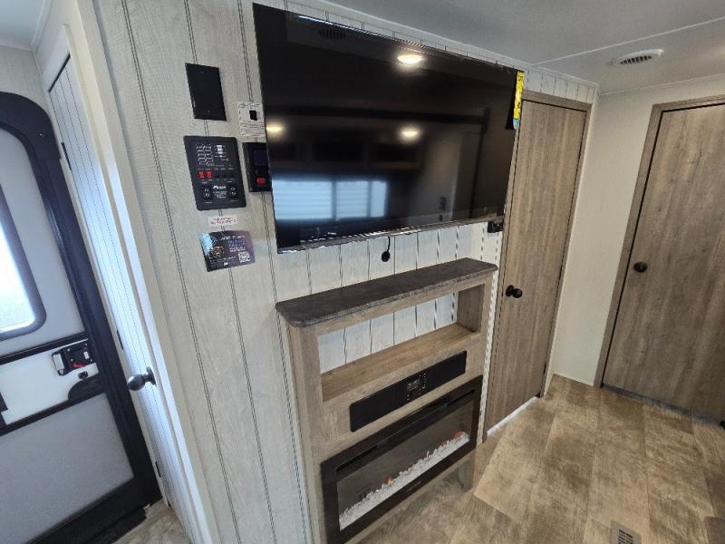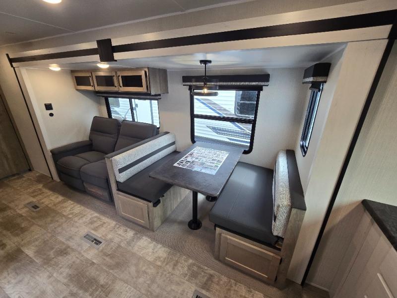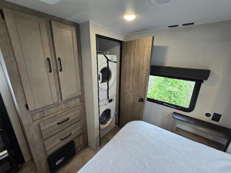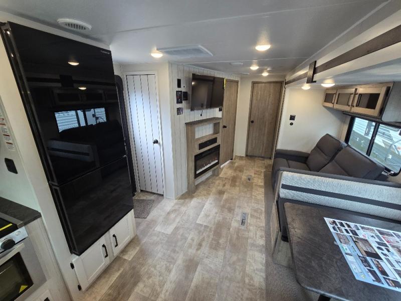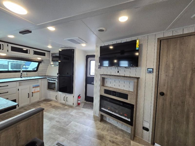 Walk into this travel trailer with one of the dual entry doors for a great camping trip! One entrance enters directly into the rear private bedroom which has a queen bed slide, a walk-in closet that is prepped for an optional washer and dryer, a wardrobe, and even an entrance into the dual entry bathroom. Grab a snack from the walk-in pantry then relax on the sofa while you watch a movie with the entertainment center or play a game at the booth dinette. The front kitchen has everything you will need to prepare your best home cooked meals including lots of countertop space, a three burner cooktop, and a residential refrigerator, plus you can add the optional outside kitchen more more cooking areas!