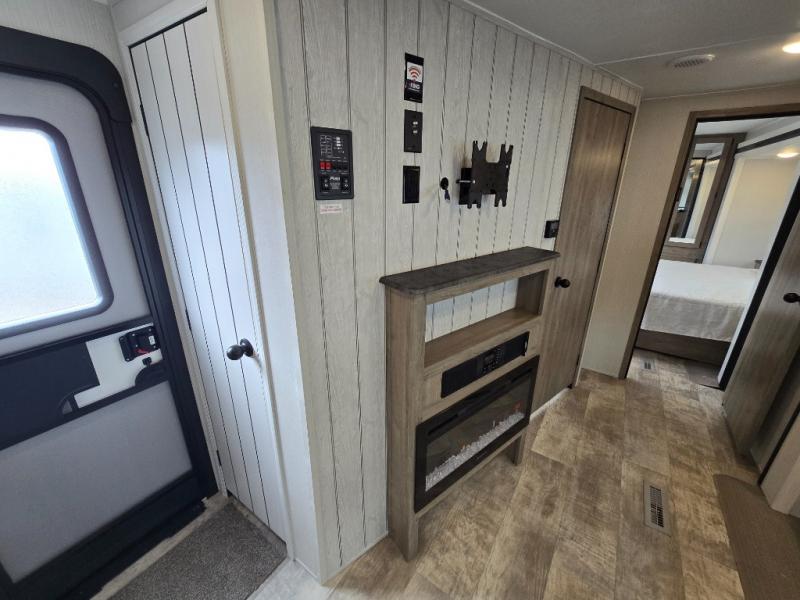 Walk into this travel trailer with one of the dual entry doors for a great camping trip! One entrance enters directly into the rear private bedroom which has a queen bed slide, a walk-in closet with washer and dryer prep, a wardrobe, and even an entrance into the dual entry bathroom. Grab a snack from the walk-in pantry then relax on the sofa while you watch a movie with the entertainment center or play a game at the booth dinette. The front kitchen has everything you will need to prepare your best home cooked meals including lots of countertop space, a three burner cooktop, and a stainless steel refrigerator.