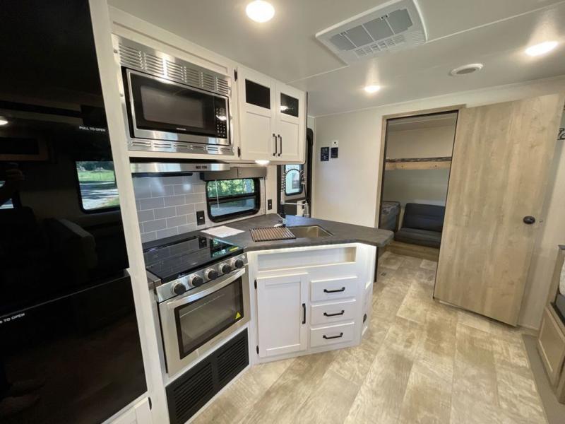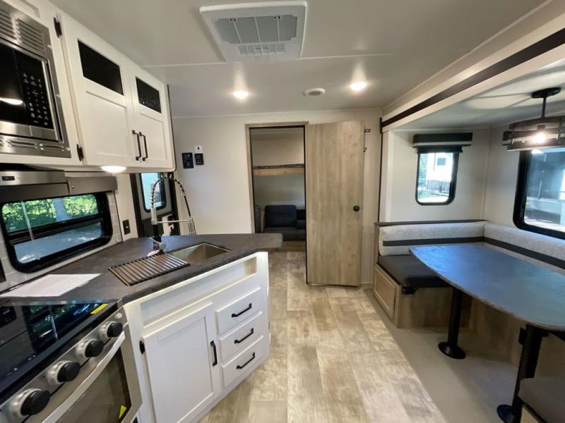 There's a comfortable place to sleep for the whole family in this travel trailer! The rear private bunkhouse has a set of 28" x 76" bunk beds, a 28" x 65" bunk above a sofa, and a wardrobe with an entertainment center above it so they can bring a cousin or two to join in on the fun. You will have your own privacy with the front private bedroom which has a queen bed with shirt closets and nightstands on either side of it. The spacious full bathroom has a 34" x 34" radius shower for everyone to freshen up and one of the entrances leads directly outside so you can get back to having fun fast. Prepare your best home cooked meals indoors with the walk-in pantry, the three burner cooktop, and the 11 cu. ft. stainless steel refrigerator. Plus, there is a U-shaped dinette to enjoy your meals and even transform into an extra sleeping space! Choose the optional outside kitchen for even more convenience!