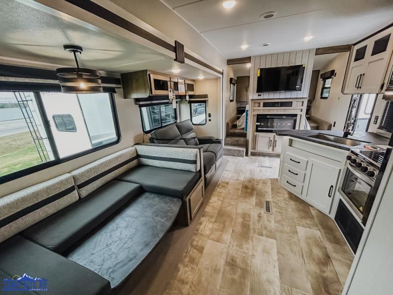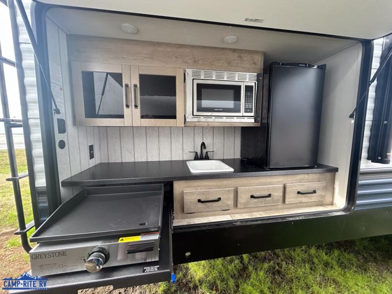 With a rear private bunkhouse in this fifth wheel, your kids or guests will have a comfortable place to lay their head at night! Inside the bunkhouse is a 38" x 76" bunk above an entertainment center and a 32" x 69" bunk above a jiffy sofa slide. The U-shaped dinette and sofa slide can also transform into extra sleeping spaces when you aren't using them to watch a movie across from the entertainment center or enjoying a meal. And the optional fireplace can be added for a more at-home feel. Everyone can stay squeaky clean with the 32" x 40" shower with a seat in the full bathroom, and their bellies full with the indoor three burner cooktop. And don't overlook the outside kitchen options; one with a griddle, sink, and refrigerator, and one with a griddle, sink, refrigerator, and microwave!