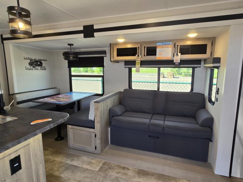 With two full bathrooms, it's a clean decision to take this travel trailer on your next family vacation! Start each morning feeling recharged after sleeping on the queen bed in the front private bedroom or in the rear private bunkhouse with an angled top bunk above a 32" x 69" double bunk bed and a 32" x 69" bunk above a 68" sofa slide. The bunkhouse also has a full bathroom with a 24" x 40" tub and one of the dual entry doors to the unit. You can relax on the sofa while enjoying the entertainment center and eat your meals prepared with the kitchen island at the booth dinette. You can also choose the outside kitchen option for more convenience!