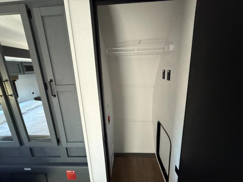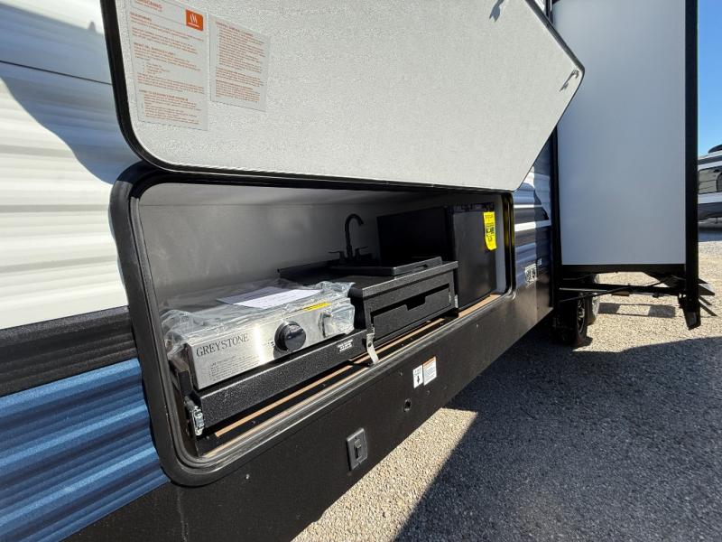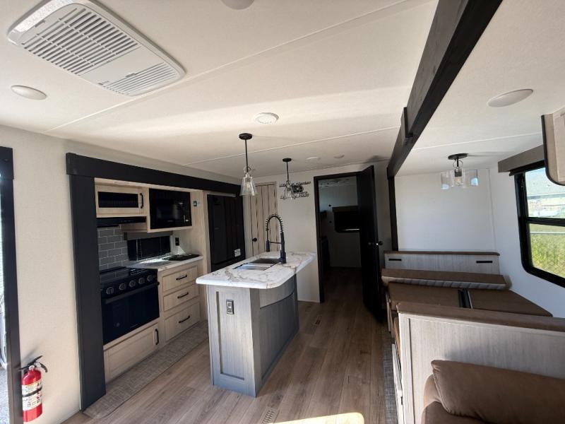 You will be the talk of the campground with this travel trailer! The front private bedroom has a queen bed slide across from a dresser and a front closet plus a second closet with washer and dryer prep . Freshen up each morning in the full bathroom with the 34" x 34" radius shower then head to the kitchen to fry up some eggs on the three burner cooktop. You can enjoy your meals at the booth dinette and the kitchen island will make your clean up easier with the sink that has a high rise faucet and sprayer. The rear private bunkhouse has a 32" x 69" bunk above a jiffy sofa slide, a 36" x 69" bunk above a 36" x 71" bunk and a linen closet. Choose the optional outside mini kitchen for even more convenience!