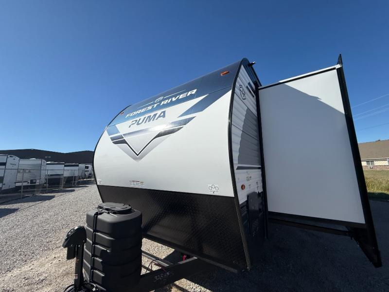 If you're looking for family-fun adventure then you need one of these Palomino Puma fifth wheels or travel trailers! They are built rugged, easy to tow, and jam packed with features. The Darco wrapped underbelly will protect your units vitals through every season and the AlphaPly roofing membrane covers it. They also have super lube axles and a powder coated frame. Their luxurious interiors feature a spice rack and built-in knife rack in the kitchen, USB charging ports to keep your electronics at 100%, and high density foam mattresses for a good night's rest. The required Advantage package comes with night roller shades for privacy at night, two outside speakers to crank up the tunes while you play cornhole, and an outside shower to keep the dirt outside where it belongs, plus so much more!