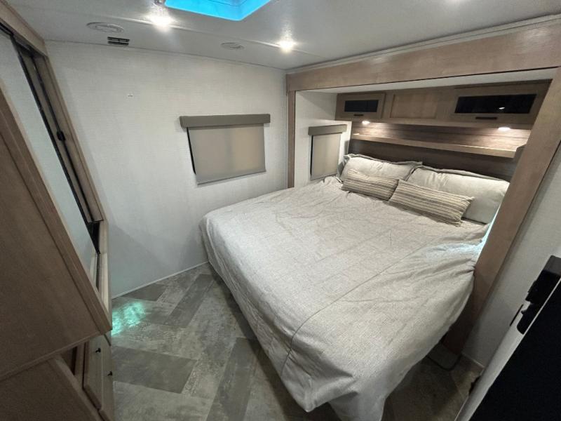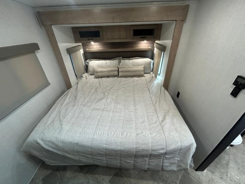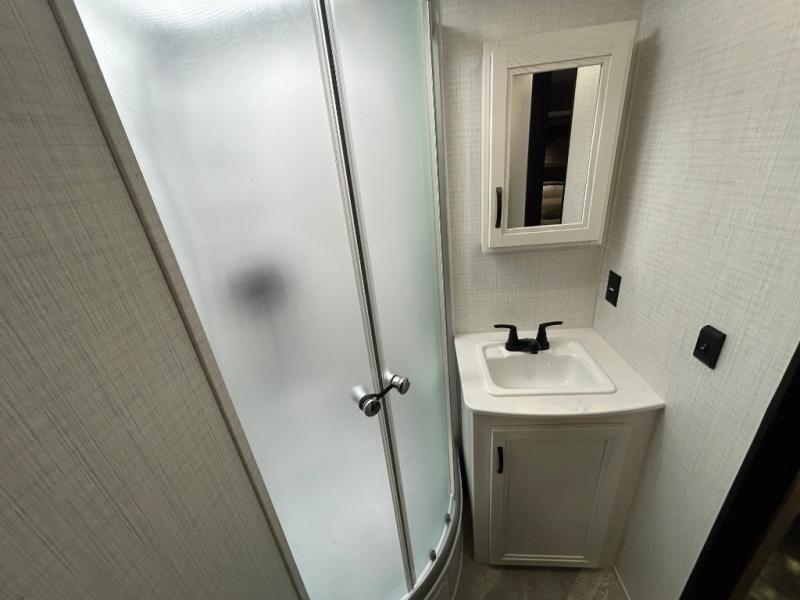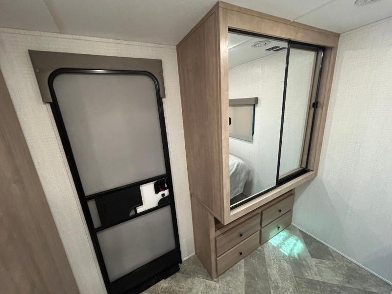 This dual entry, dual slide out travel trailer will provide at-home comforts while you're at the campground. You will love the rear master bedroom with a king bed slide out and a spacious wardrobe for your clothes, plus you have your own exterior entry here and access to the walk-through bath. The main living area is spacious with its dinette slide, plus a front kitchen with ample counter space. There is also a pantry, an entryway closet, plus outside storage for your camping gear and belongings.
