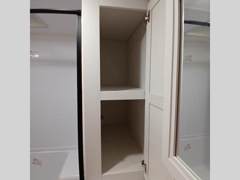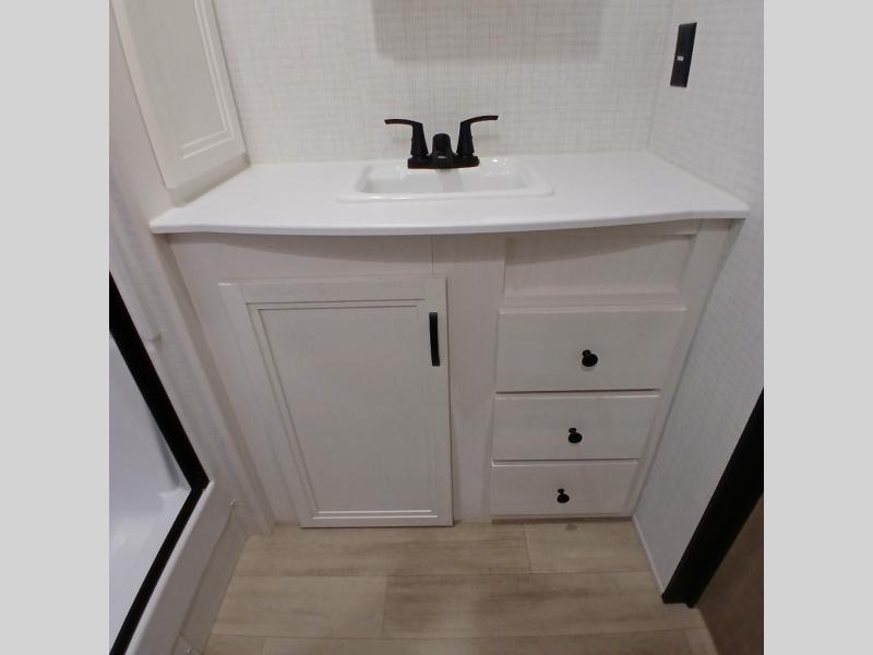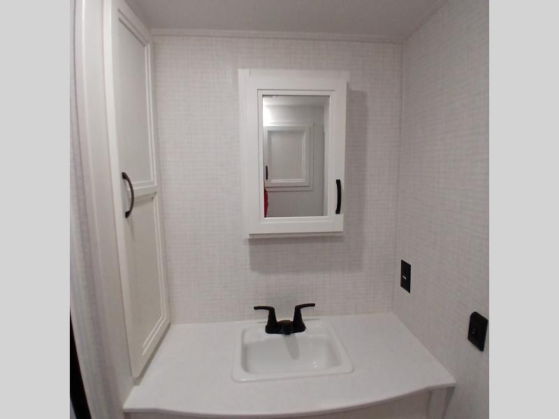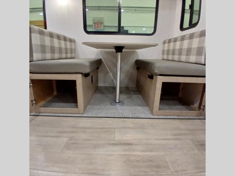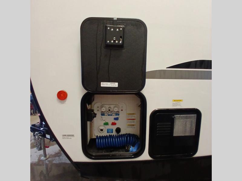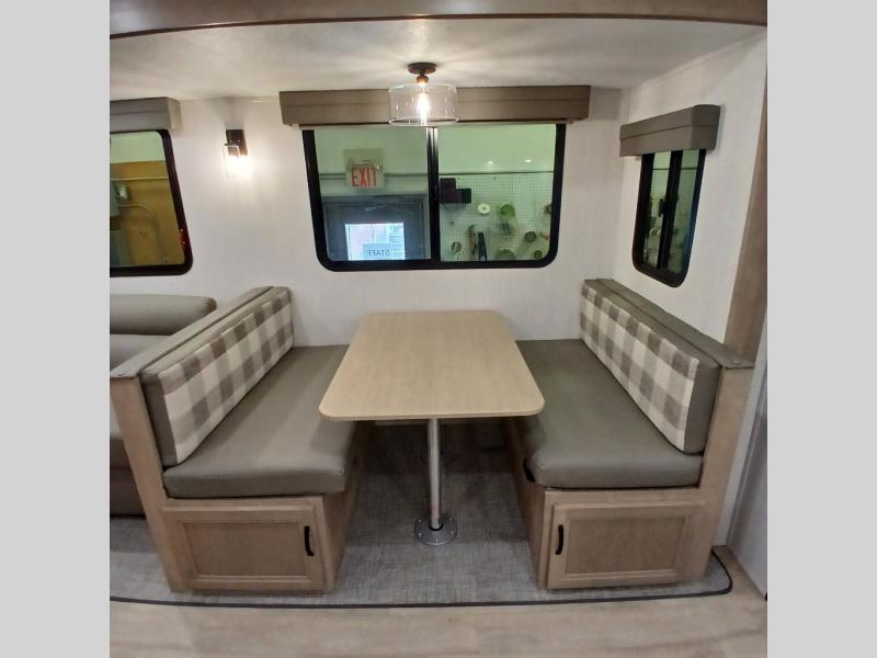 The large slide out in this trailer offers seating and sleeping space on a sofa sleeper and a booth dinette plus adds more floor space to the main living and kitchen area. The rear full bathroom has a 30" x 48" shower and a linen closet for towels and such, and the front bedroom includes a queen bed and clothing storage plus windows for views of your campsite. The cook will have the choice of making meals inside with full amenities including an 11 cu. ft. refrigerator and an L-shaped counter or outdoors on the outside kitchen. The 19' power awning provides an outdoor living area protected from the elements, and the exterior offers several storage compartments so you don't have to leave anything behind.
