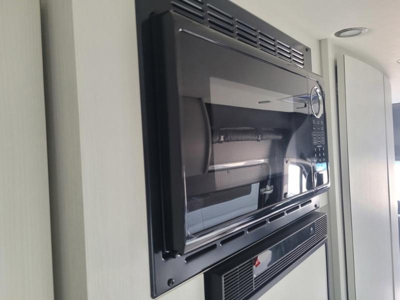 This Plateau Class B diesel motorhome features two dining locations for you to enjoy your delicious meals at thanks to the innovative Lagun table. There is also an array of storage options between the overhead cabinets, the soft-close drawers, and the pull-out pantry. If you have to get a little bit of work done while on the road, then you will love the front lounge workstation with a 120V power outlet, USB charging ports, and an extended Corian countertop with a privacy shade and storage cabinets too. The microwave makes it easy for you to pop a bag of popcorn and enjoy eating it while you relax on the power sofa with memory foam sofa cushions!