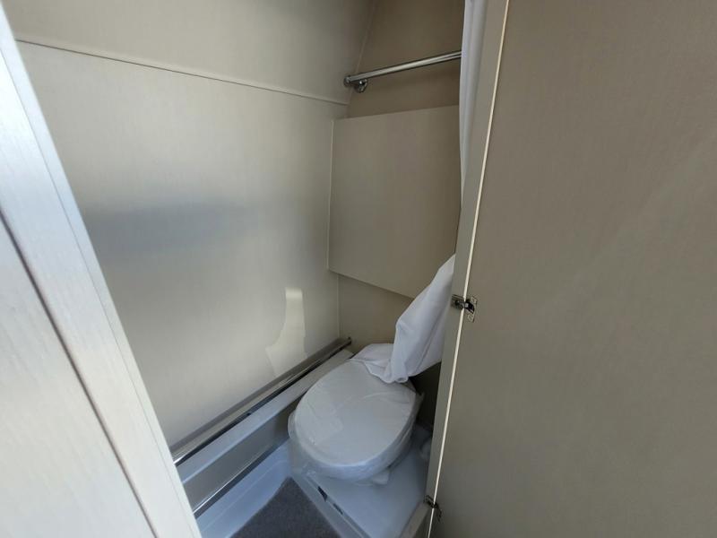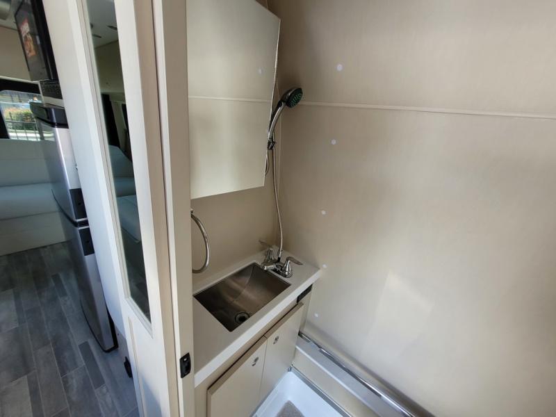 You will experience a comfortable ride in this Plateau Class B diesel motorhome with memory foam sofa cushions. The wet bath comes fully equipped with a medicine cabinet including a mirror, a Corian countertop, a towel rack, and a handheld showerhead. The exterior shower also has a handheld showerhead to make rinsing off the evidence of a fun-filled day even easier before heading inside. All of the seating throughout is covered in Ultraleather fabric, including the swiveling captain's chairs. With a generous amount of available storage in a full-size wardrobe, you can easily reach any of your hang-up clothes!