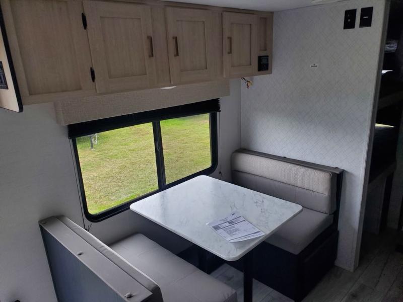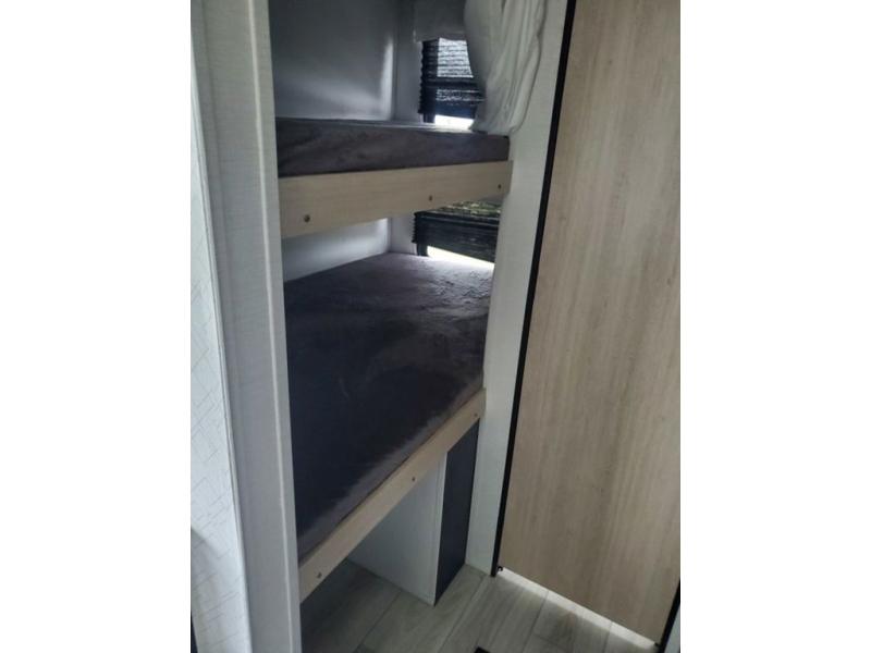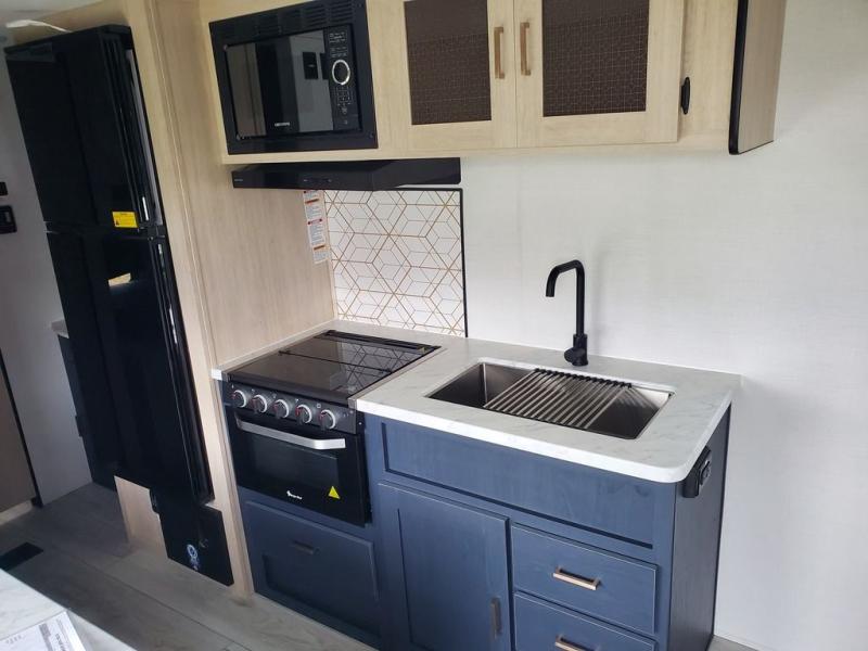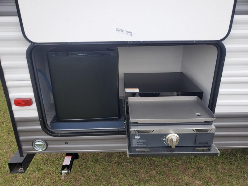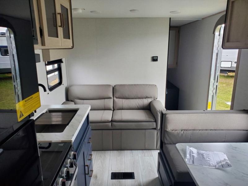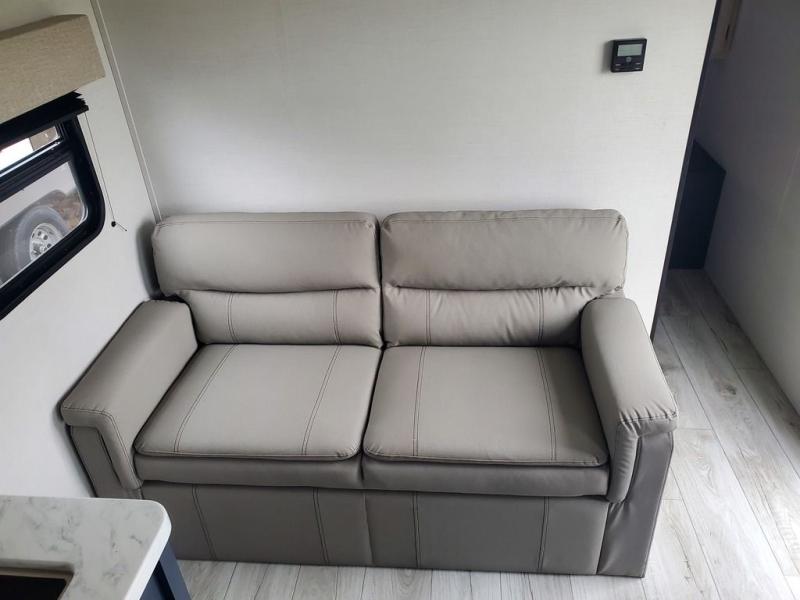 The cook is going to enjoy having choices for every meal, whether to use the full kitchen amenities inside or the outdoor kitchen while visiting with others relaxing under the 13' power awning. With the inclusion of a walk-around queen bed in the front bedroom, plus the sofa and booth dinette in the combined kitchen and living area, and the double-size bunks next to the bathroom sink and private toilet and toilet room, there is plenty of room to sleep eight or nine people each night. And the power awnings plus outdoor speakers give you an additional living area for everyone.