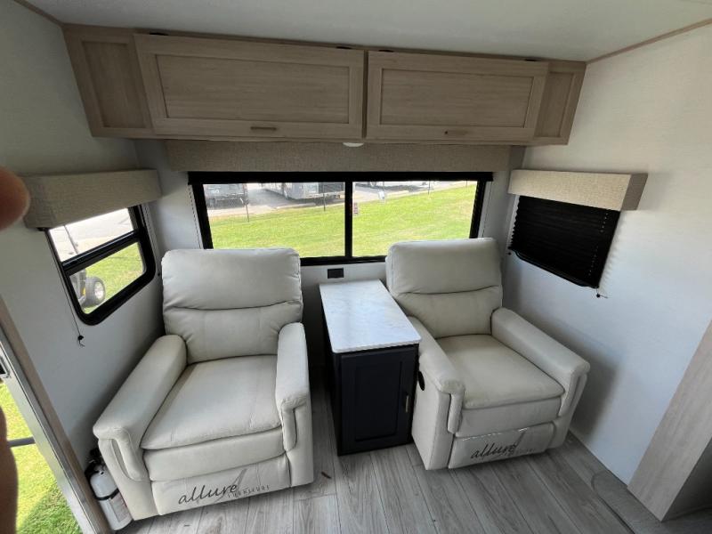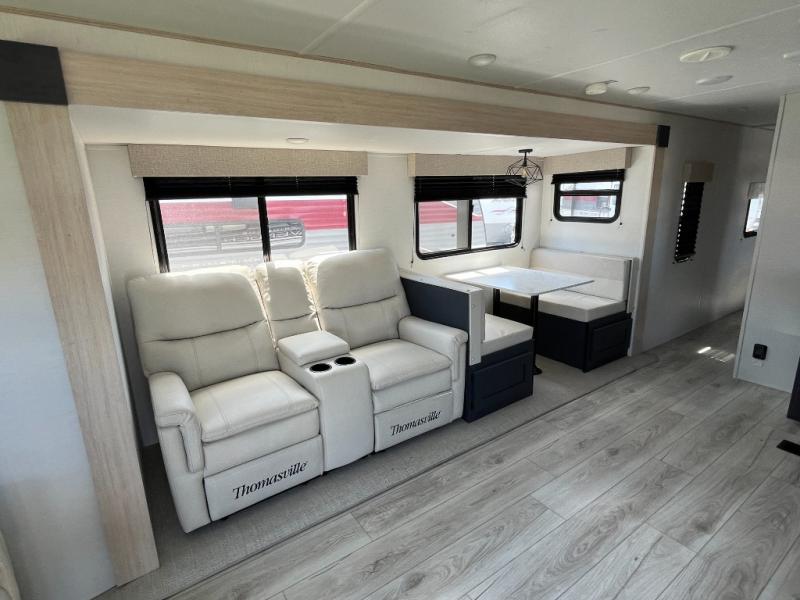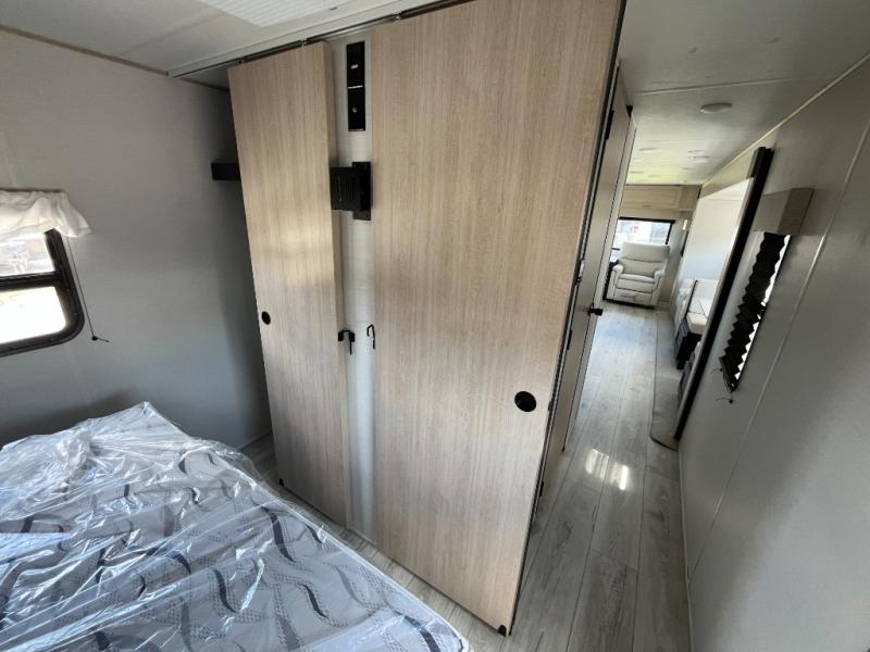 Why not have your own accommodations when you travel? Whether you want to explore outdoors or just have your own living space when away, this RV gives you convenience and comfort throughout. You will love having your own bedroom to retreat to each night with a queen-size bed, bedside wardrobes, and an additional closet for extra storage. You will also find that the main living area is a great place to relax with its two recliners, sofa, and booth dinette, and since these pieces of furniture are directly across from the entertainment center and fireplace, you will have an even more enjoyable time spending your evenings there. The pantry will hold onto your favorite snacks so that they are ready to go for movie night, and you can even prepare something more delicious by using the three-burner range to whip up some grilled cheese sandwiches.