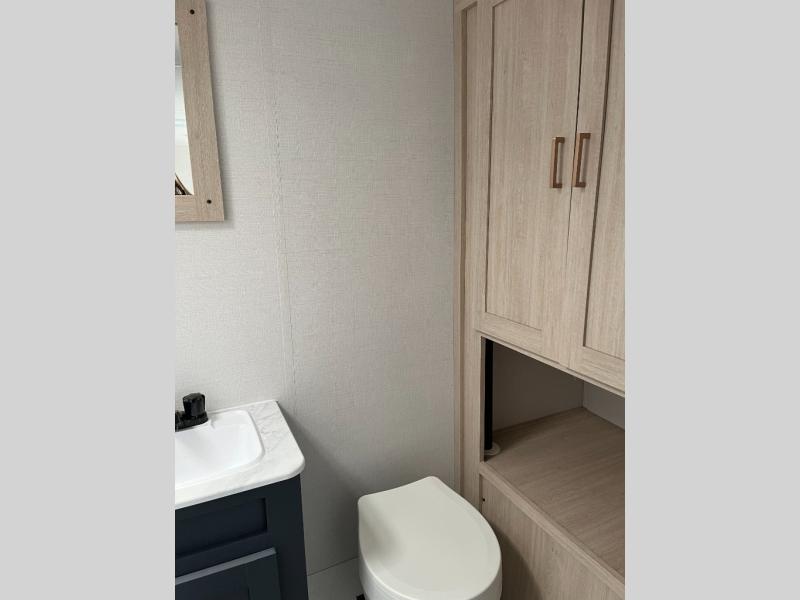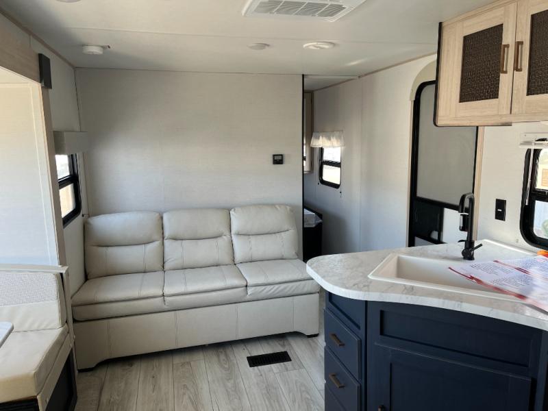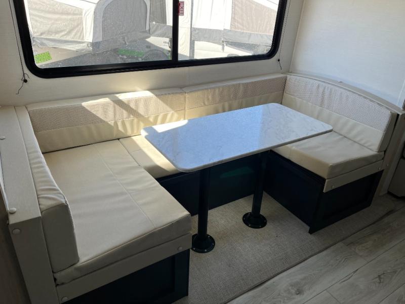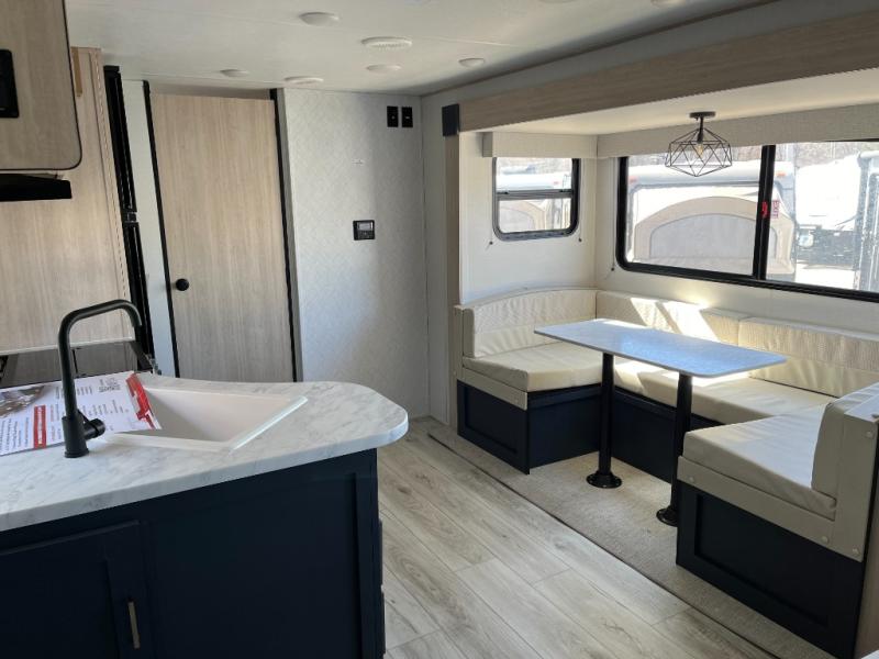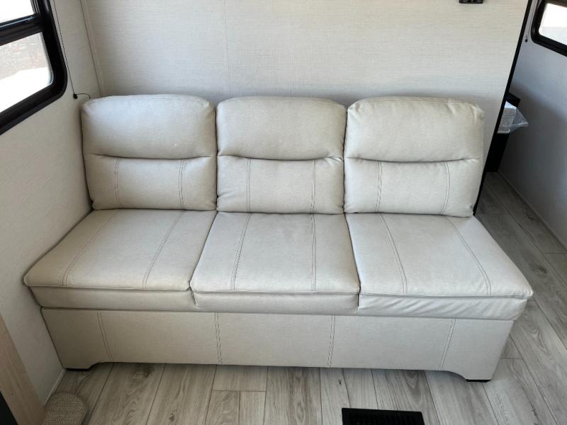 This rear bath travel trailer offers privacy to change and get cleaned up as well as includes linen storage so you will have everything you need in one place. The walk-around queen bed in the private bedroom, plus the furniture which folds down into extra sleeping space at night allows five or six to sleep comfortably after hiking or relaxing and enjoying the outdoors. The cook will appreciate the three-burner range to make snacks and meals to eat at the U-shaped dinette slide or outside under the 15' power awning that creates a covered outdoor living area protected from the elements.