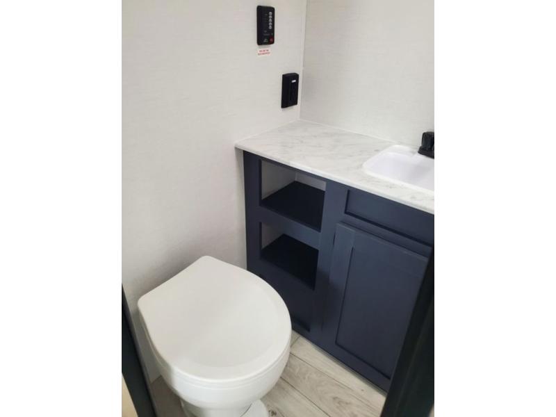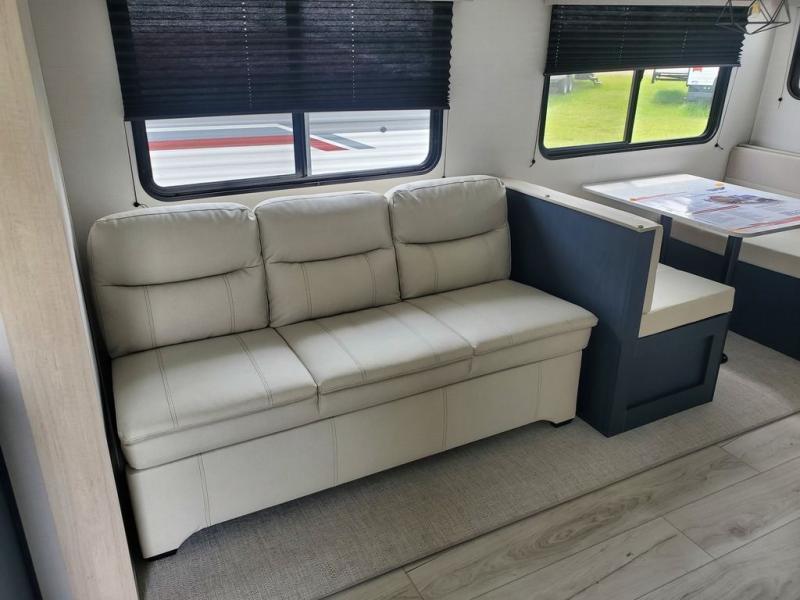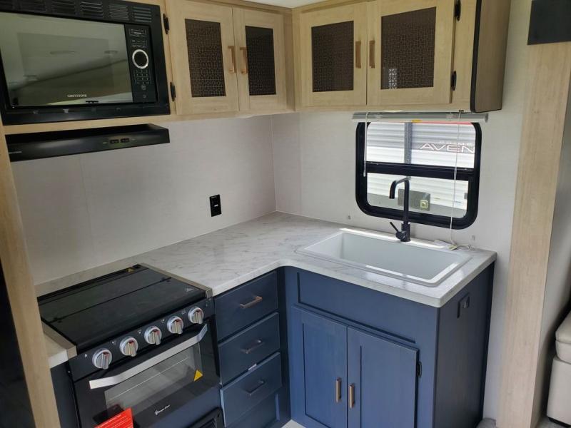 Enjoy each camping adventure with this Avenger LE model in tow! The rear kitchen is conveniently located near the entry door so packing up groceries and stocking the refrigerator is a breeze. You can easily cook up meals and snacks using the three burner cooktop and overhead microwave oven, and a nearby pantry will easily house all of your dry goods and snacks. A single slide sofa and booth dinette offers ample seating when inside, plus adds an open floorplan to move about. A private front bedroom with a space saving sliding door provides cross ventilation with opposing windows, plus dual bedside wardrobes and an overhead shelf for your things. And, a full bath offers at-home conveniences with your own shower, toilet and sink, plus s medicine cabinet. No trips to the campground facilities in the middle of the night with this unit!