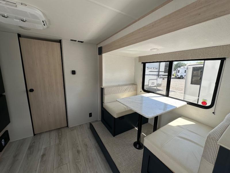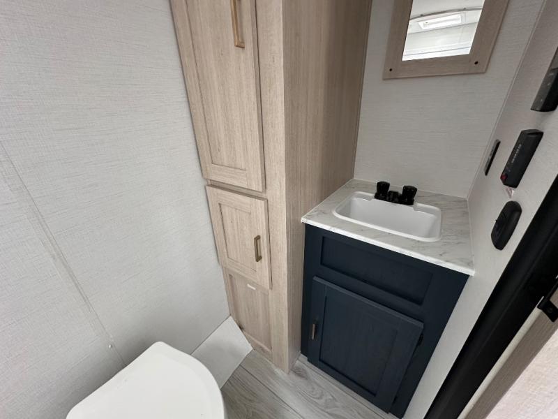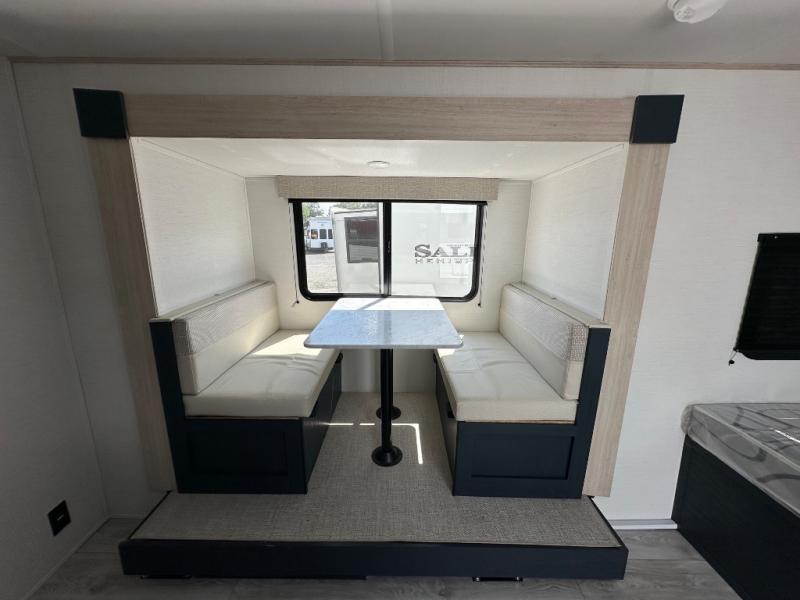 Enjoy a little more floor space in this trailer thanks to the dinette slide that can be utilized as a dining, gaming and/or sleeping space. The front walk-around queen bed offers overhead storage and dual wardrobes to keep this area tidy. The galley kitchen includes everything you need to make warm meals, and store leftovers in the 6 cu. ft. refrigerator, plus there is a pantry for dry good storage. The rear bathroom offers privacy and convenience when changing and getting cleaned up, and there is also linen storage which is handy.