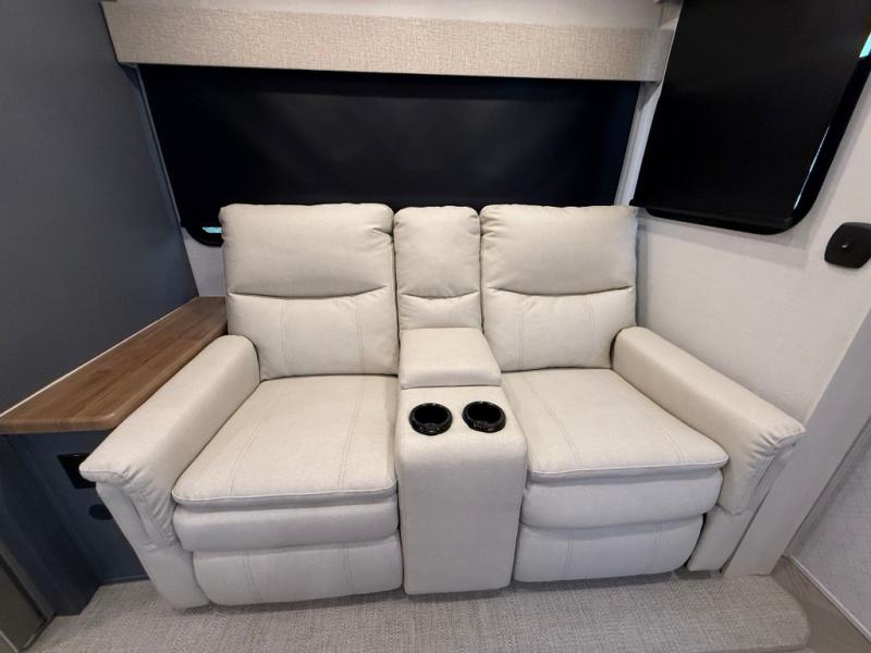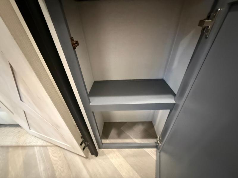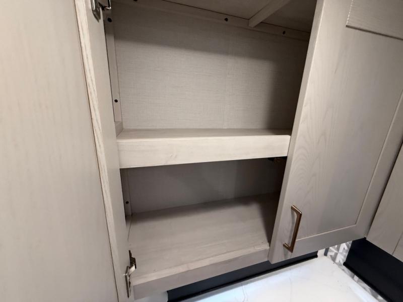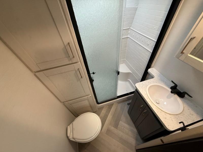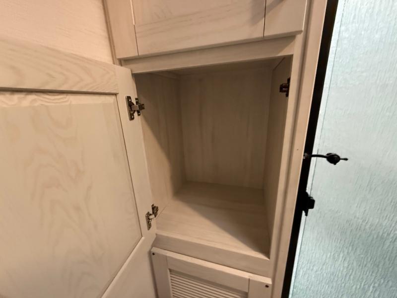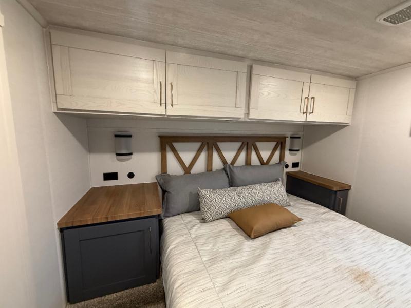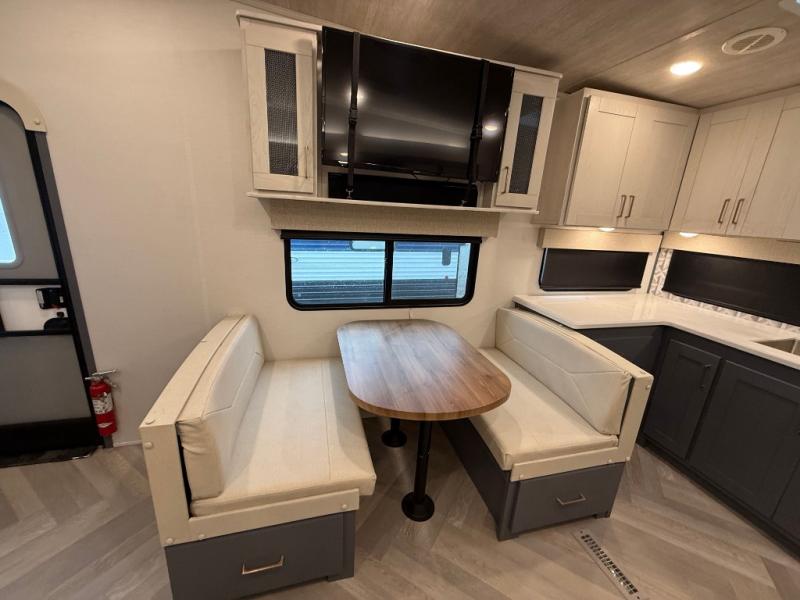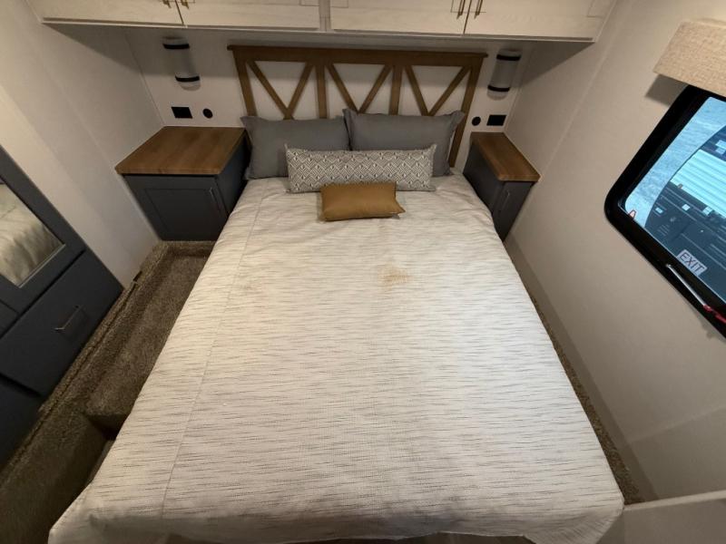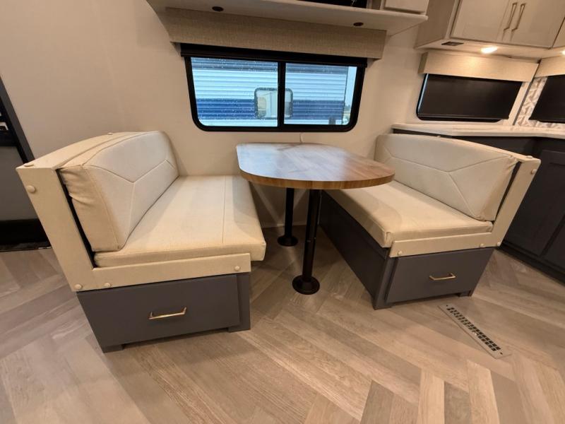 This is the perfect couple's trailer for all your outdoor excursions. The front private bedroom includes a queen bed, wardrobe slide, and dual nightstands to keep your clothes tidy. You can relax each day on the theater seating within the slide out, and the TV is in perfect viewing for movie night. The rear kitchen includes ample counter space, a three burner cooktop, plus a 16 cu. ft. refrigerator to keep food fresh. There is even a walk-in pantry for snacks! A booth dinette will be perfect for dining or to let an extra guests sleep over, and if you're not needing the extra sleeping space, just choose the optional free-standing table with four chairs. And don't worry about leaving your RV in the middle of the night to use the restroom; this model includes a full bath just like at home!