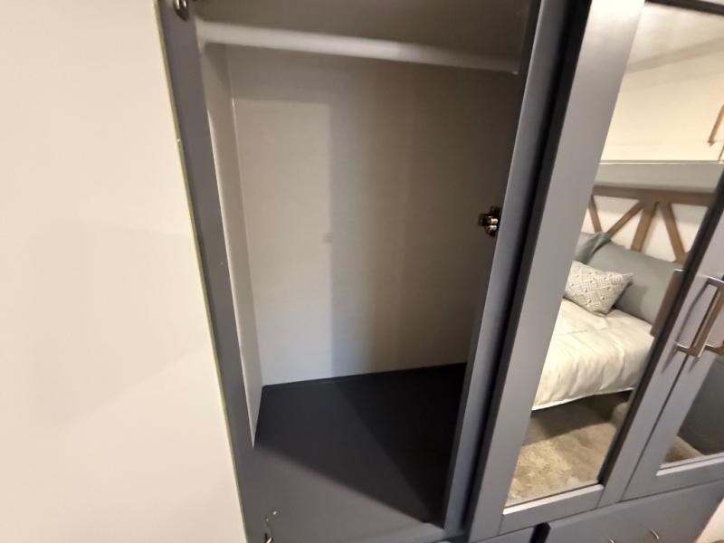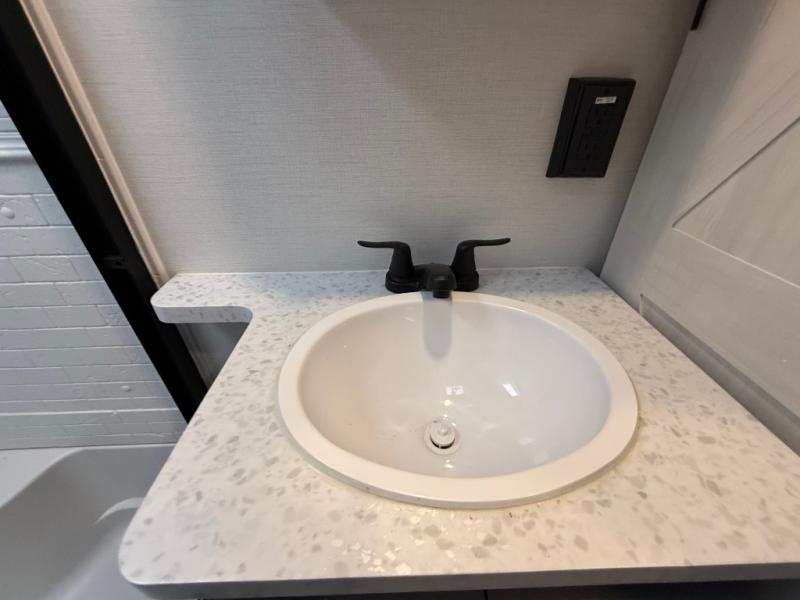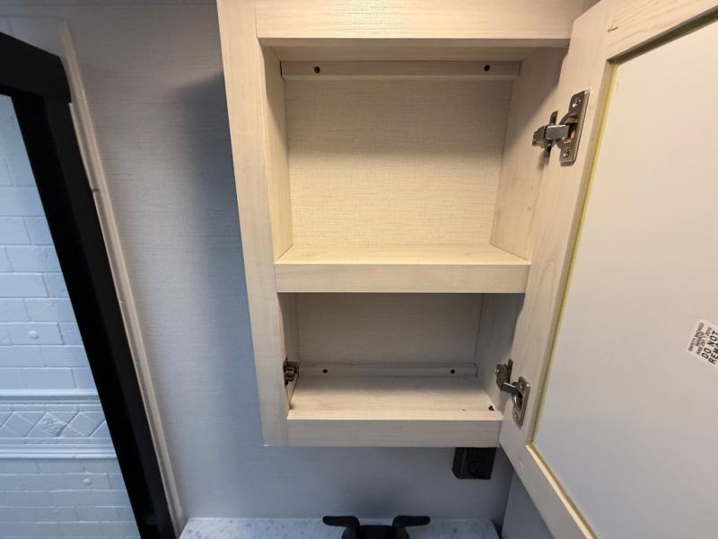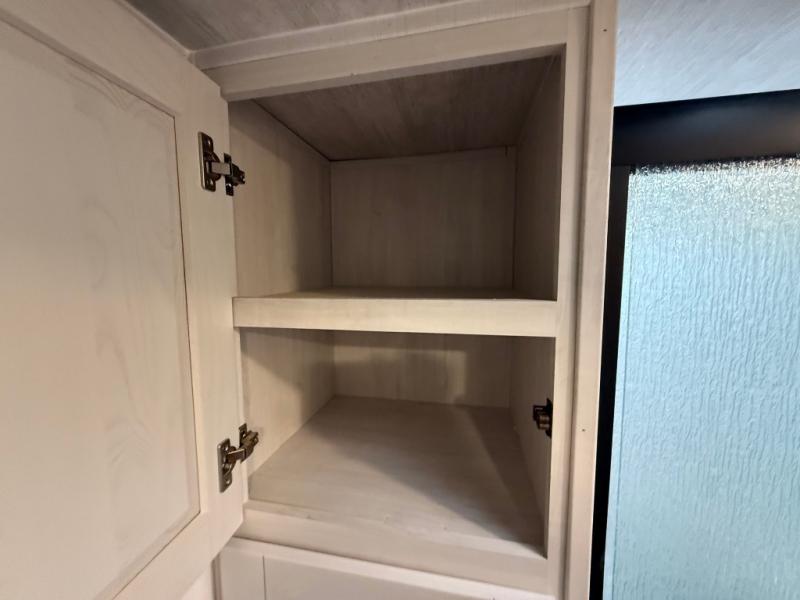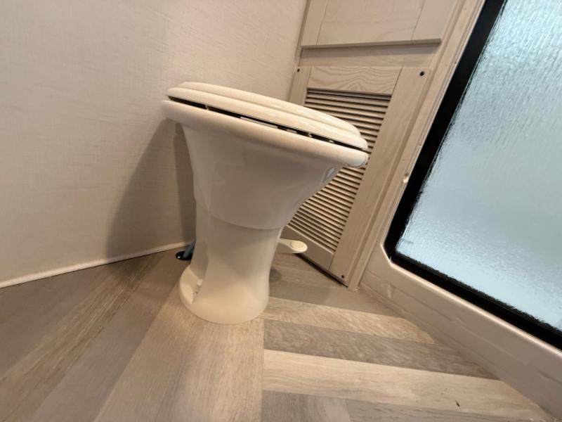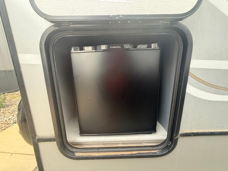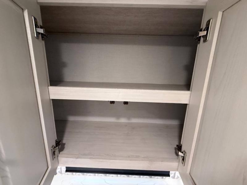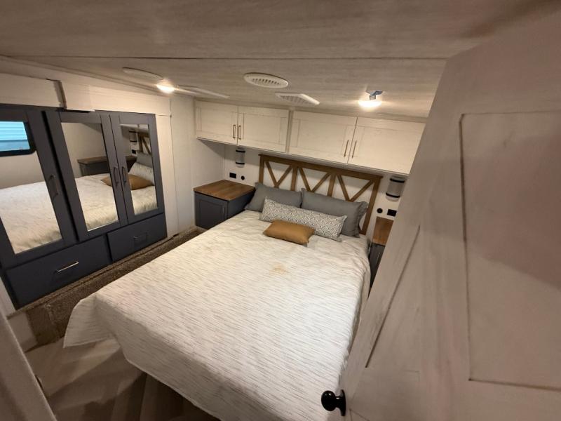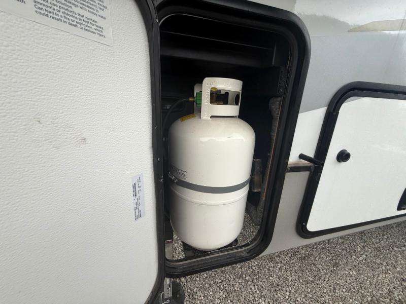 This is the perfect couple's trailer for all your outdoor excursions. The front private bedroom includes a queen bed, wardrobe slide, and dual nightstands to keep your clothes tidy. You can relax each day on the theater seating within the slide out, and the TV is in perfect viewing for movie night. The rear kitchen includes ample counter space, a three burner cooktop, plus a 16 cu. ft. refrigerator to keep food fresh. There is even a walk-in pantry for snacks! A booth dinette will be perfect for dining or to let an extra guests sleep over, and if you're not needing the extra sleeping space, just choose the optional free-standing table with four chairs. And don't worry about leaving your RV in the middle of the night to use the restroom; this model includes a full bath just like at home!