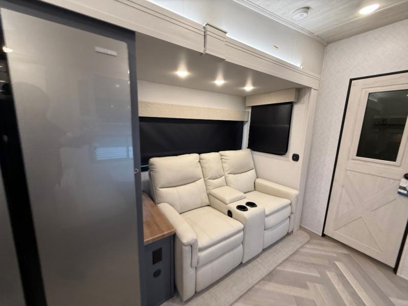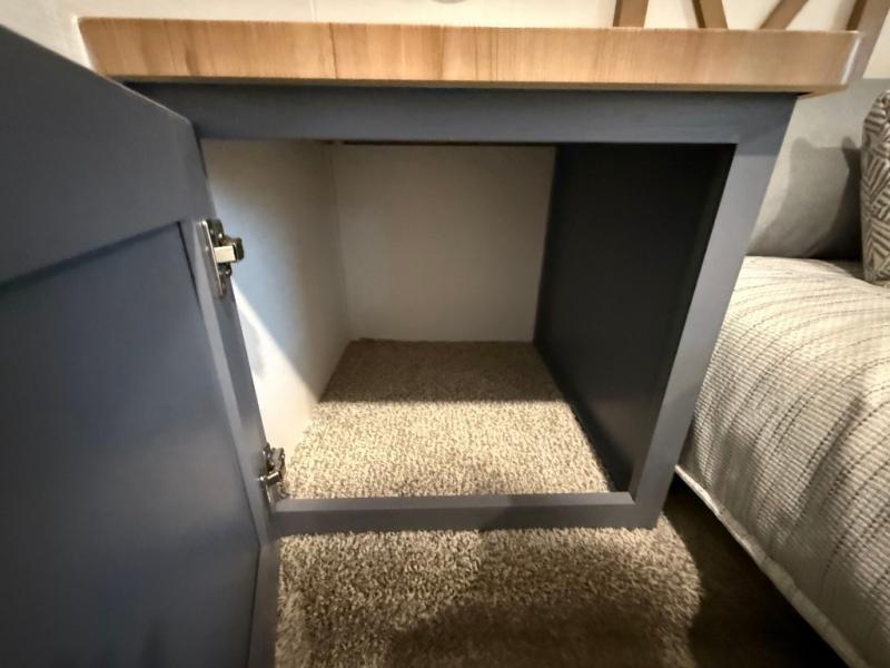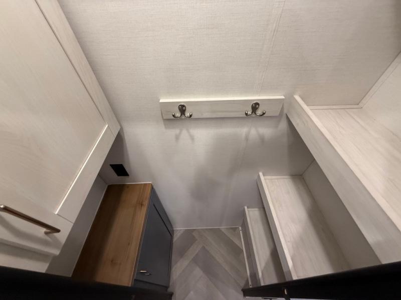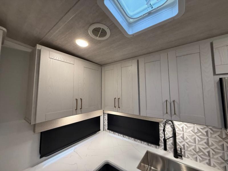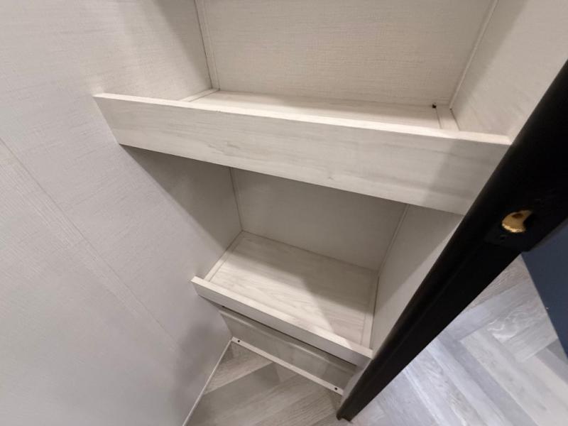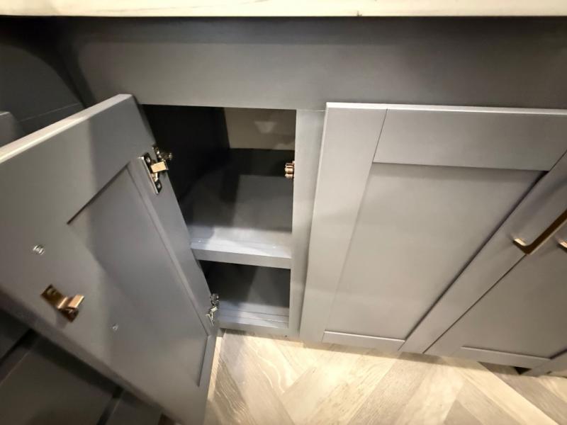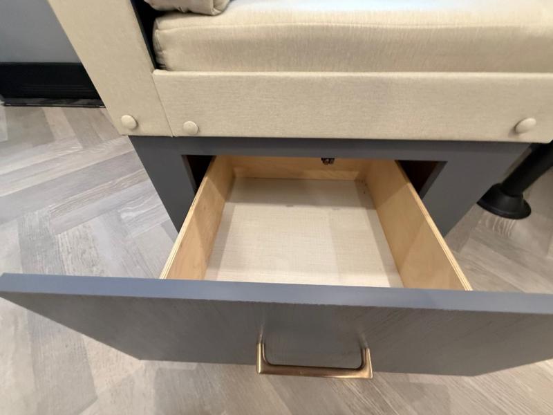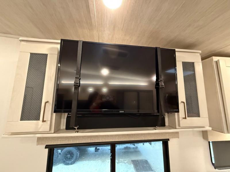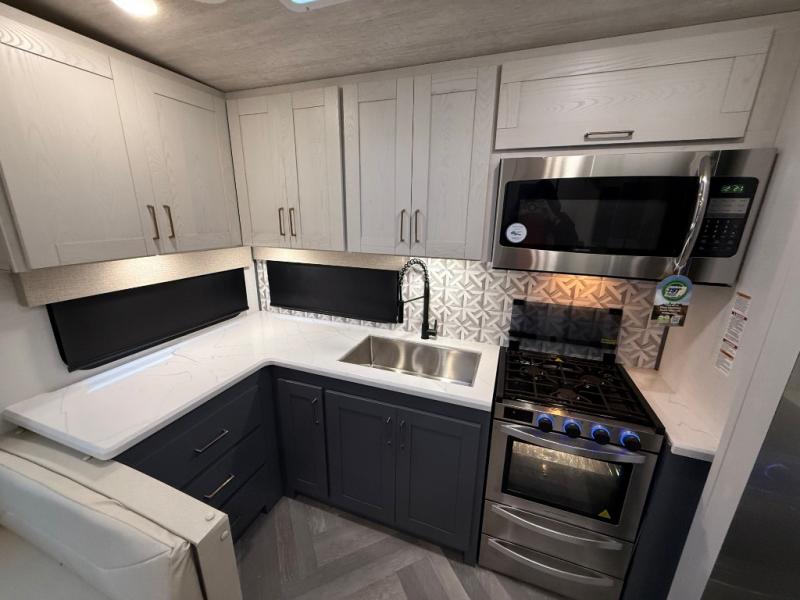 This is the perfect couple's trailer for all your outdoor excursions. The front private bedroom includes a queen bed, wardrobe slide, and dual nightstands to keep your clothes tidy. You can relax each day on the theater seating within the slide out, and the TV is in perfect viewing for movie night. The rear kitchen includes ample counter space, a three burner cooktop, plus a 16 cu. ft. refrigerator to keep food fresh. There is even a walk-in pantry for snacks! A booth dinette will be perfect for dining or to let an extra guests sleep over, and if you're not needing the extra sleeping space, just choose the optional free-standing table with four chairs. And don't worry about leaving your RV in the middle of the night to use the restroom; this model includes a full bath just like at home!