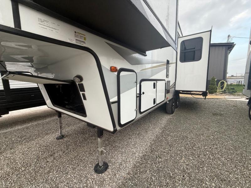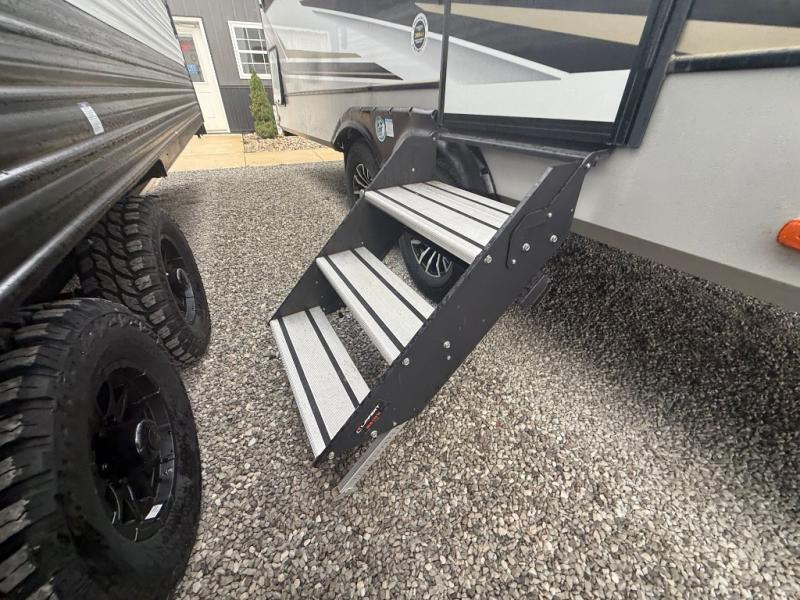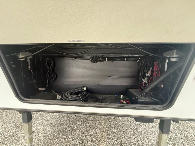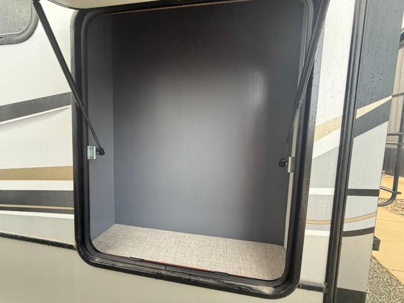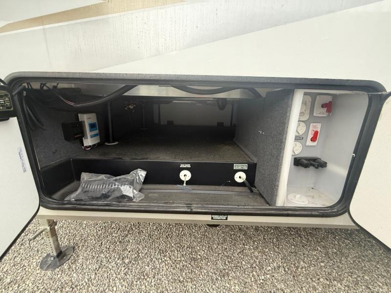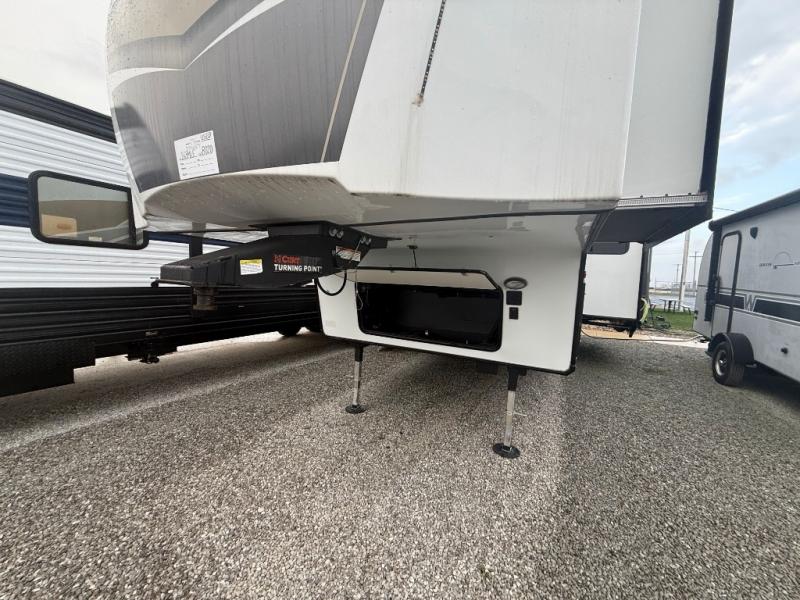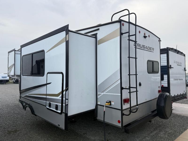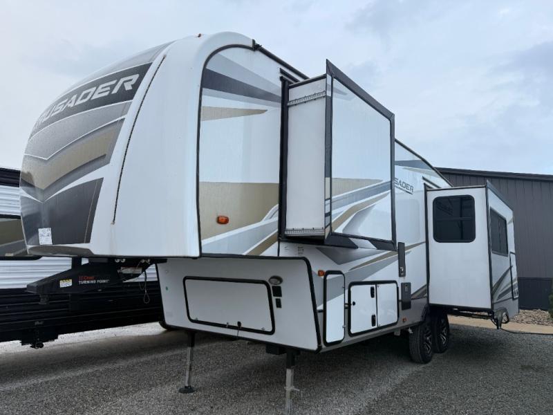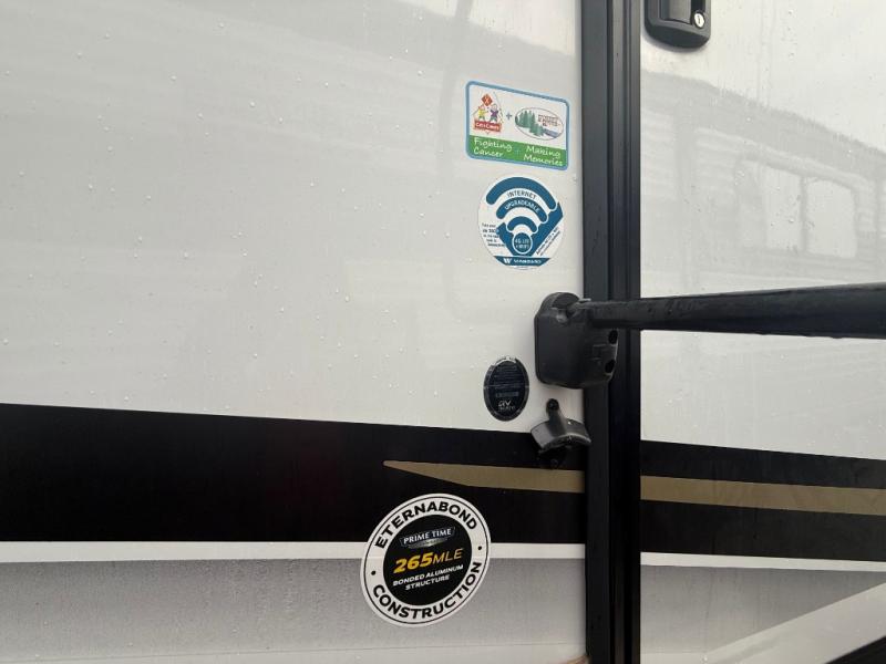 The Crusader fifth wheels by Prime Time RV are a step above the rest and it's not hard to see why. Each model has been constructed to last with its exclusive Eternabond construction, a one-piece TPO roof, and high gloss gel coat fiberglass exterior. The auto leveling system and the comprehensive universal docking center will have you set up to camp in no-time, and there is a convenient bottle opener and Doggy D-ring for your furry companions. You will fall in love with the interior that includes solid surface countertops, designer Carefree linoleum with Scotchgard technology, hardwood cabinet doors, and many more residential comforts. The Crusader also comes standard with dual "Whisper Quiet" ducted A/C's, a 35,000 BTU high capacity gas furnace, and the Extreme Thermal Package Plus, making your camping season year-around!