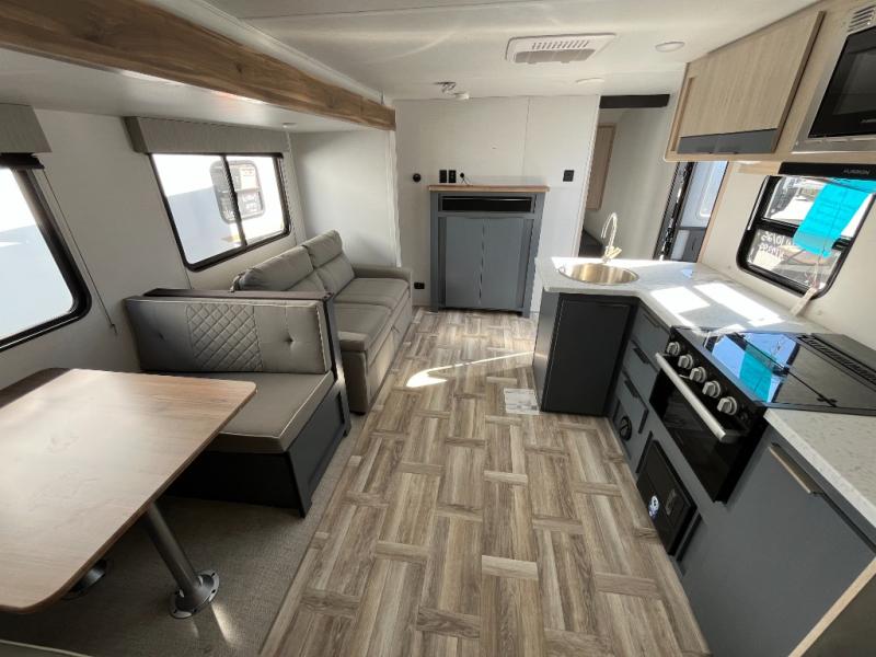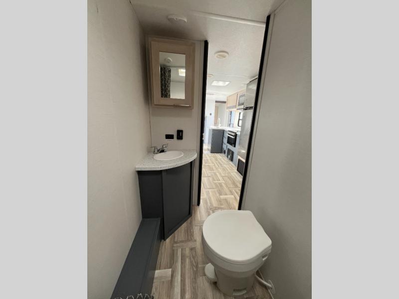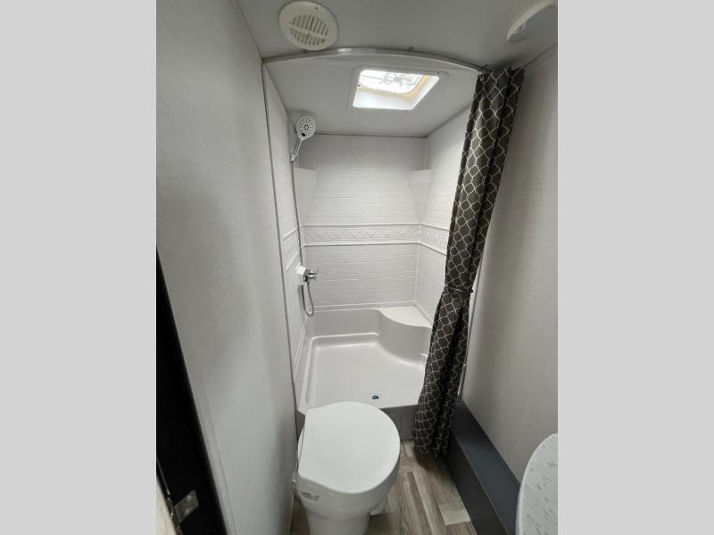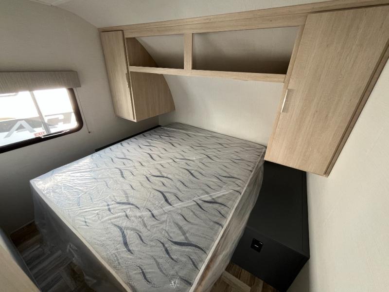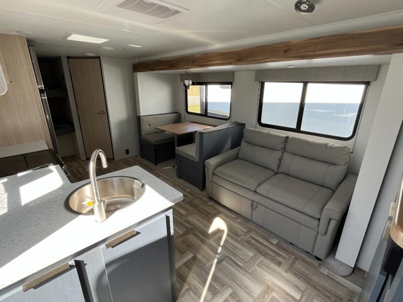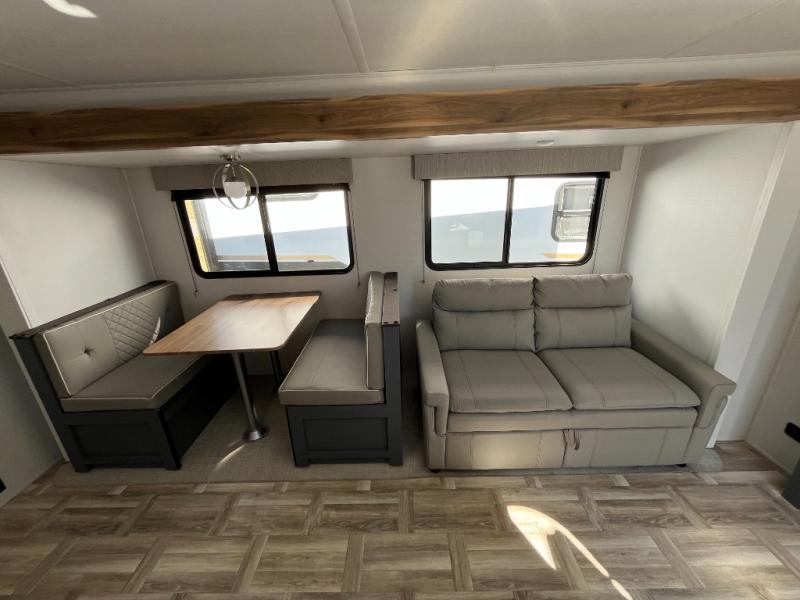 If you are looking for a trailer with double-size bunks and a private bedroom, you have found it! The queen bed and two wardrobes are behind a partial wall for added privacy. The double-size bunks are in the rear corner next to the full bathroom for convenience for the kids or your guests. And the L-shaped counter with a kitchen sink and full amenities sets up the cook nicely to be able to make meals for everyone. And you will love the extra floor space created by the booth dinette and sofa slide out.