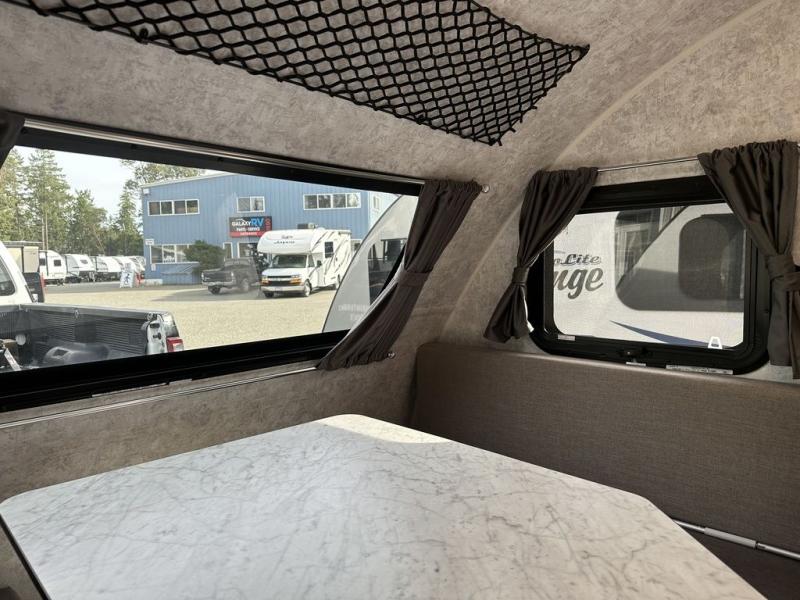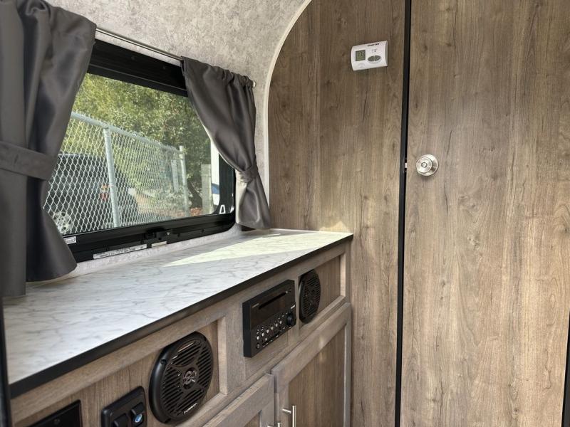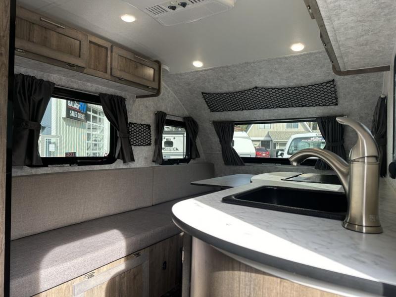 You will appreciate having a shower and cassette toilet in your trailer after hiking all day. You can return to get cleaned up, make a warm meal on the stove, and dine at the dinette that becomes a 54" x 74" bed at night. Someone might even sleep on the sofa. Other features that allow you to stay in comfort include a fridge, a 20,000 BTU heater, a water heater, and a front window for beautiful views and privacy when you close the curtain. And your SUV or van with 1,500 lbs. of towing capacity can be your tow vehicle. Be sure to take a look at the options, such as adding an air conditioner, an exterior shower, and a radio.