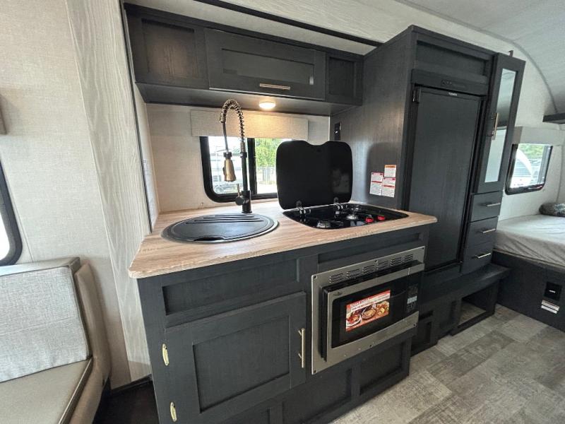 The Forest River R-Pod is known for its innovative construction and durable design. Each model features Azdel composite panels for water resistance, Carefree flooring for easy clean-up, and an interior height of 6'6" for spacious comfort. Modern touches like shaker-style cabinetry, seamless countertops, LED lighting, and decorative window treatments add a residential feel.