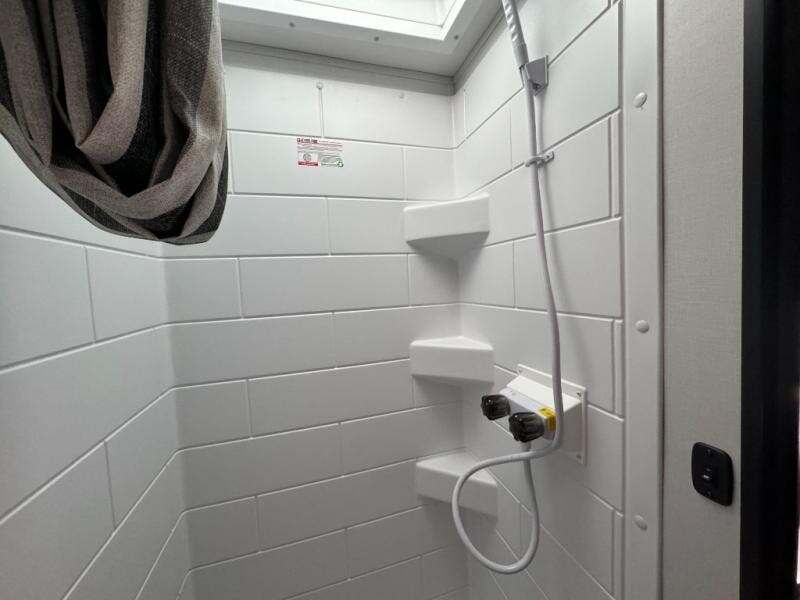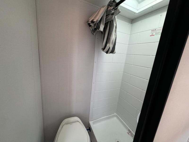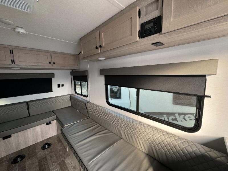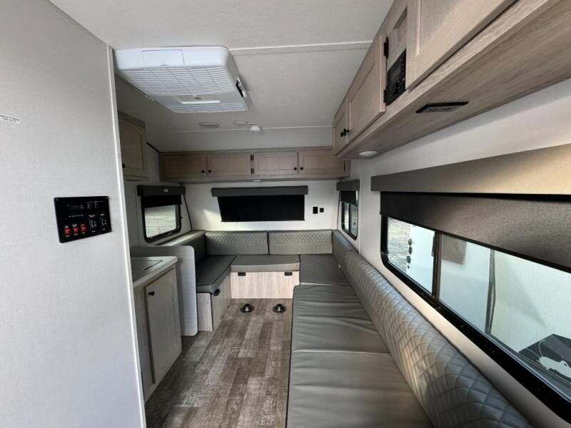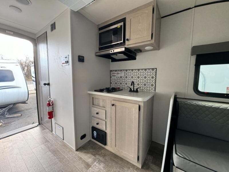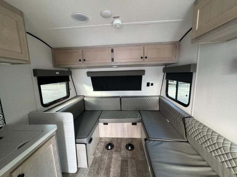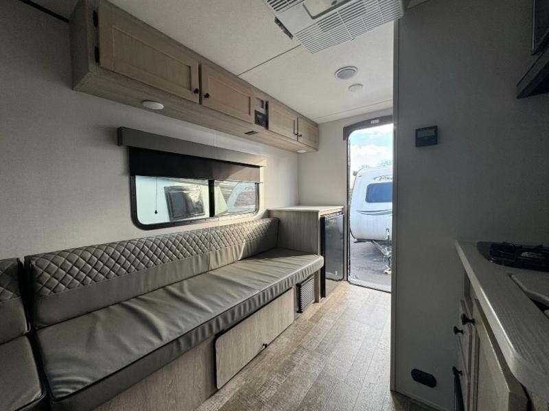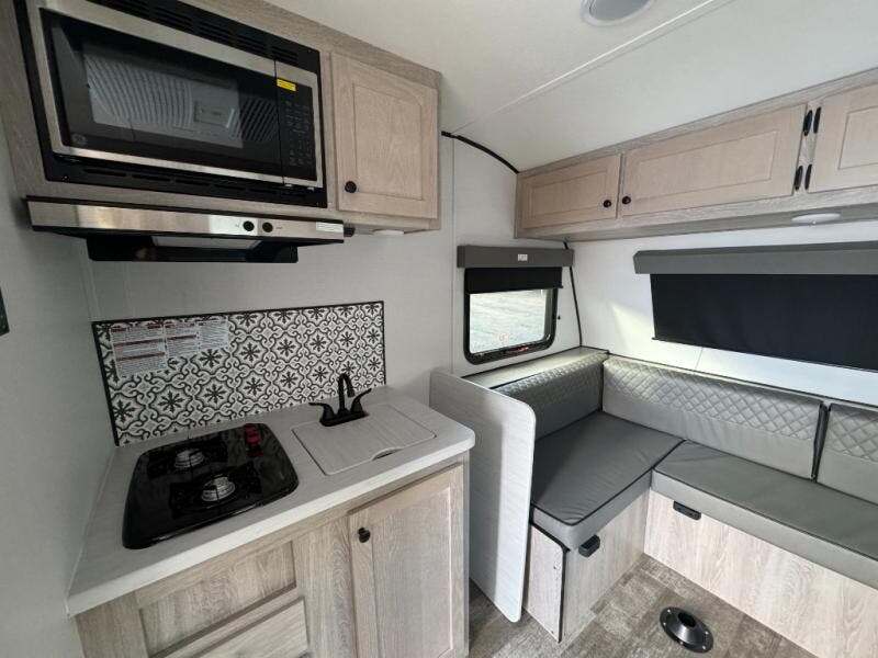 This lightweight travel trailer has everything you need for weekends at the lake. Set up the 6' patio awning and enjoy a drink before heading off on a trail. You'll find the private toilet and shower will allow you to clean up after your adventure, and the front 60" x 76" RV queen bed will be perfect for a cat nap. You can whip up dinner in the kitchen area and enjoy your meal seated on the sofa, or you can choose the optional booth dinette in its place.