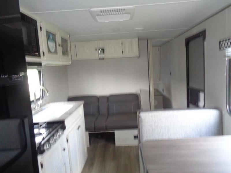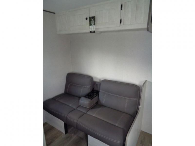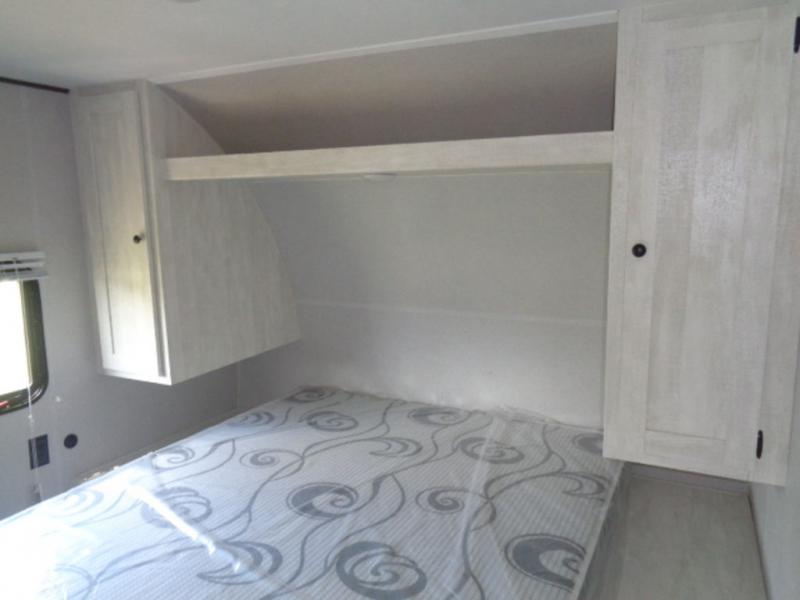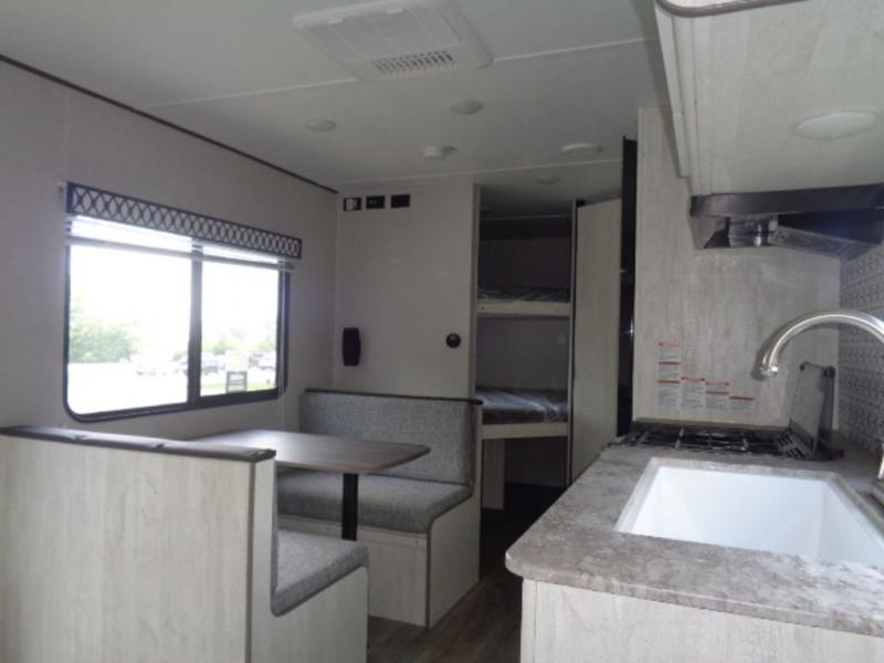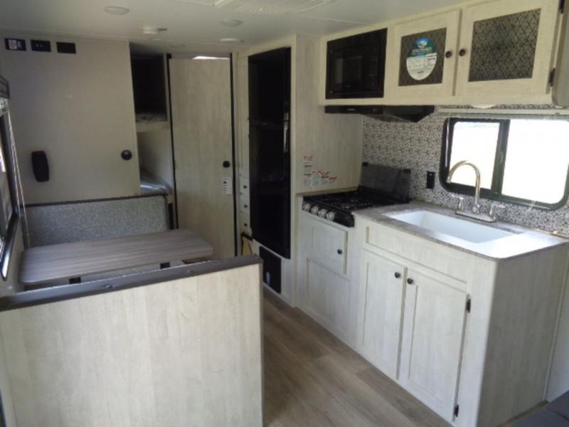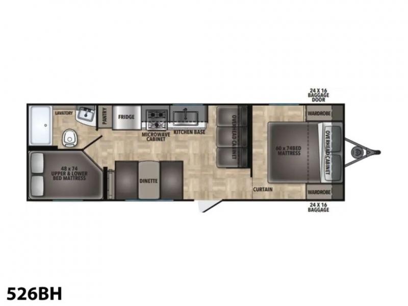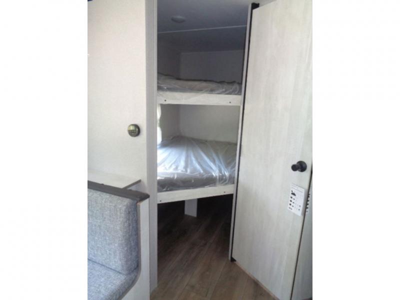 Enjoy camping with family and friends in this Shasta i-5 Edition bunk model sleeping six or more if using the sofa as well as the front bed and rear bunks. There are double-size bunks in the rear roadside corner and a full bath with shower, vanity, and toilet in the opposite rear corner. There is also a medicine cabinet for your personal items like razors and toothbrushes. The kitchen is fully equipped for your camping trips featuring a three burner cooktop with glass cover, an overhead microwave oven, a large sink, plenty of overhead cabinet space as well as storage cabinets and drawers below. You will also love the pantry for all of your canned goods and snacks. In the front of this unit, a semi-private bedroom with a curtain provides a quiet retreat from the rest of the unit, and there are dual wardrobes to keep your clothes tidy. Outside, enjoy 24" x 16" baggage doors for easy access to all of your outdoor camping gear, an awning for outdoor living space protected from the elements, and more.