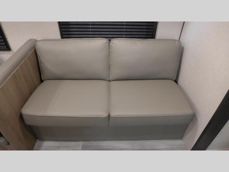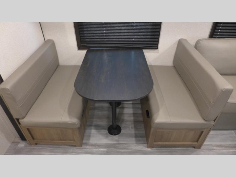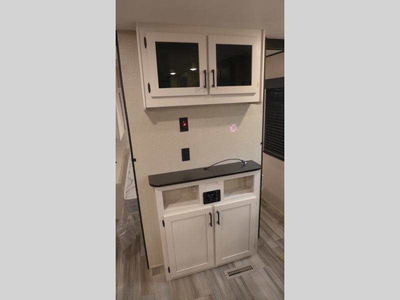 Enjoy camping at local RV spots or even national parks in this dual axle trailer that offers a large slide with a jackknife sofa and booth dinette for more sleeping space and interior room to relax. There is a full bathroom to get cleaned up in with extra counter space for toiletries, and the kitchen provides a three burner range with glass cover, a 17" oven and a pantry to hold all the goodies. You can enter the front bedroom from each side of the entertainment center giving you your own side, and there are dual wardrobes plus a shelf overhead. And don't forget about the 16' power awning with LED lighting, the exterior storage for your outdoor gear and the outside kitchen including a griddle and a refrigerator. You might even like to add a few options, take a look at the list!